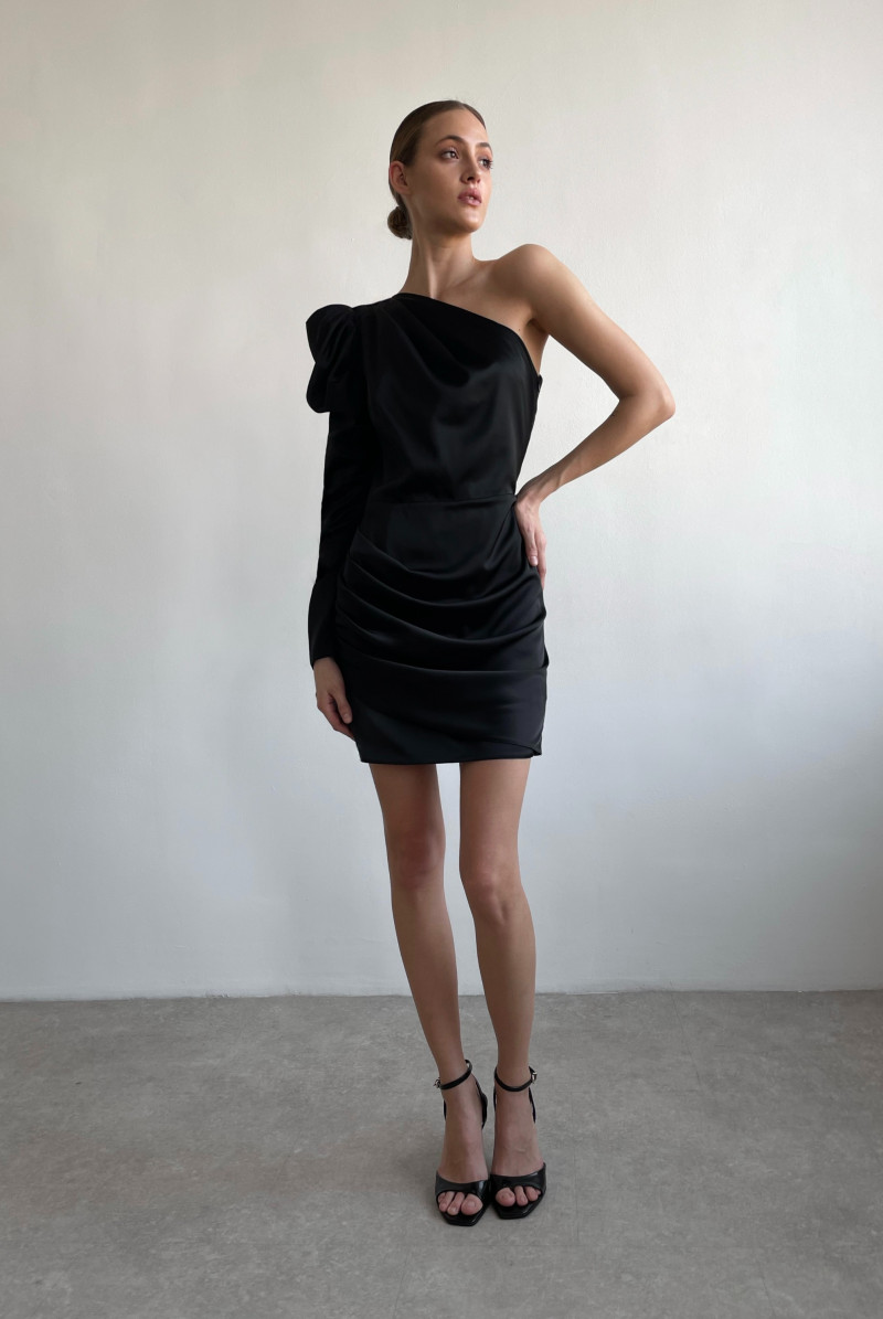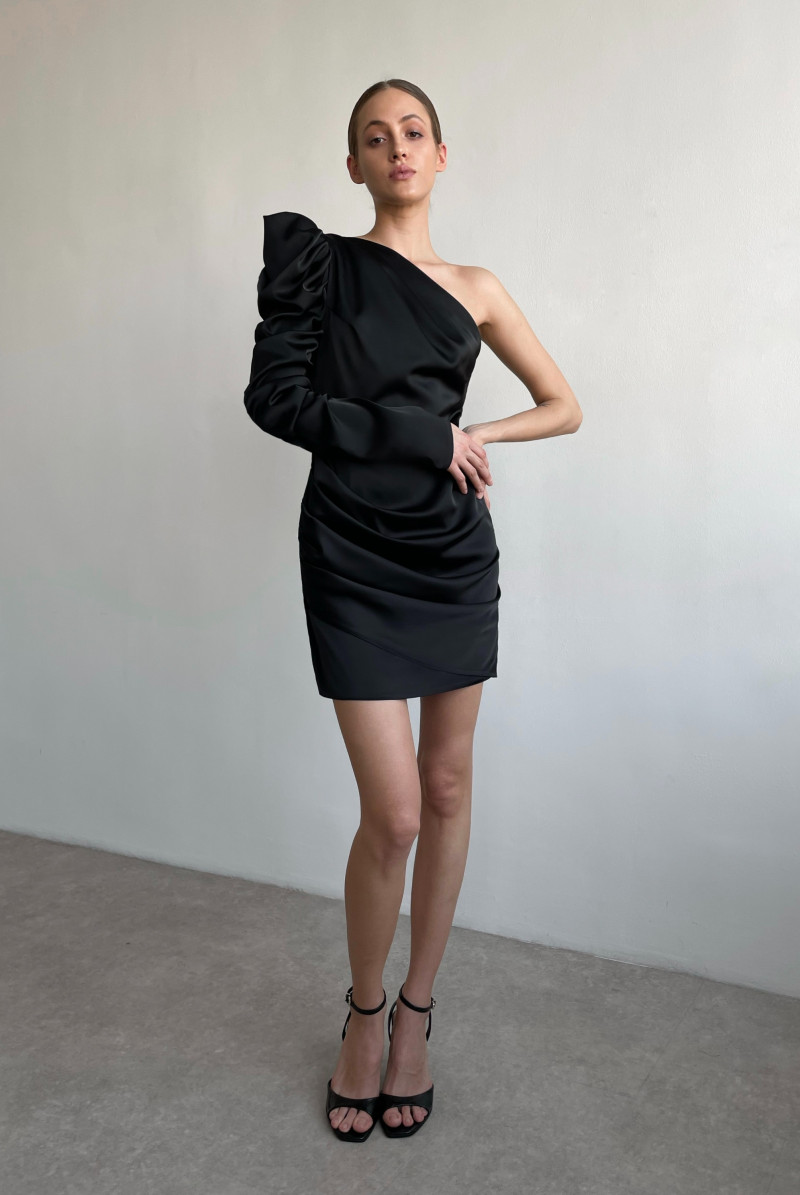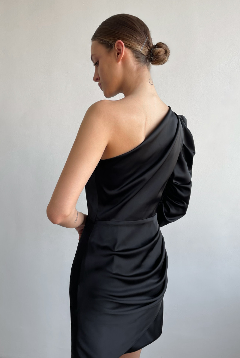 Платье прилегающего силуэта длиной "мини", асимметричного покроя. У платья один рукав с правой стороны, с драпировками, длинный, втачной. Нижняя часть переда и спинки с имитацией на запах с драпировкой в правом боковом шве. В левом боковом шве - потайная застежка молния.
