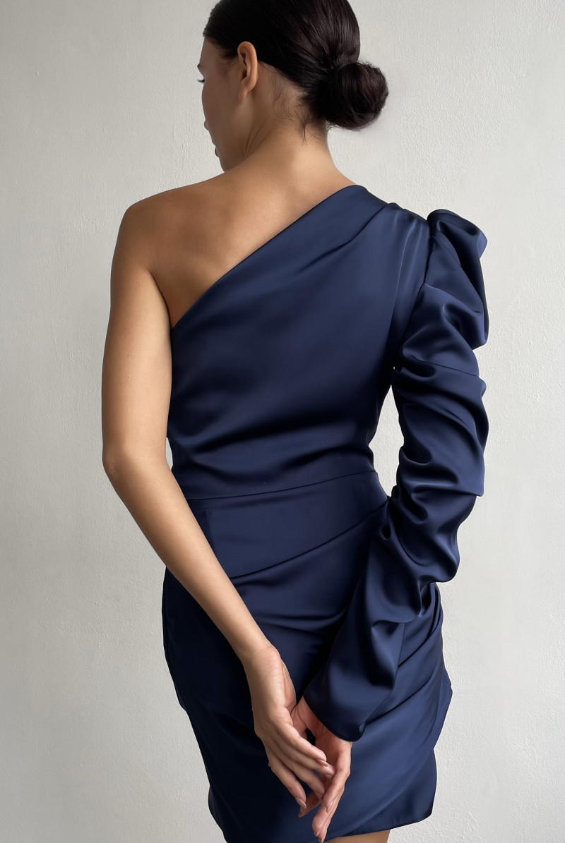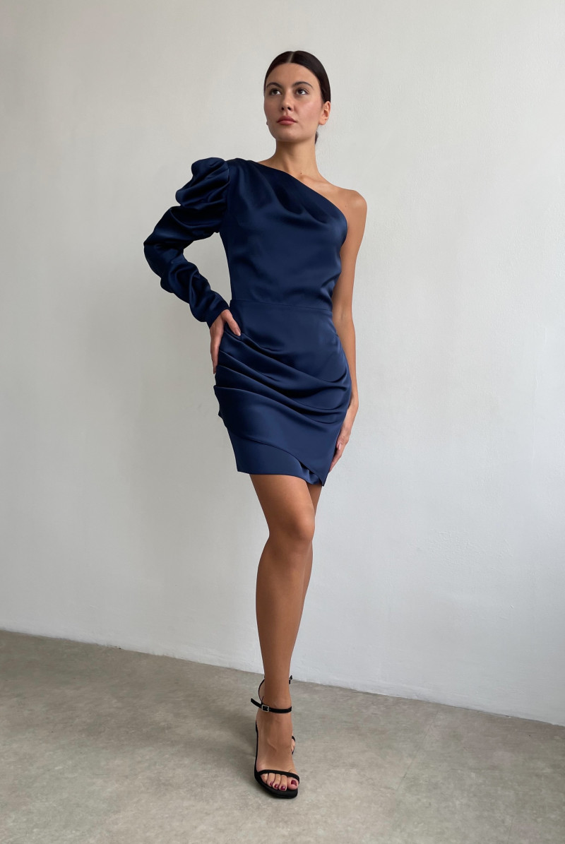 Платье прилегающего силуэта длиной "мини", асимметричного покроя. У платья один рукав с правой стороны, с драпировками, длинный, втачной. Нижняя часть переда и спинки с имитацией на запах с драпировкой в правом боковом шве. В левом боковом шве - потайная застежка молния.