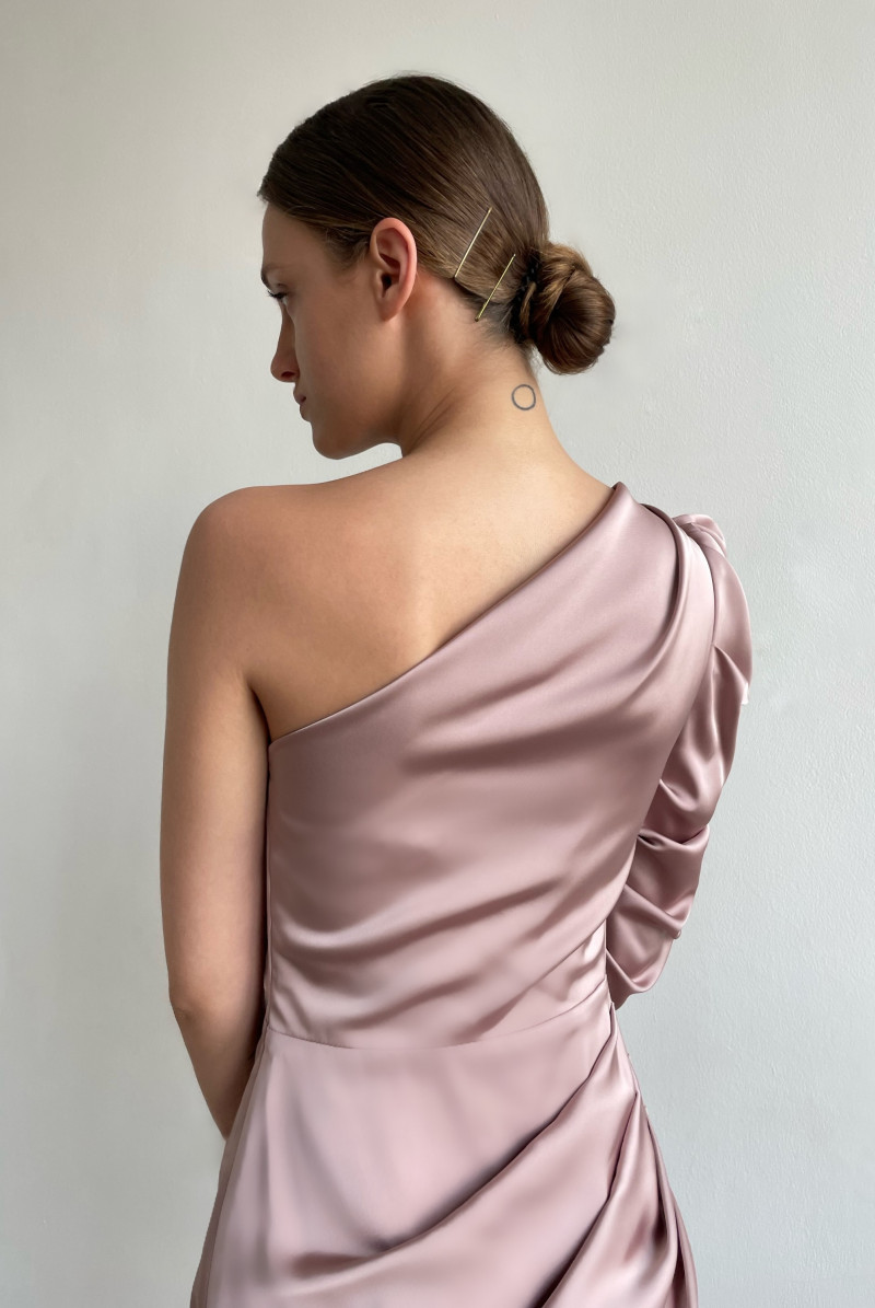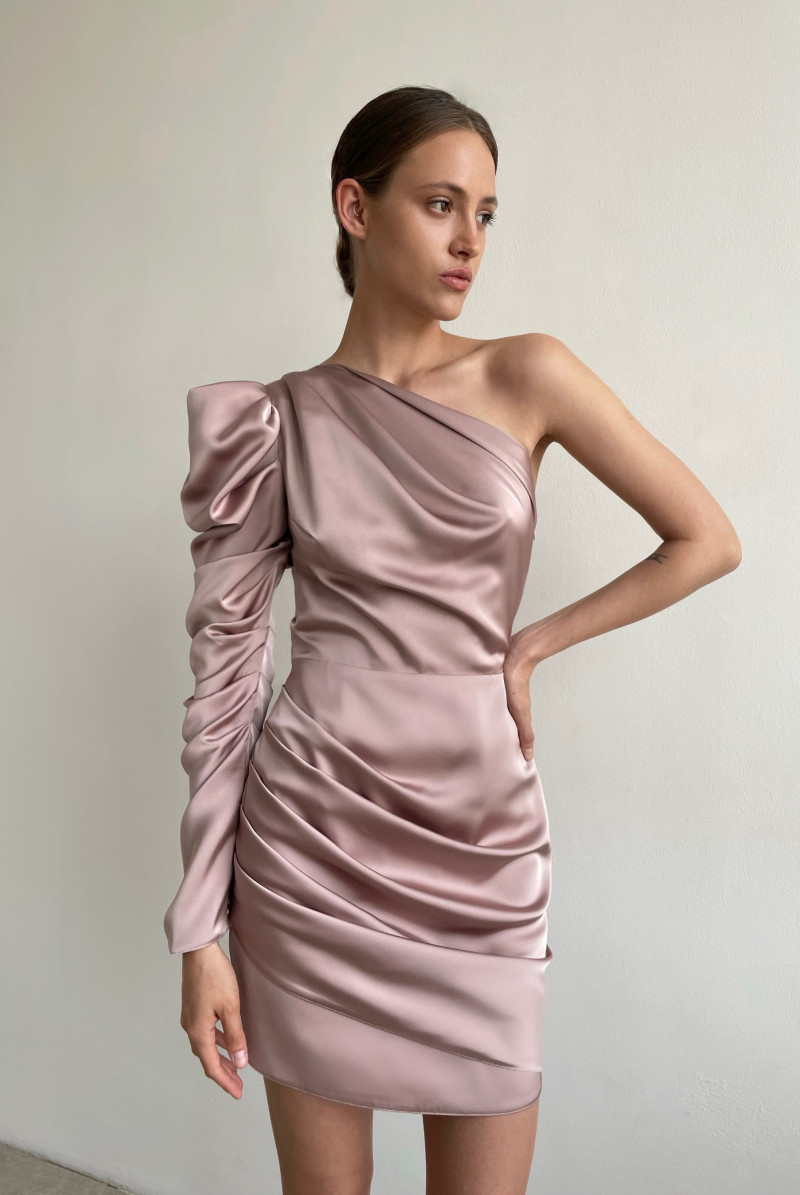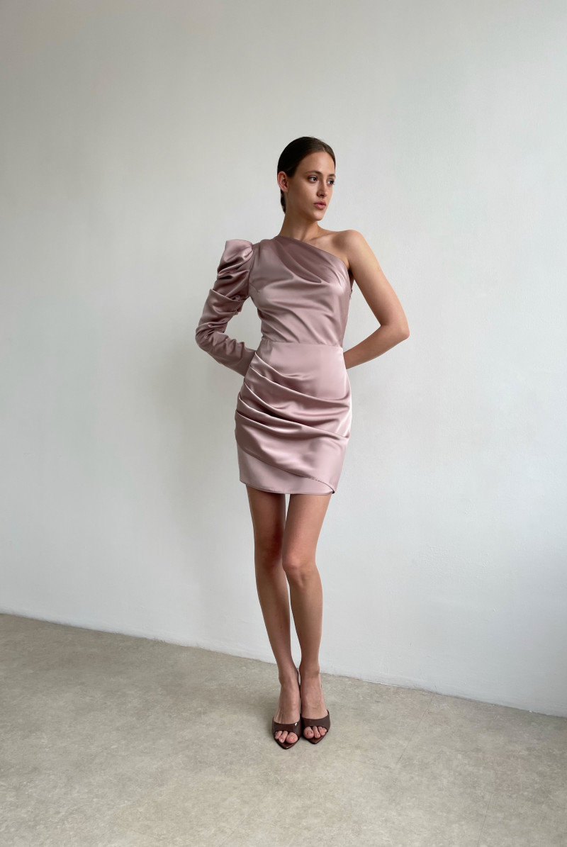 Платье прилегающего силуэта длиной "мини", асимметричного покроя. У платья один рукав с правой стороны, с драпировками, длинный, втачной. Нижняя часть переда и спинки с имитацией на запах с драпировкой в правом боковом шве. В левом боковом шве - потайная застежка молния.