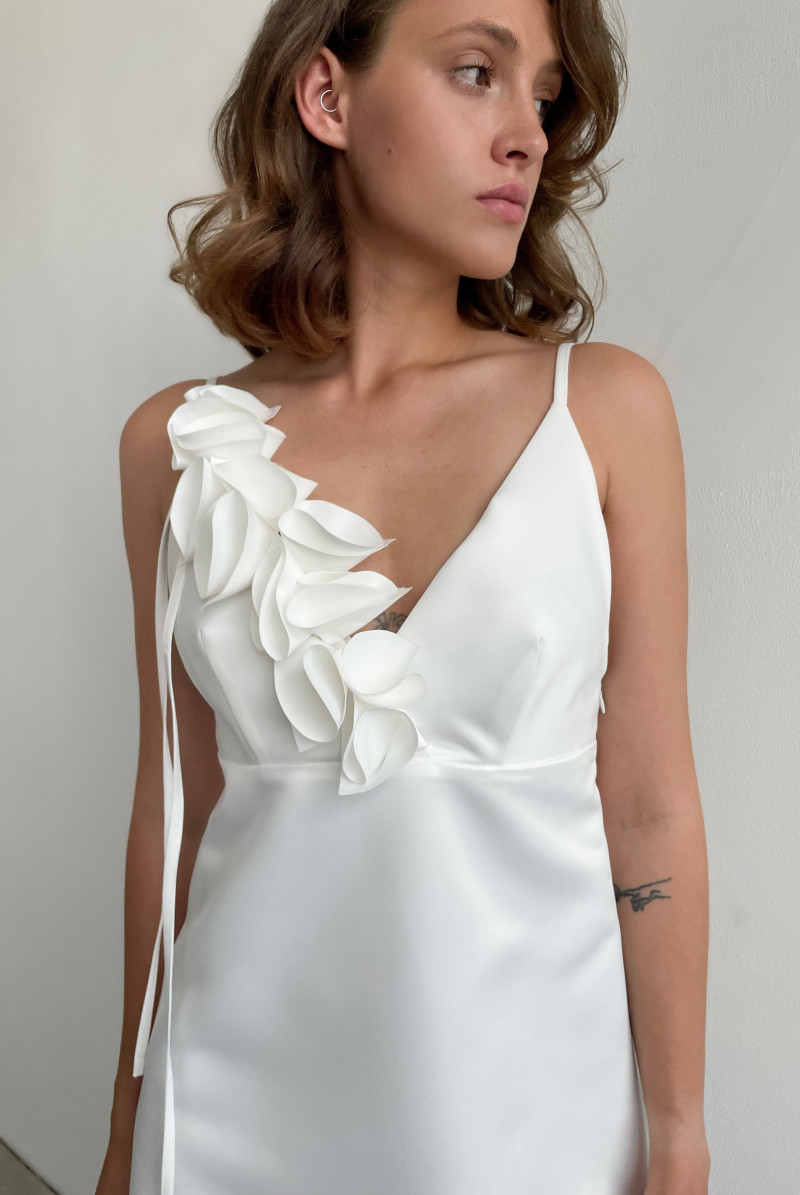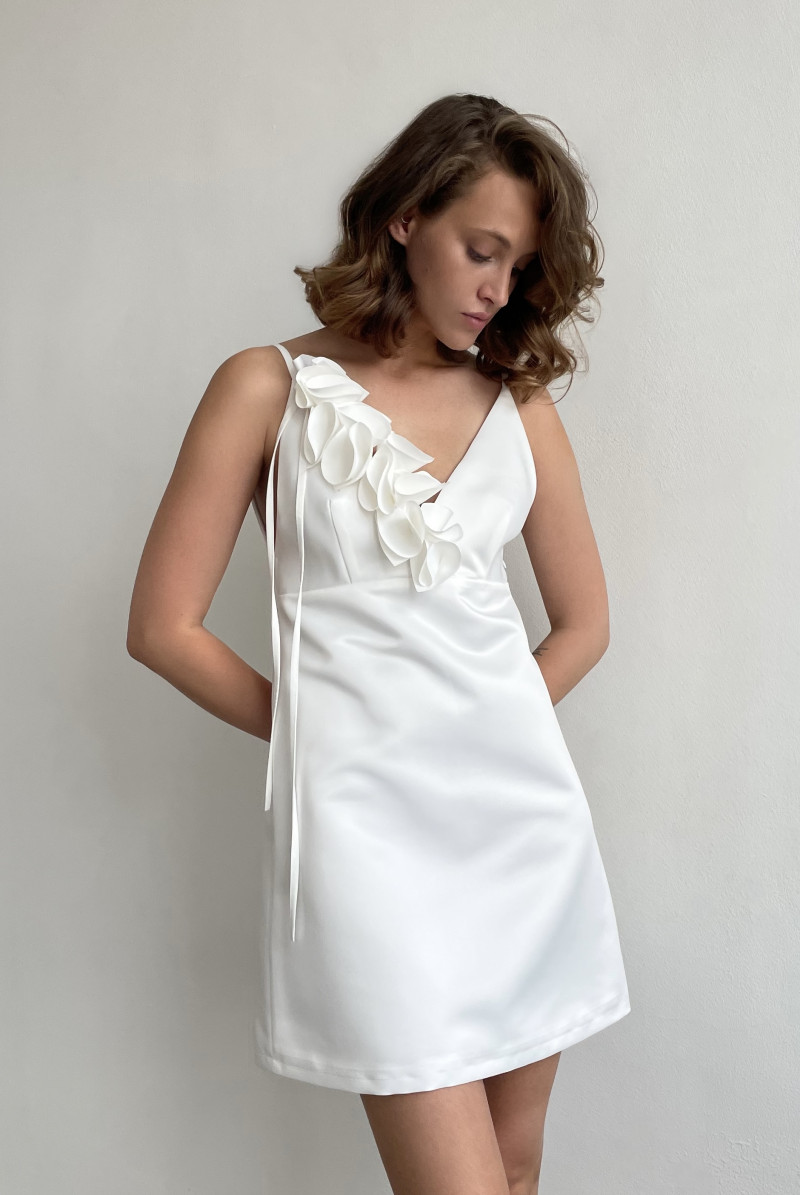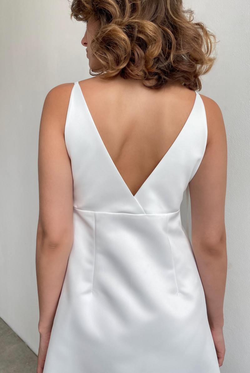 Платье "А"-силуэта длиной "мини". Лиф платья отрезной на узких нерегулируемых бретелях. Вырез горловины глубокий V-образный. В левом боковом шве платья потайная застёжка-молния.