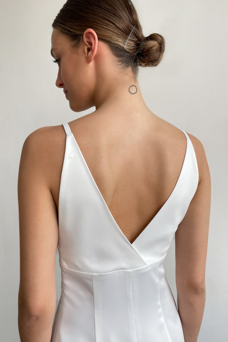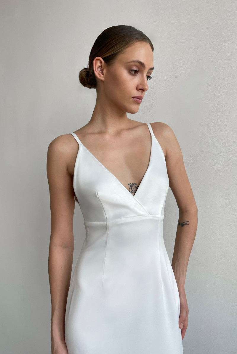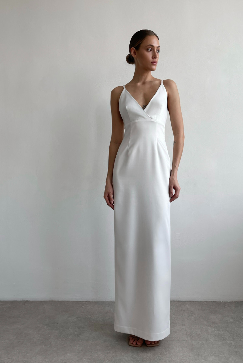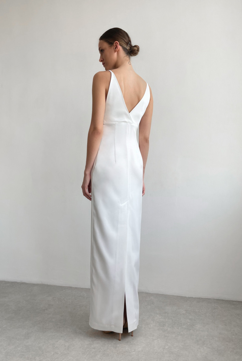 Платье прилегающего силуэта длиной "макси". Лиф платья отрезной на узких нерегулируемых бретелях. Вырез горловины глубокий V-образный. В левом боковом шве потайная застёжка молния. Сзади - высокая шлица. Платье выполнено на подкладе.