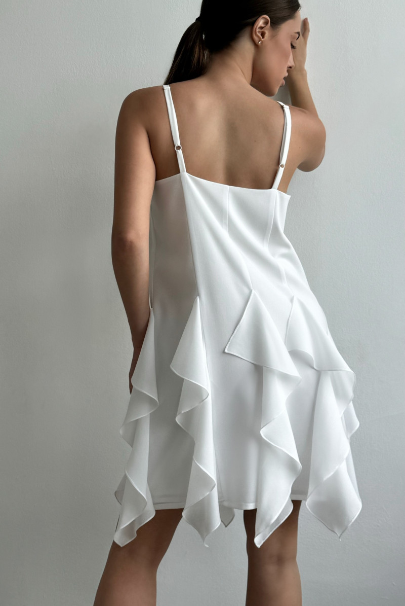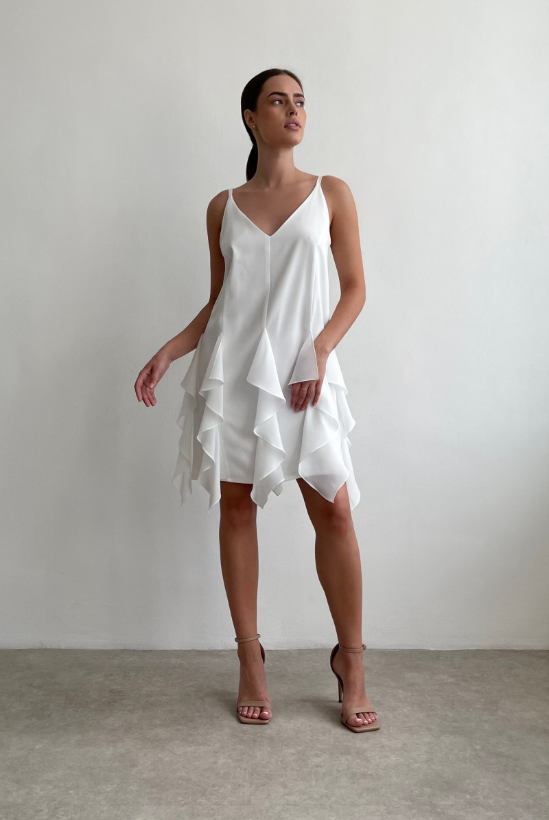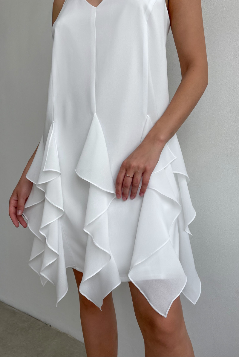 Платье-комбинация с регулироемой длиной бретелей в длине мини, из легкой ткани на подкладе. В рельефные швы, швы по центру переда и спинки, боковые швы втачены воланы. Вырез горловины спереди "V"-образный.