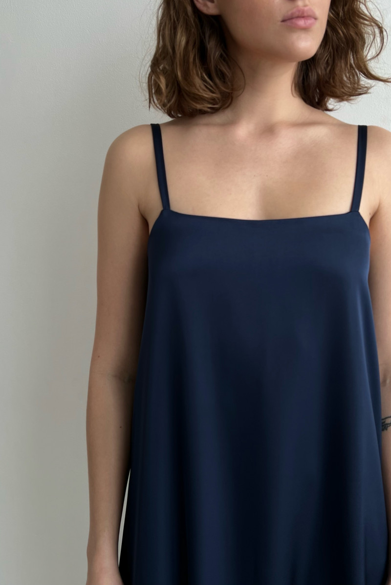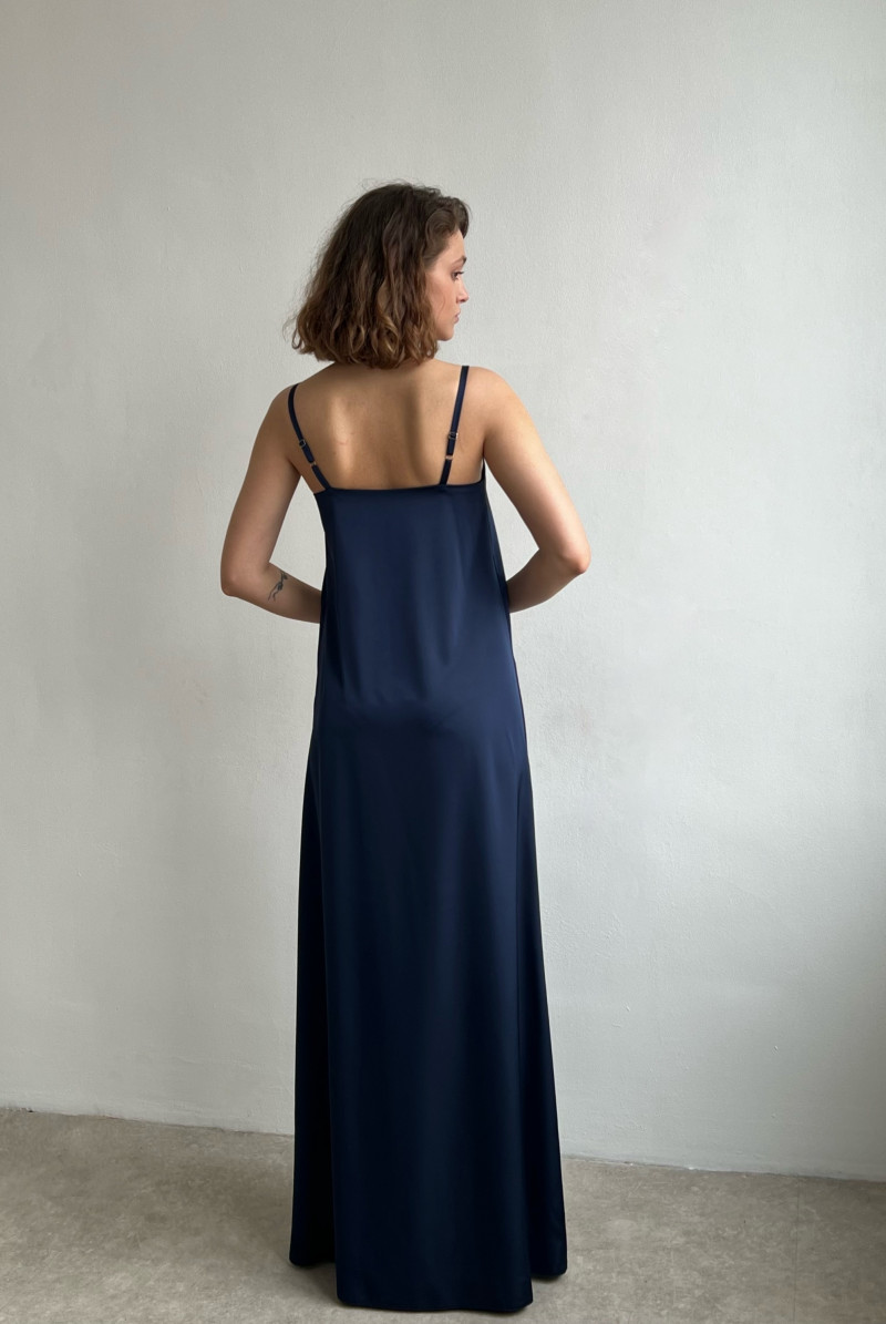 Платье в бельевом стиле, расклешенное к низу, длиной "макси". На тонких регулируемых бретелях.