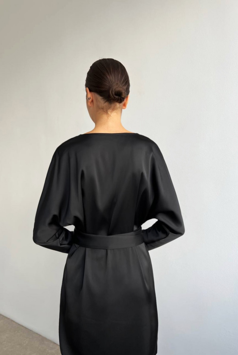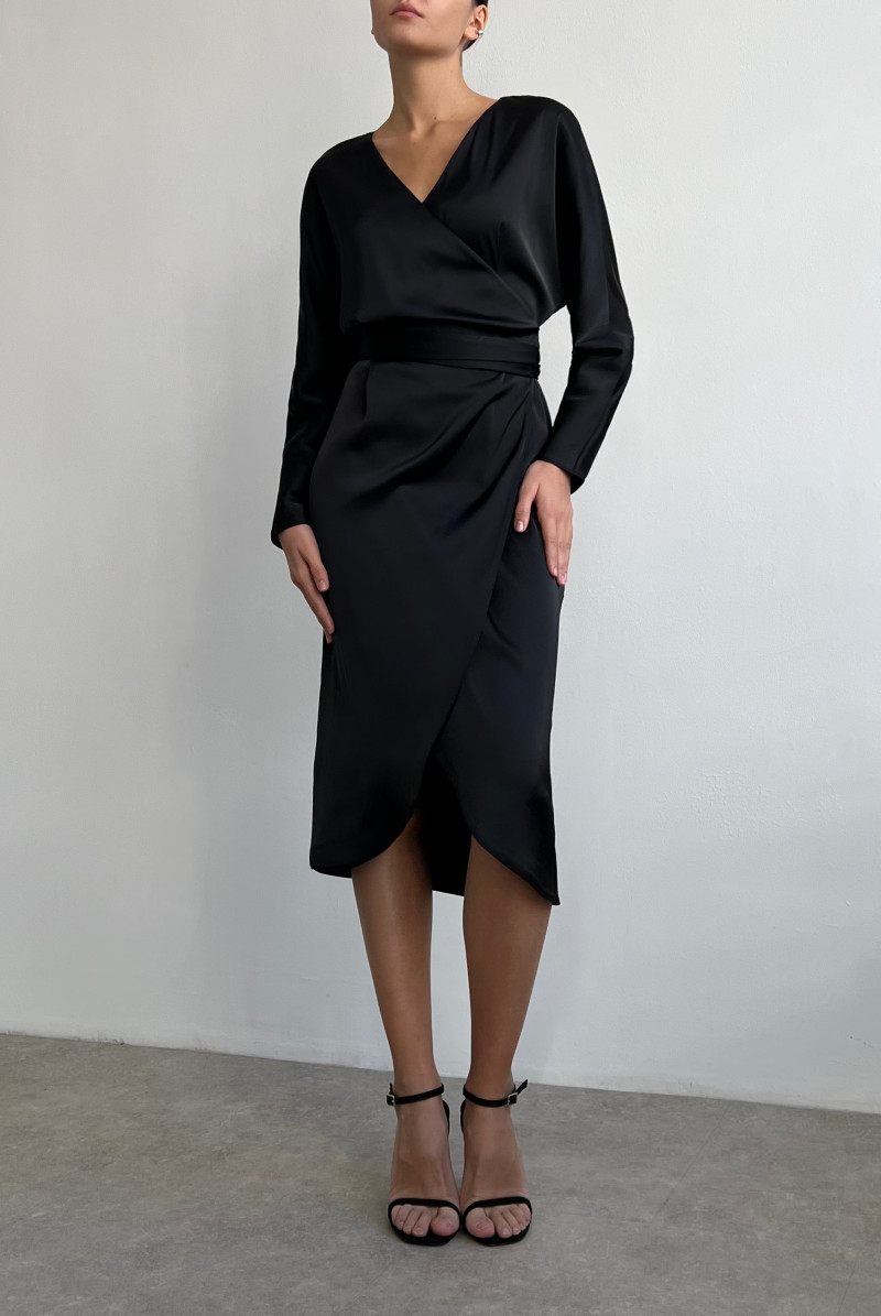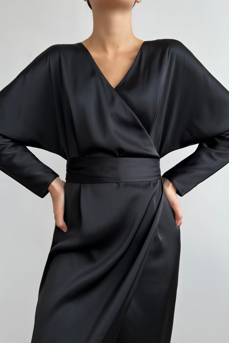Платье длины миди "на запах" с притачным поясом по талии. Рукав "летучая мышь", зауженный к низу.