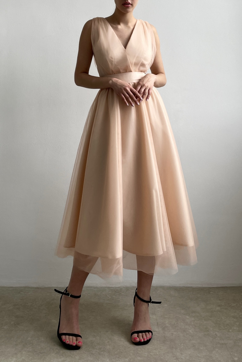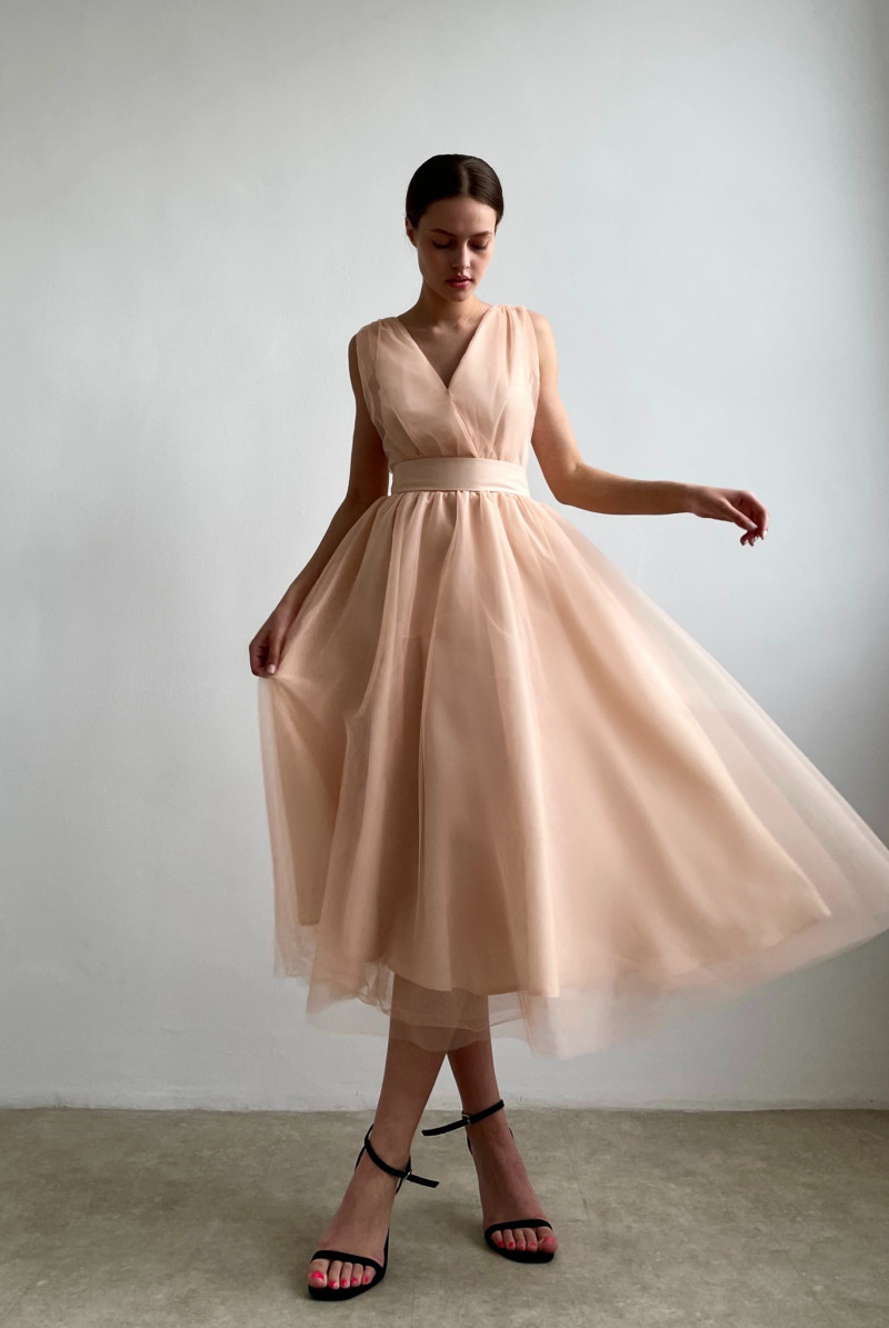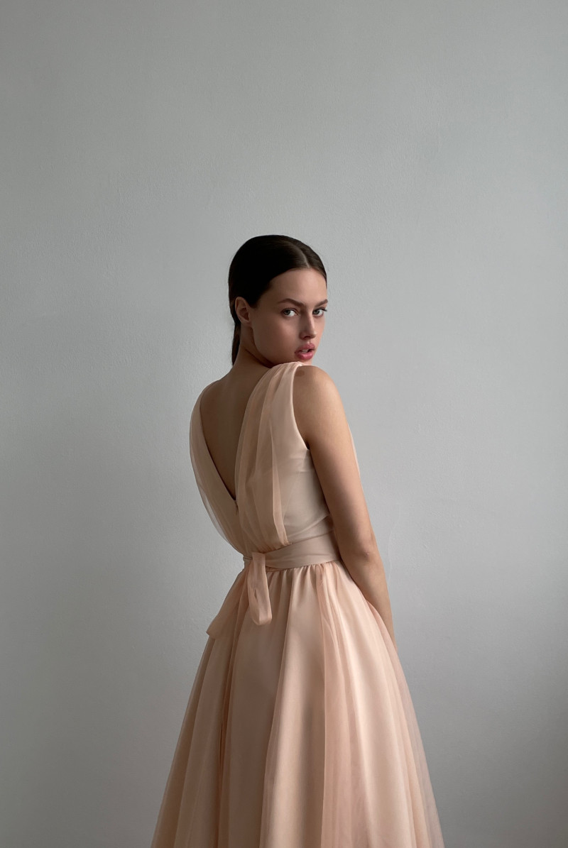 Платье из фатина, отрезное по линии талии, с глубоким вырезом на запах и V-образным вырезом на спинке. С застежкой на потайную молнию по центру спинки, со съёмным поясом.