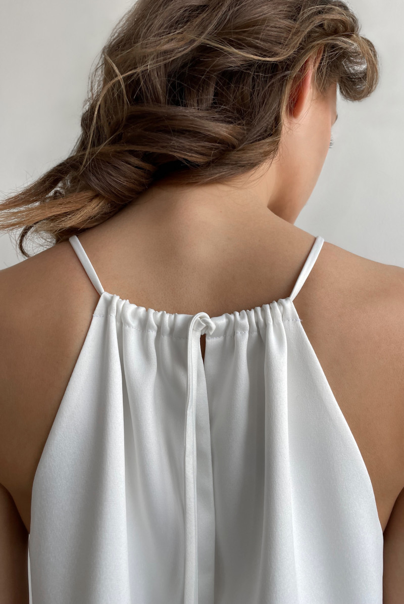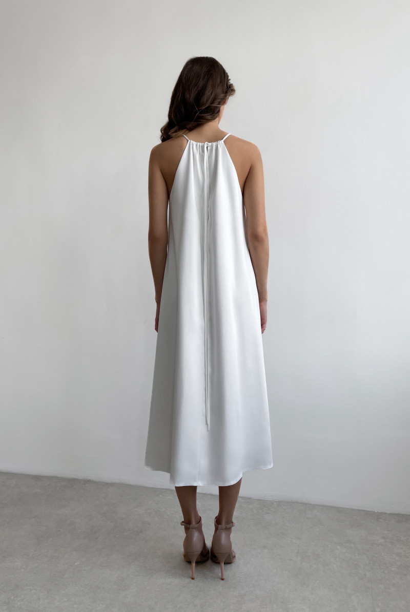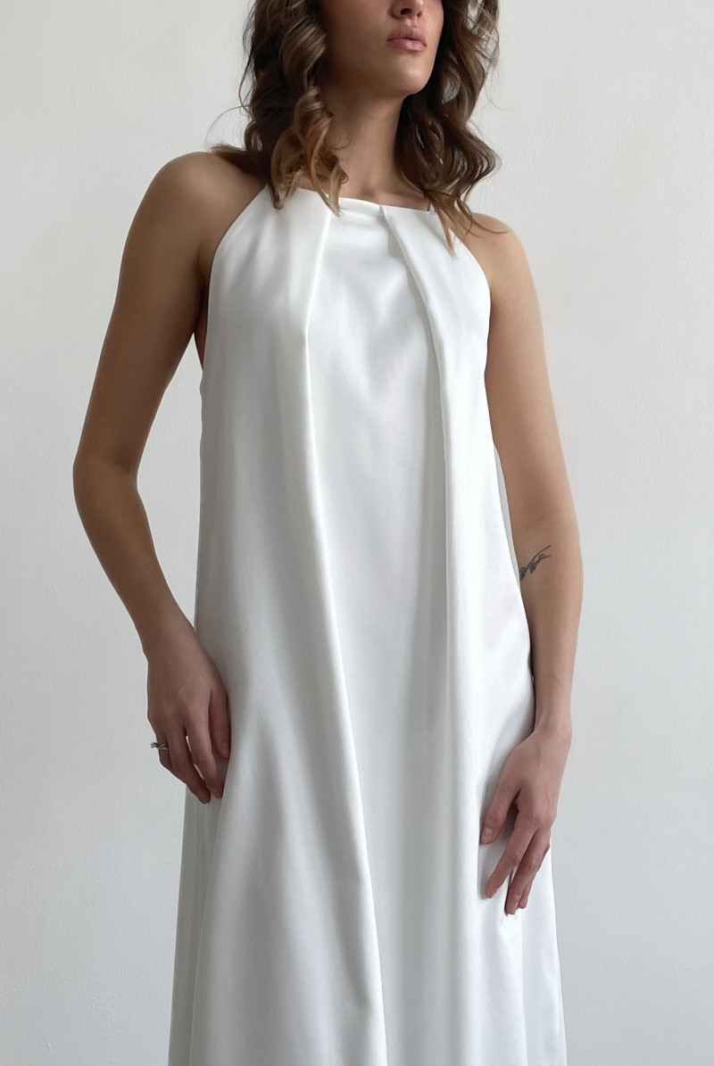 Платье А-силуэта длиной миди с американской проймой. Спереди - 2 глубокие встречные складки, сзади - глубокий каплевидный вырез и длинные завязки.