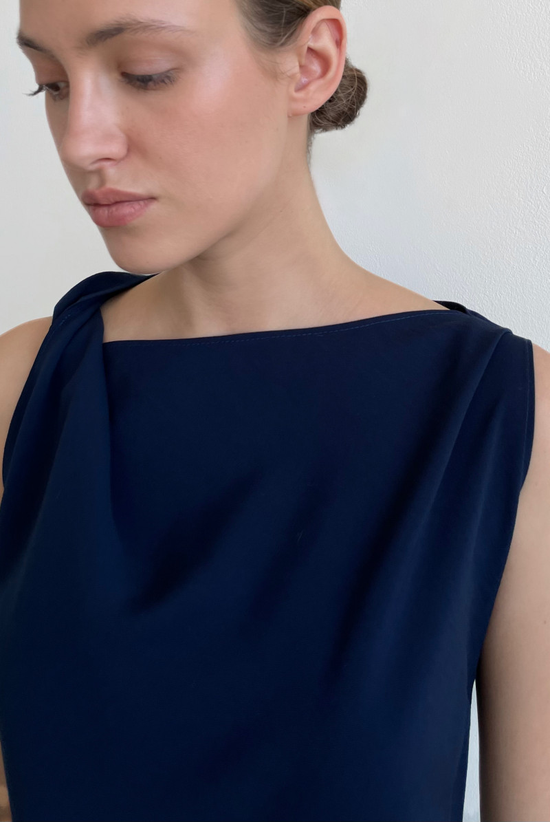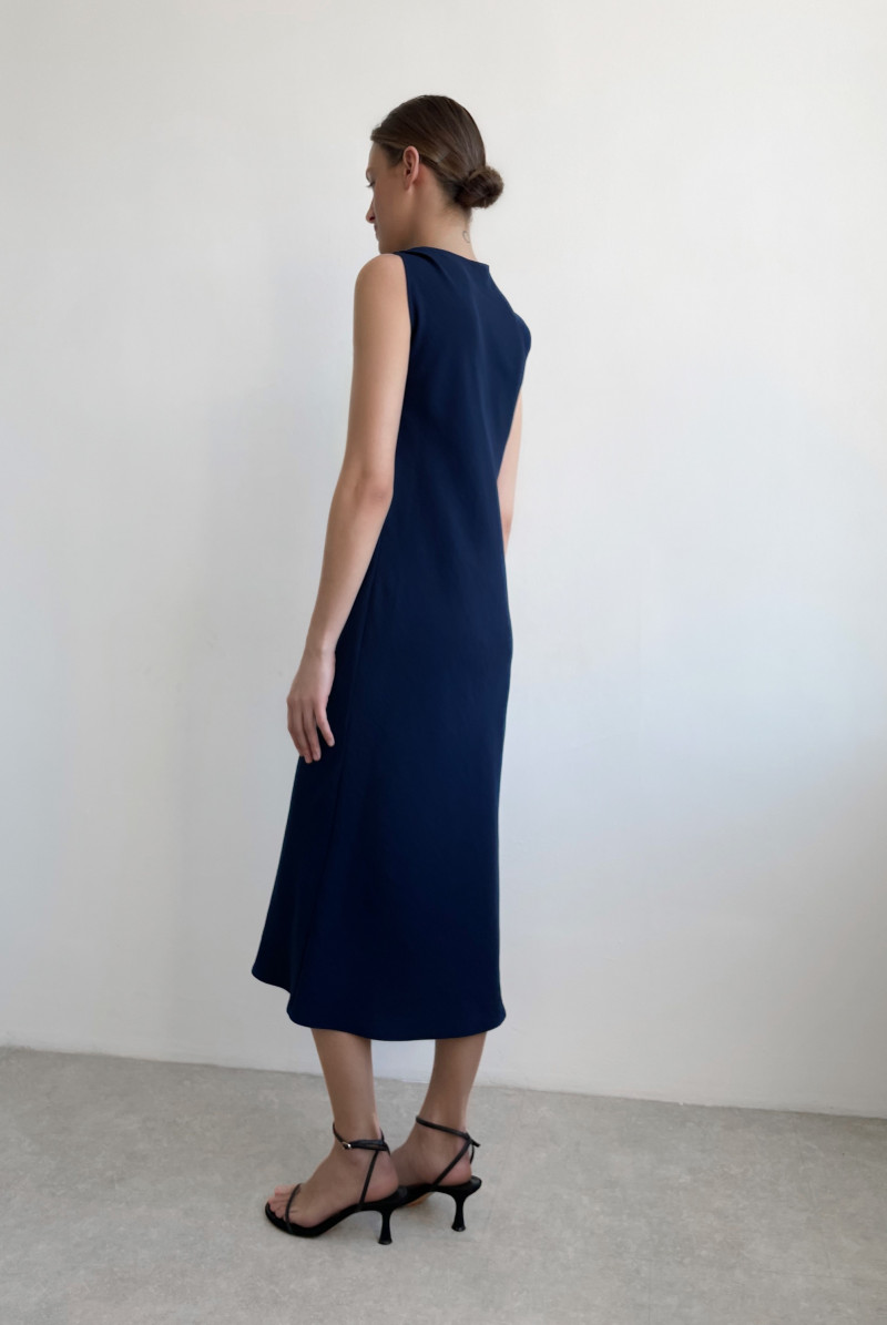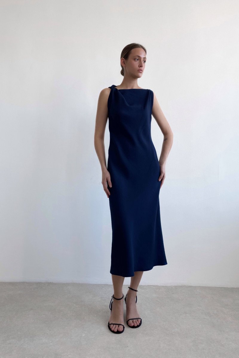 Платье полуприлегающего силуэта, длиной миди, косого кроя. На правом плече - перекрученная драпировка, создающая ассиметричную линию декольте, на левом плече - защип.