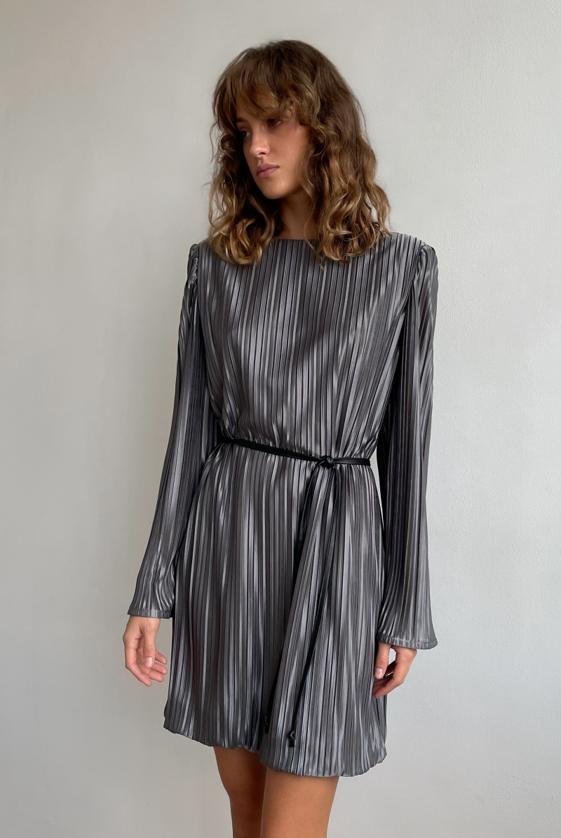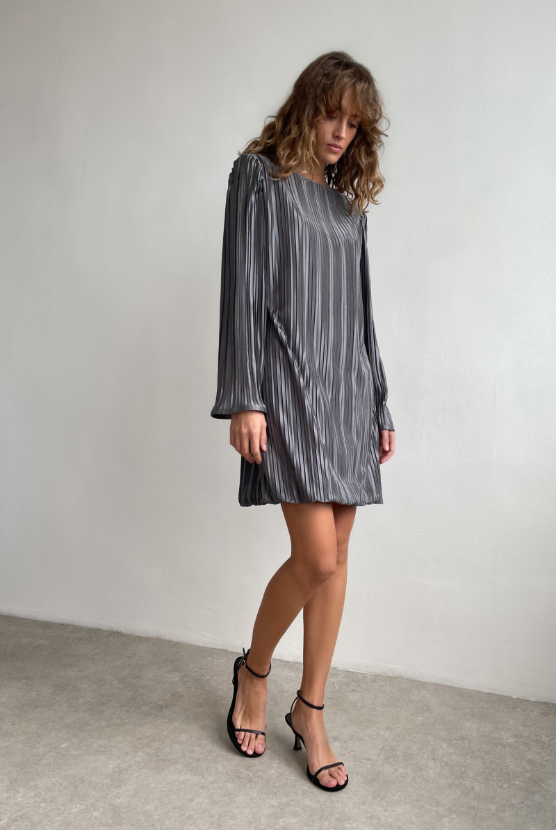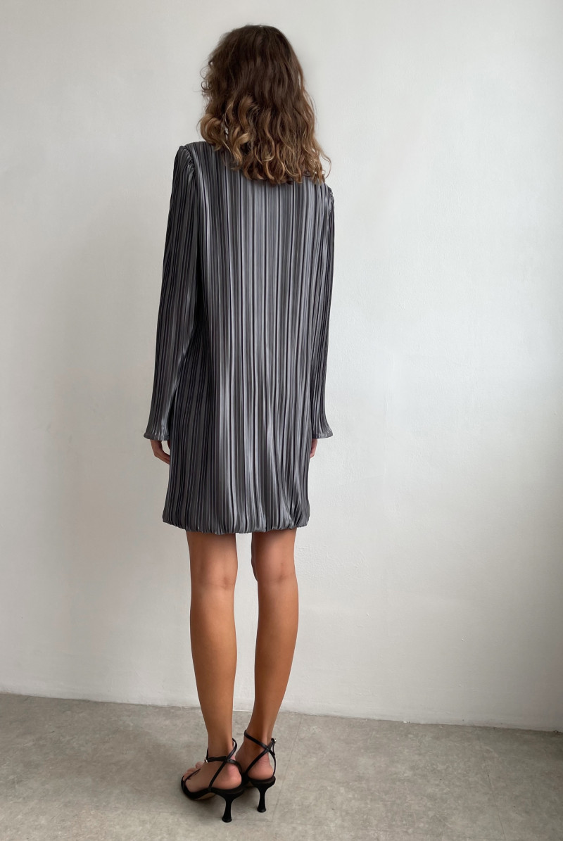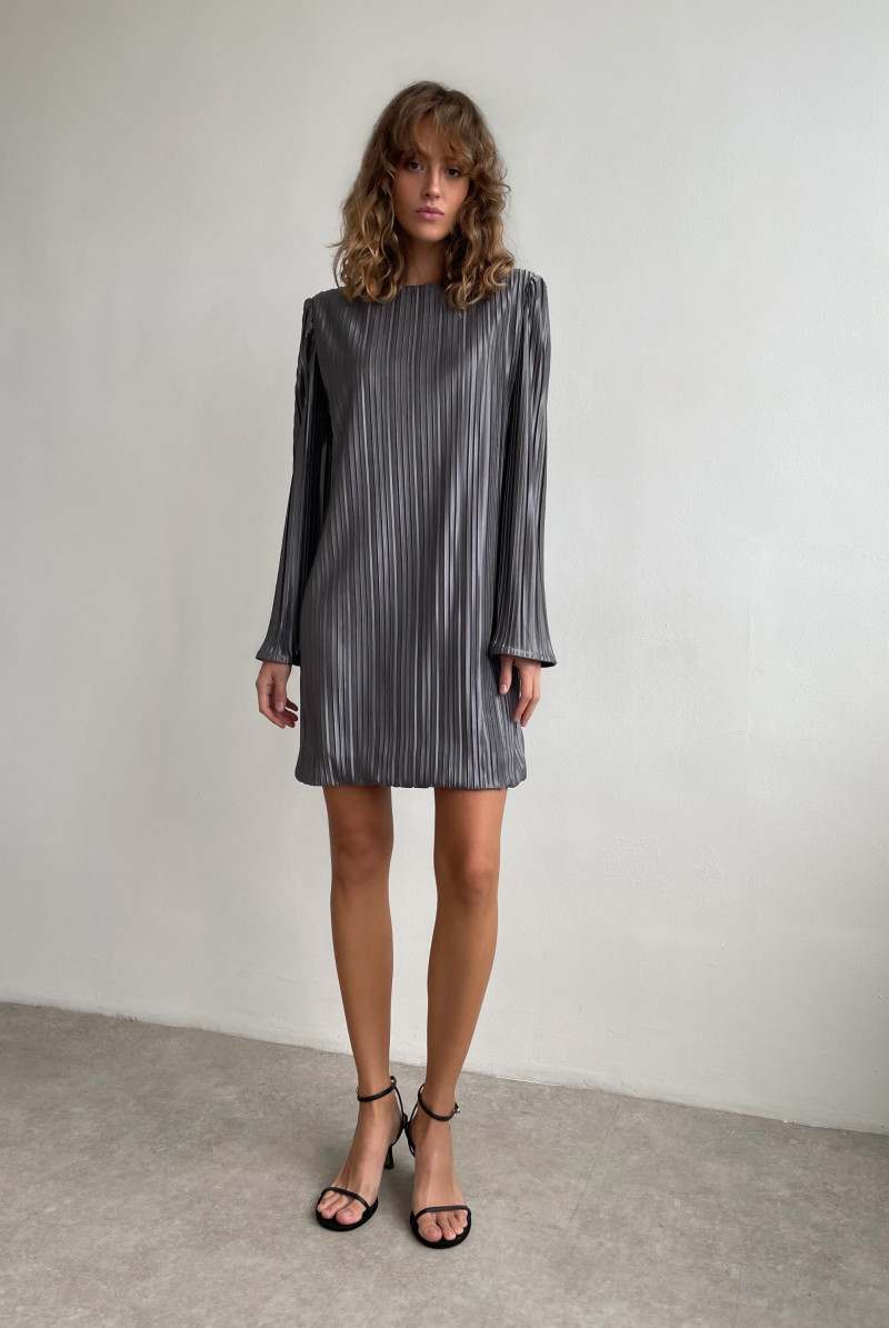 Платье "мини" прямого силуэта из ткани "плиссе". Вырез горловины "лодочка". Рукав втачной, длинный. Платье выполнено на подкладе.