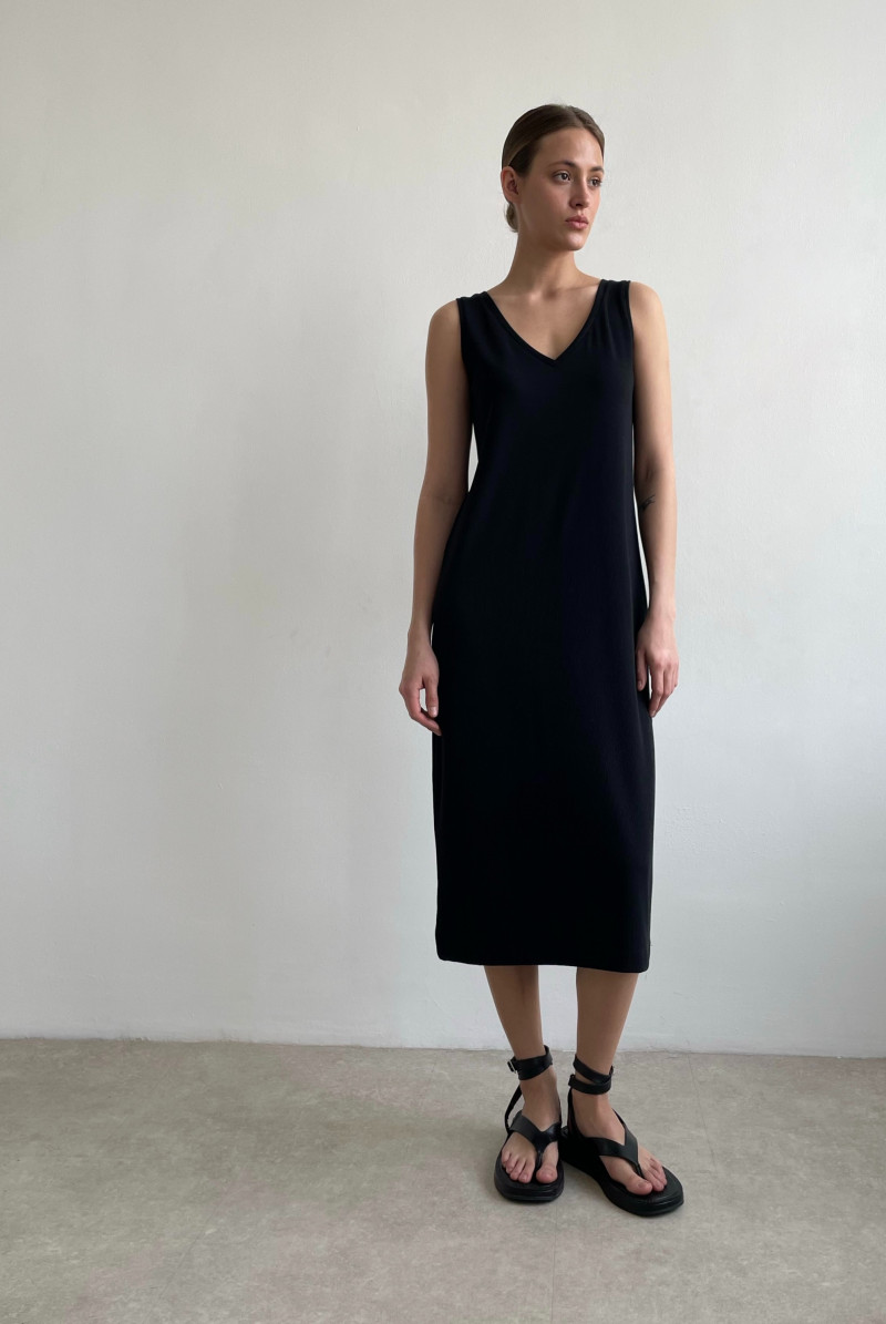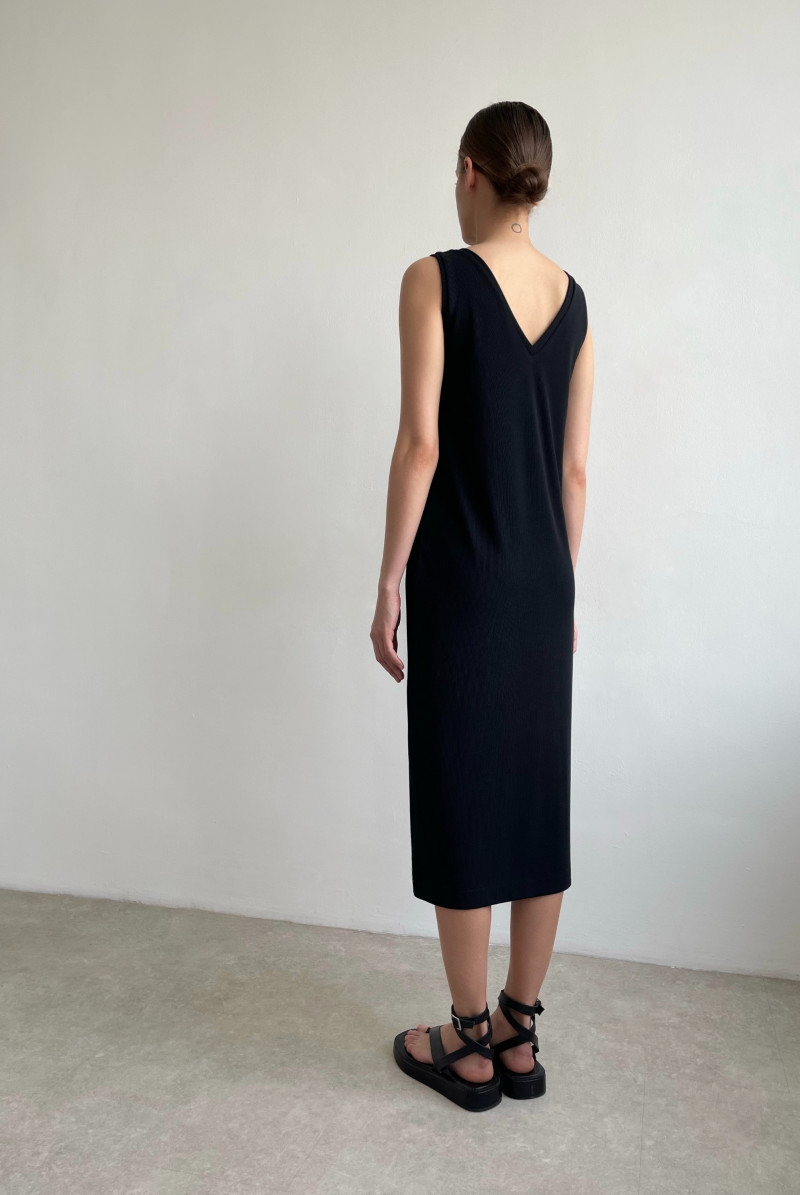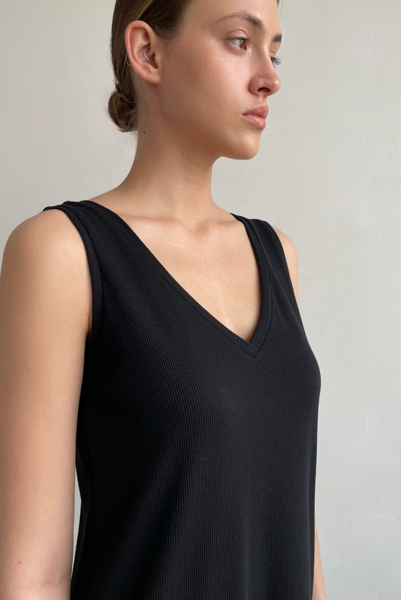 Платье-майка из трикотажа полуприлегающего силуэта. Вырез горловины V-образный с обтачкой.