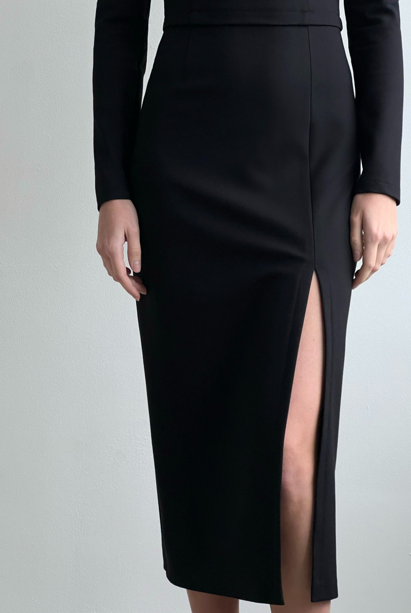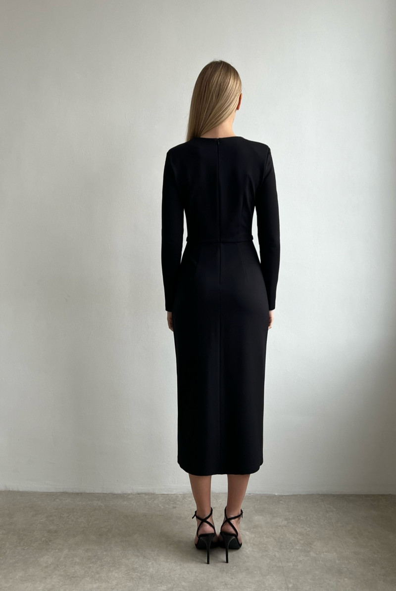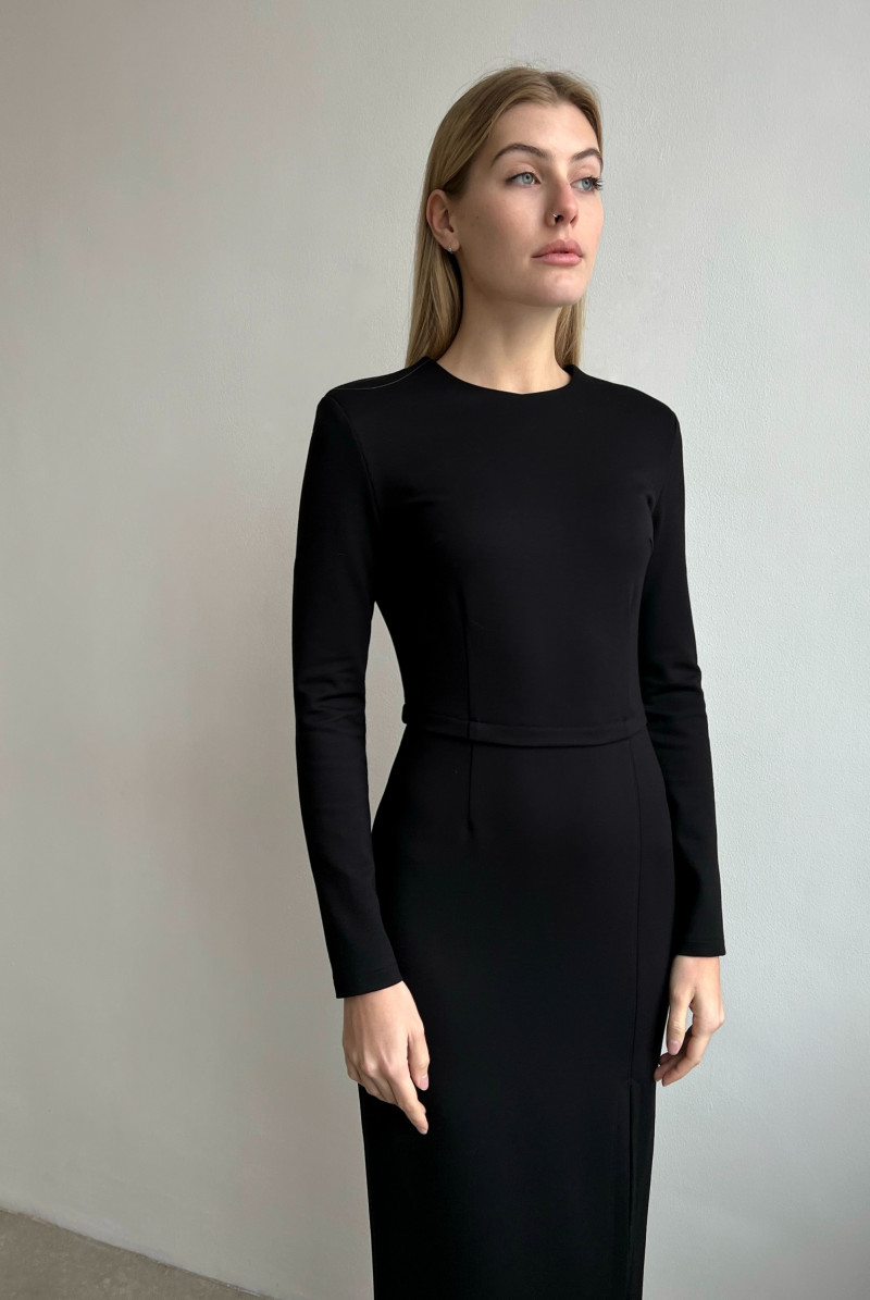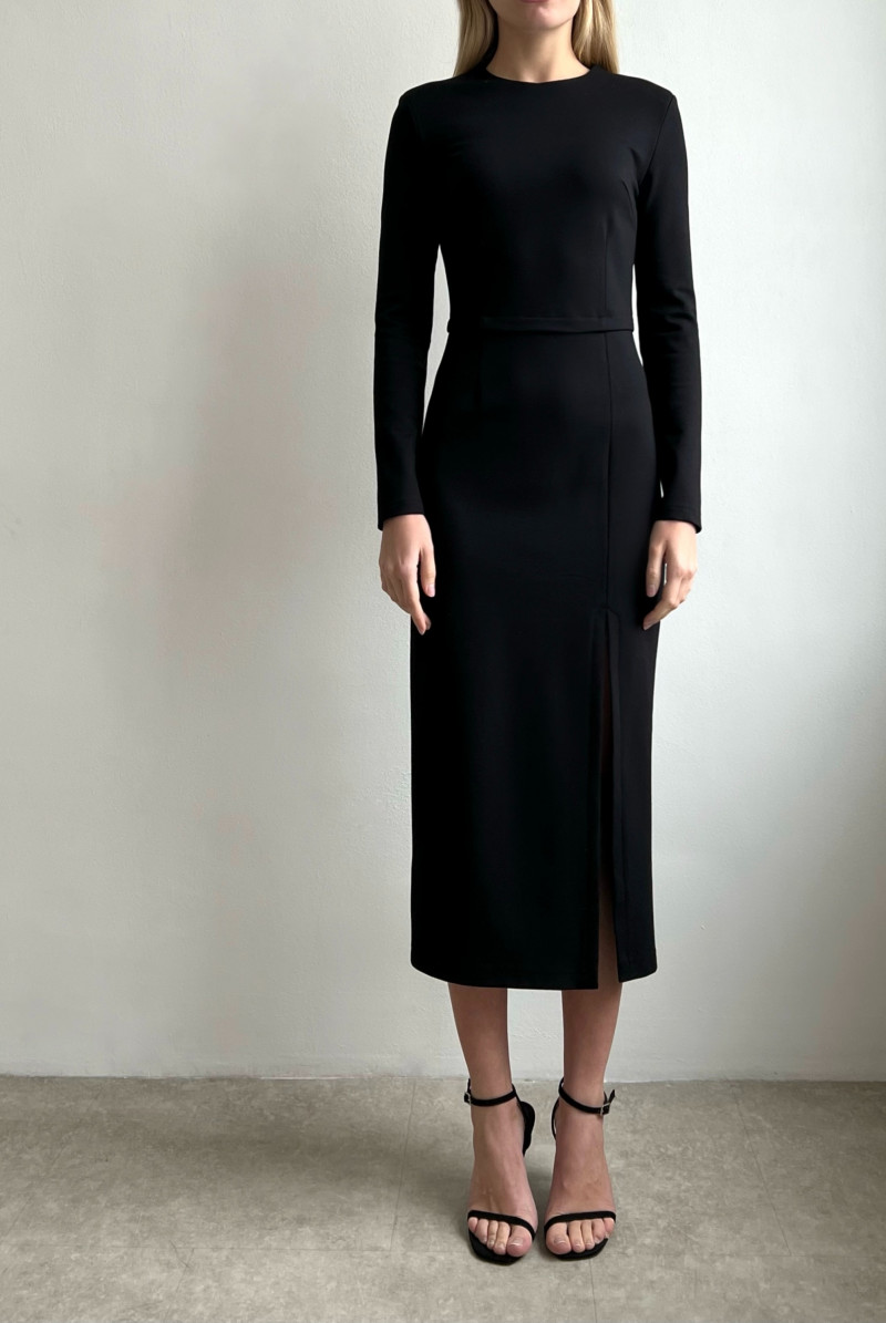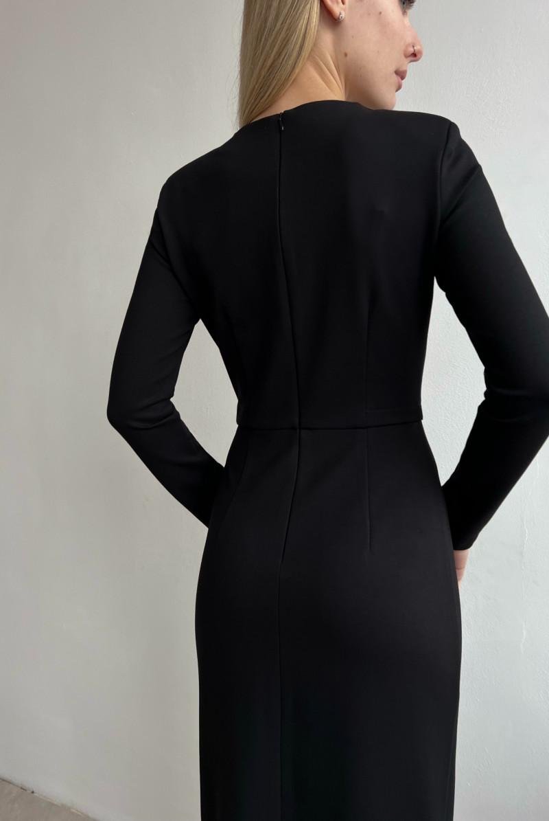 Платье приталенного силуэта с отрезной талией. С левой стороны разрез на юбке спереди. Рукав длинный. Вырез горловины круглый. Застежка на потайную молнию по срередине спинки.