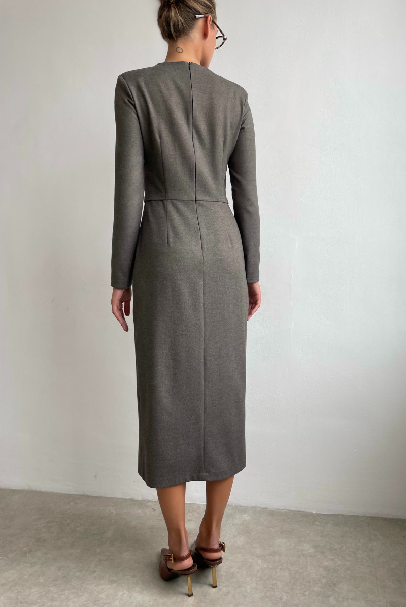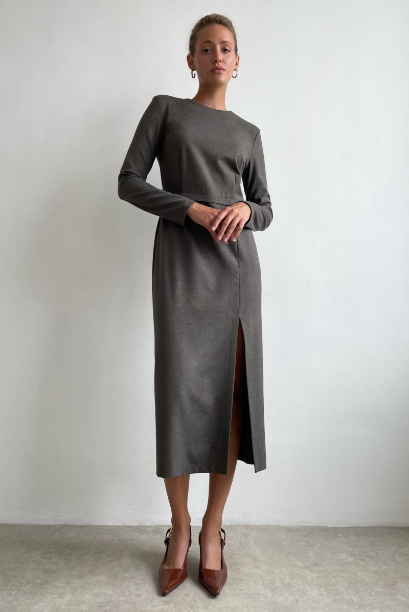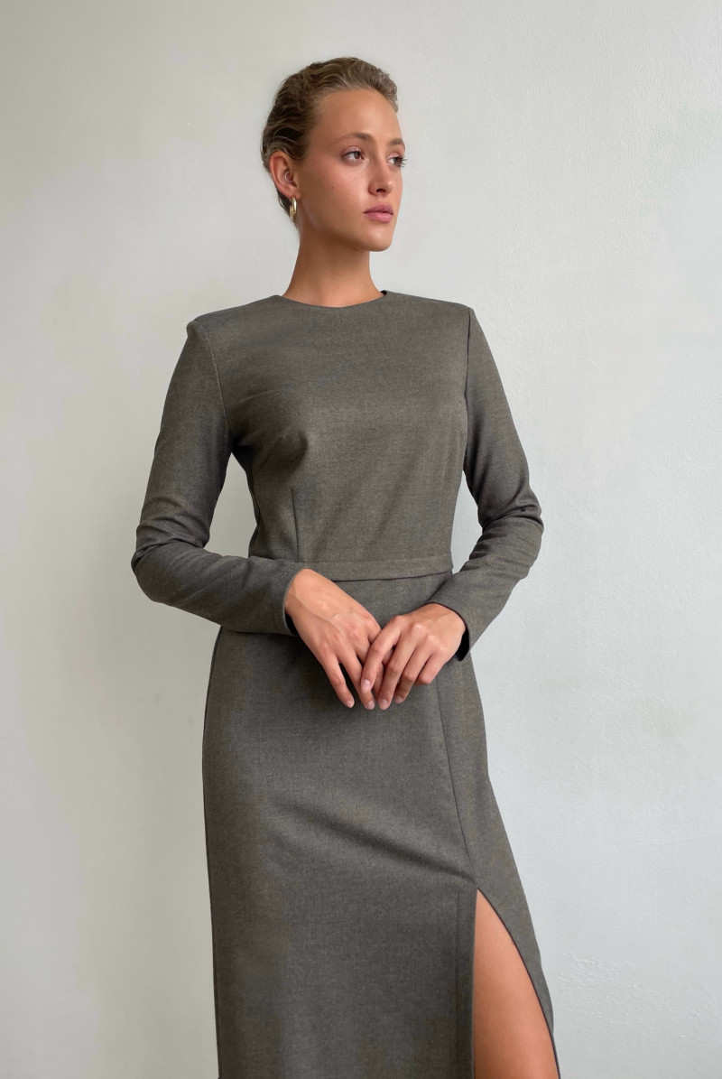 Платье приталенного силуэта с отрезной талией. С левой стороны разрез на юбке спереди. Рукав длинный. Вырез горловины круглый. Застежка на потайную молнию по срередине спинки.