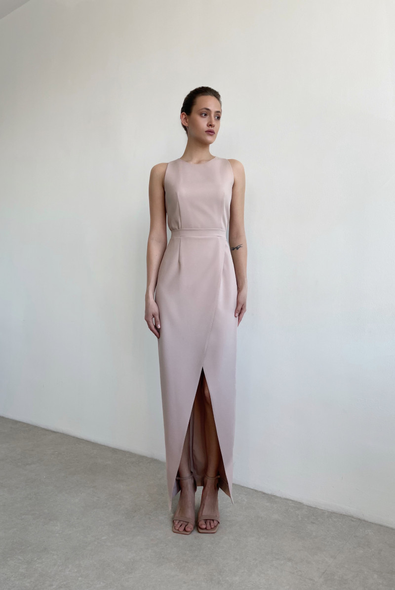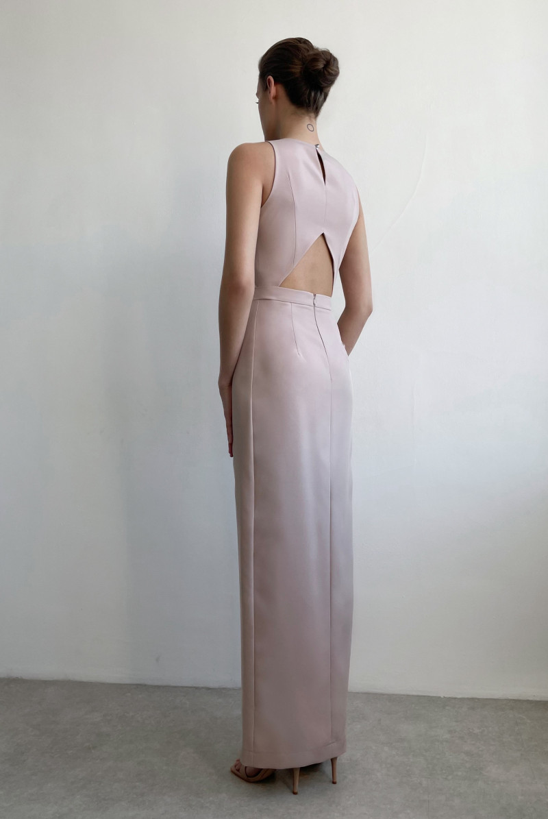 Платье без рукавов прилегающего силуэта длиной в пол. Юбка "на запах". Плечи открыты, в нижней части спинки - декоративный вырез.