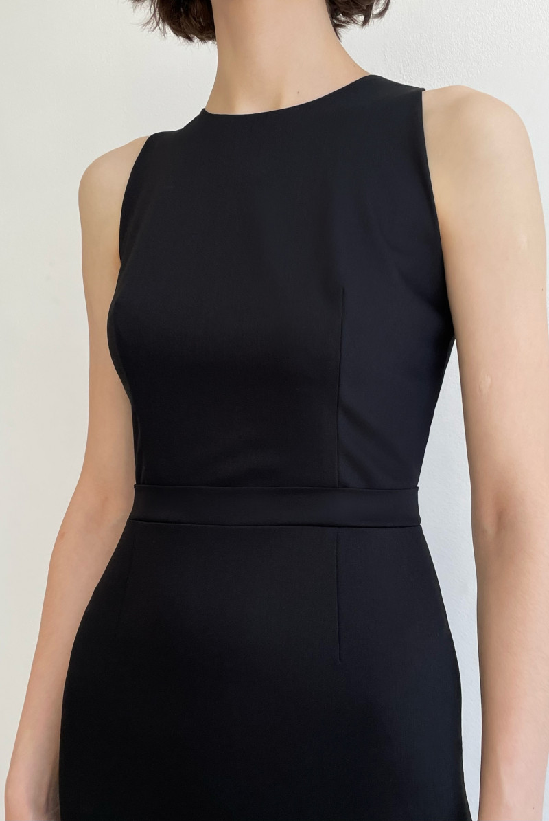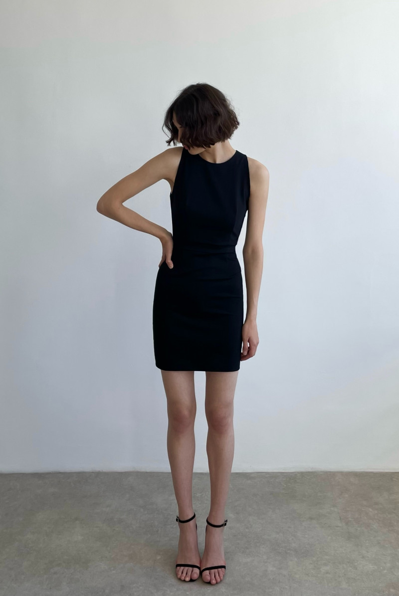Платье прилегающего силуэта длиной мини. Без рукавов. Врырез горловины круглый. По спинке платья - фигурный вырез.