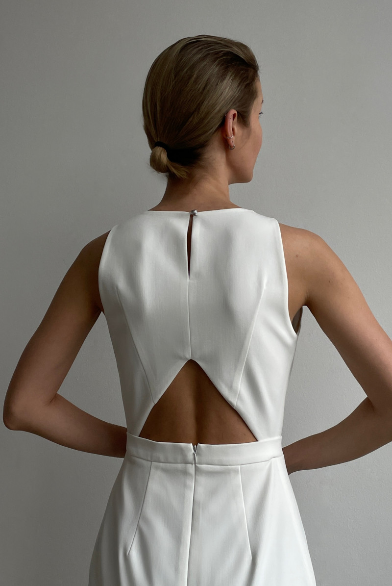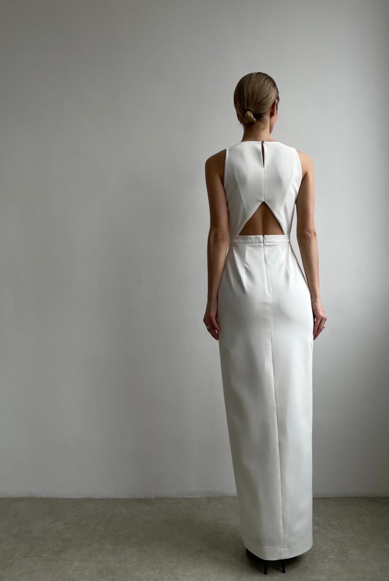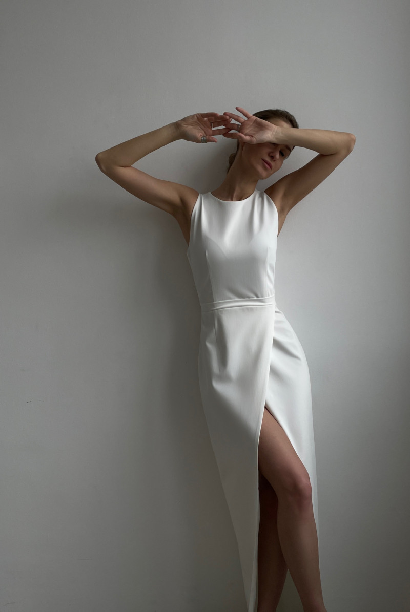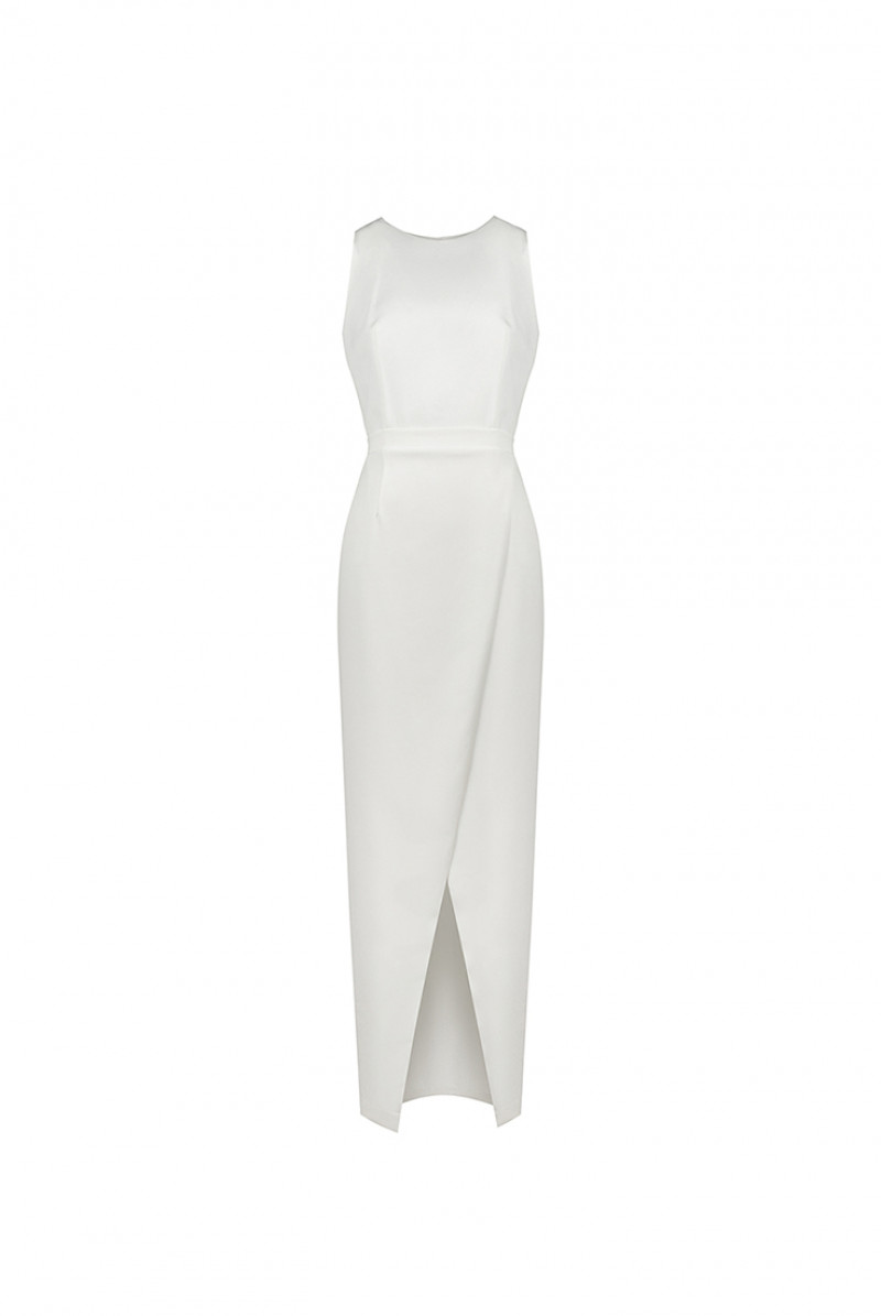 Платье без рукавов прилегающего силуэта длиной в пол. Юбка "на запах". Плечи открыты, в нижней части спинки - декоративный вырез.