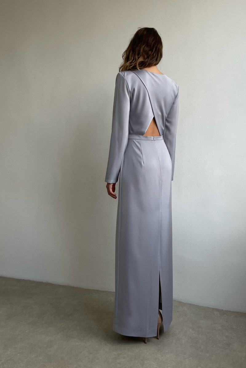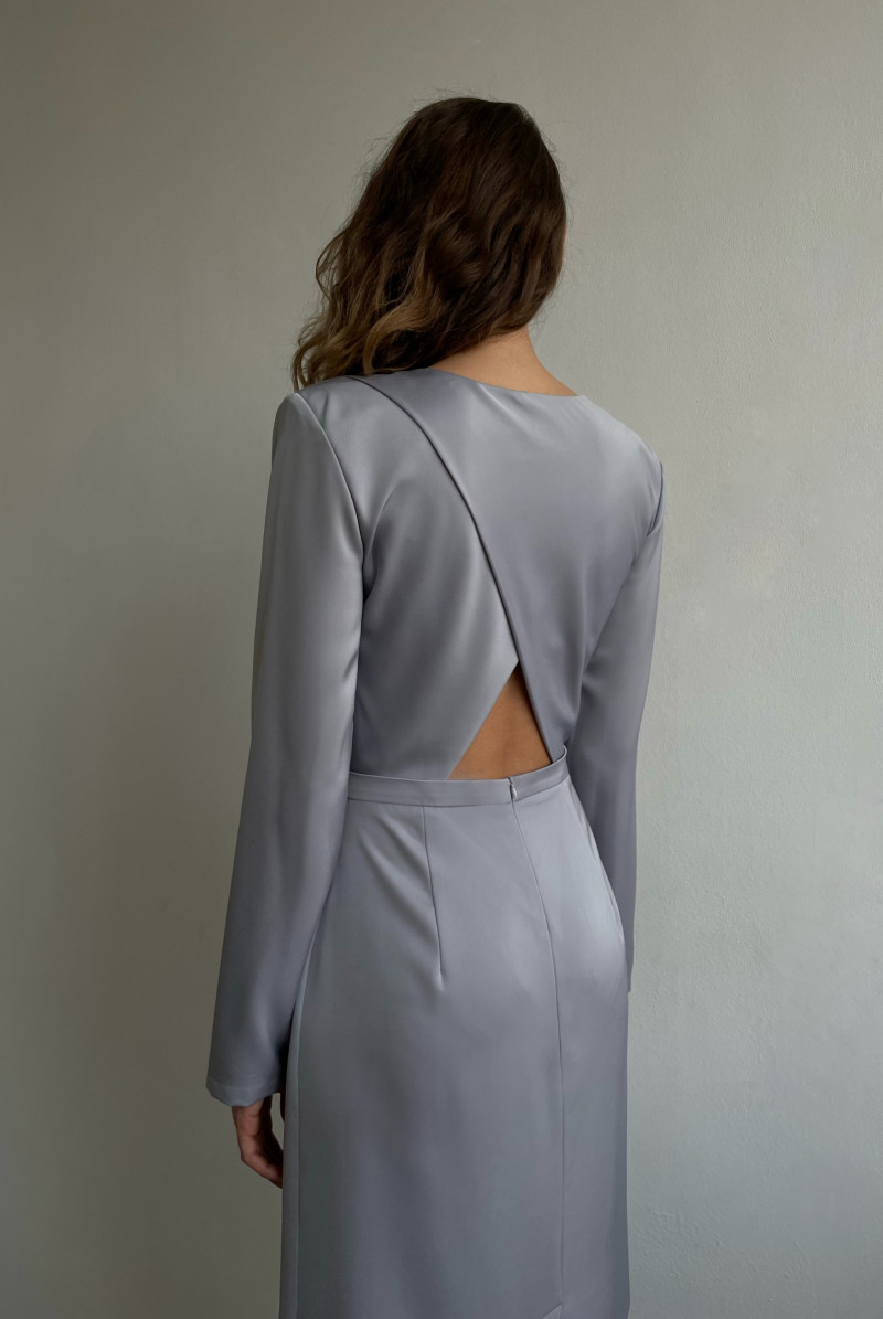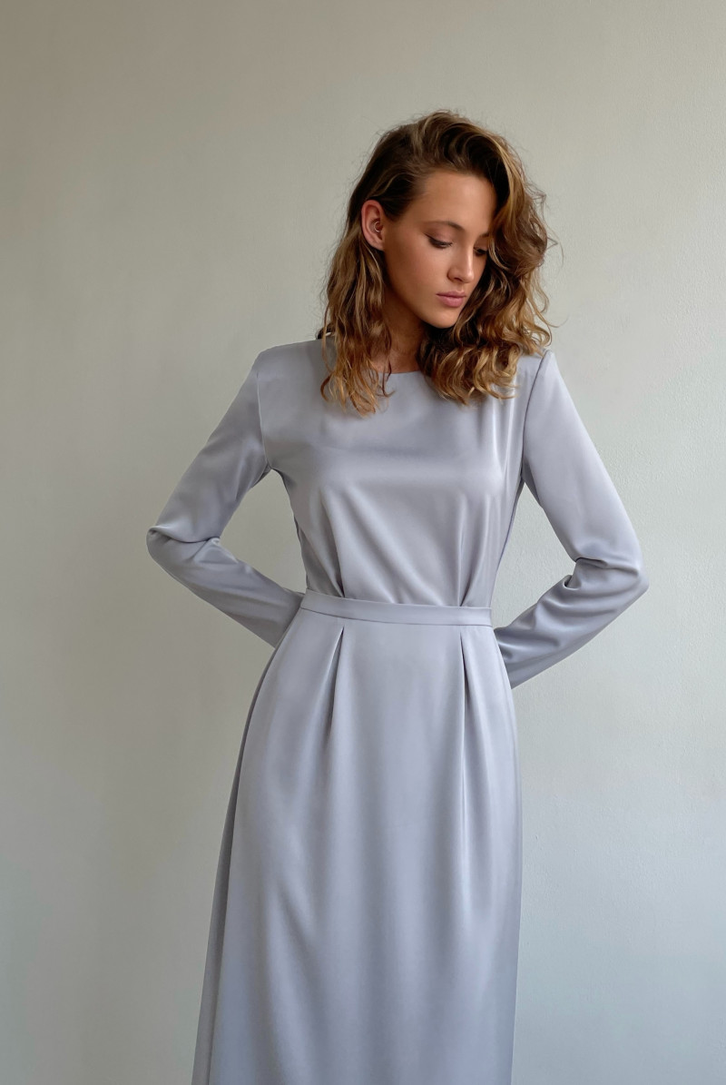 Платье приталенного силуэта отрезное по талии, юбка прямая. В среднем шве юбки сзади шлица. Застежка на потайную молнию. Вырез горловины круглый. Сзади "запах". Рукав длинный с манжетом.