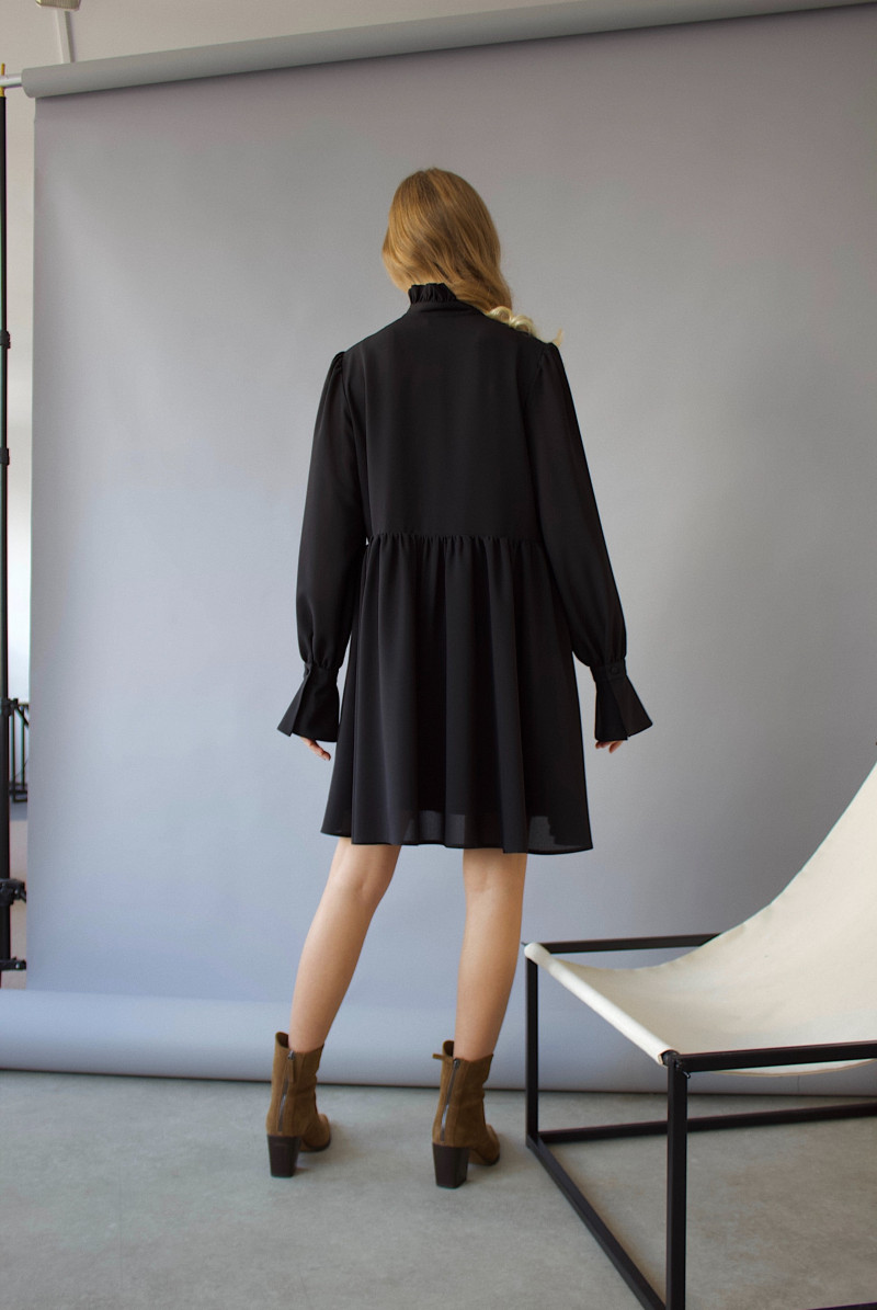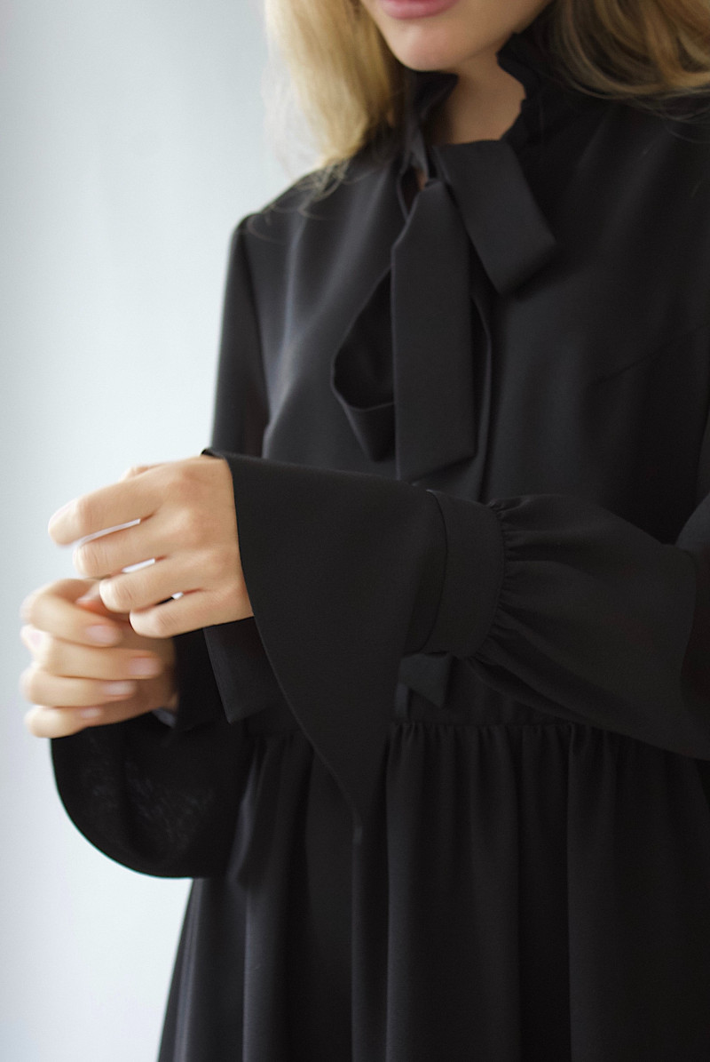 Платье свободного силуэта, отрезное по линии талии. Рукав длинный со сборкой, по низу рукава манжет с воланом. По переду застежка на пуговицы. Горловина платья оформлена воротником-стойкой с оборкой и бантом.