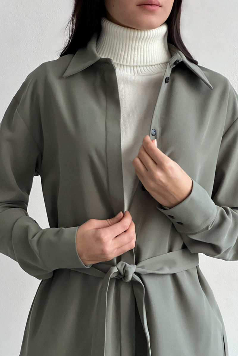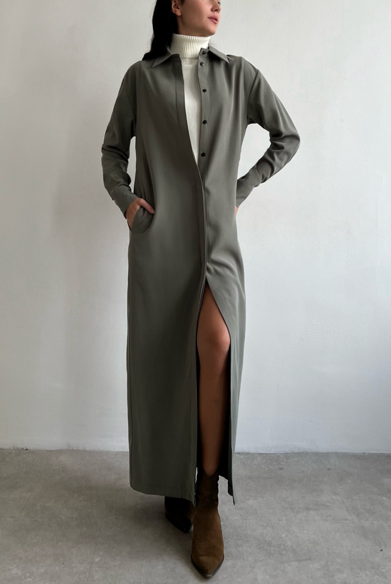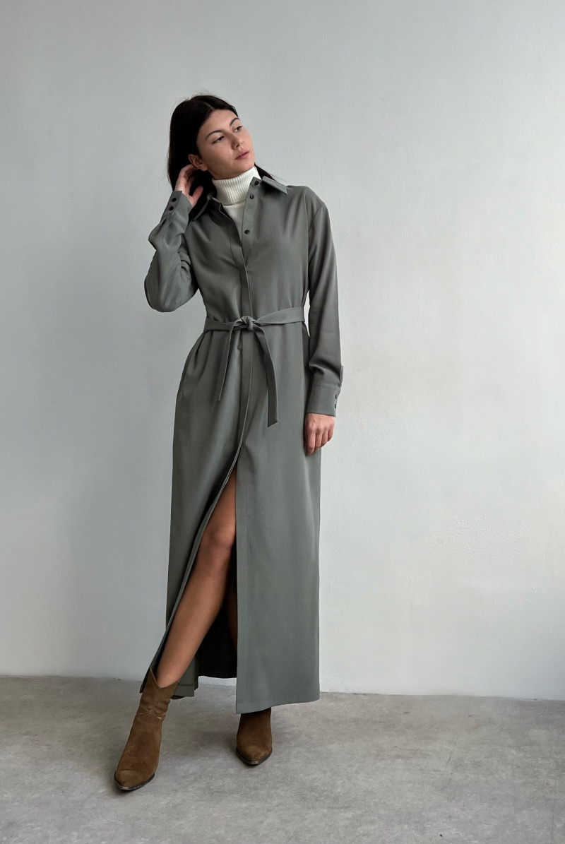 Платье-рубашка прямого кроя длиной "макси". Спереди потайная застежка на пуговицах. Линия плеча спущенна. Рукав длинный с манжетом. Воротник "рубашечный" на стойке. В боковых швах карманы.