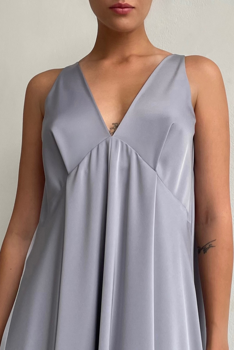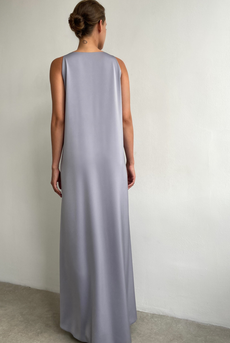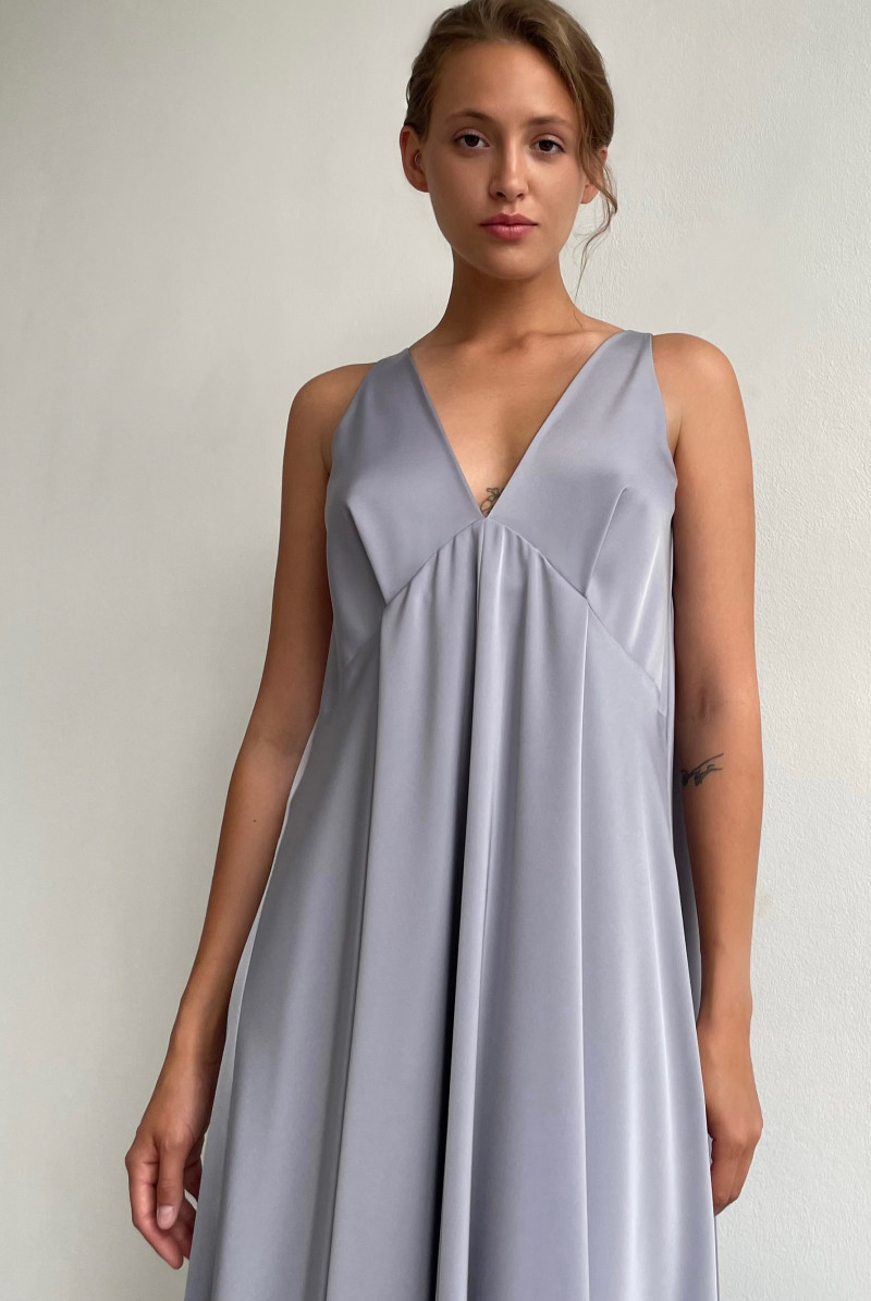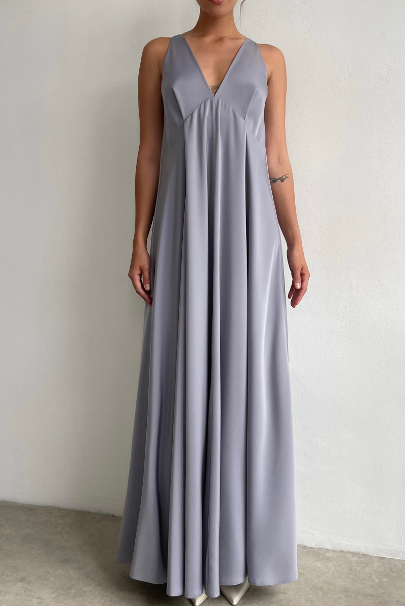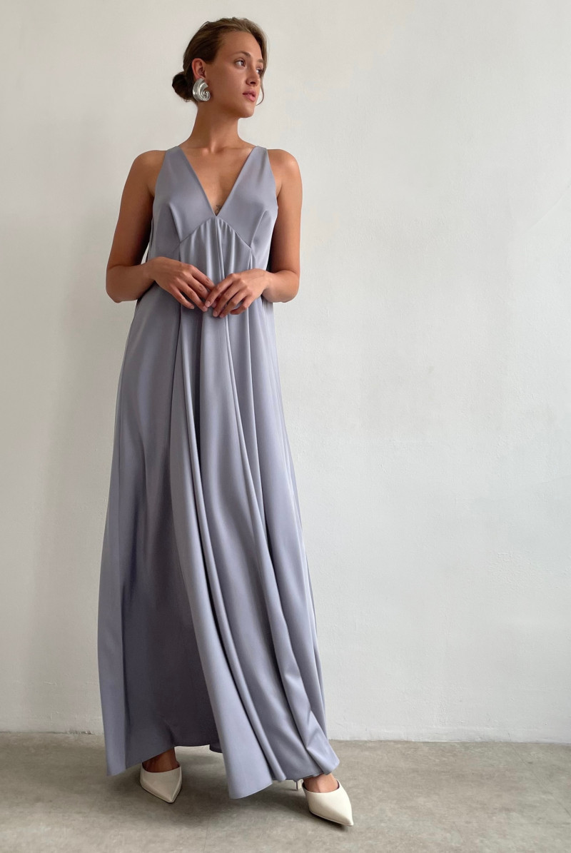 Платье в пол силуэта трапеция, без рукава. По переду подрез фигурной формы, ниже линии груди. Вырез горловины переда глубокий V-образный.