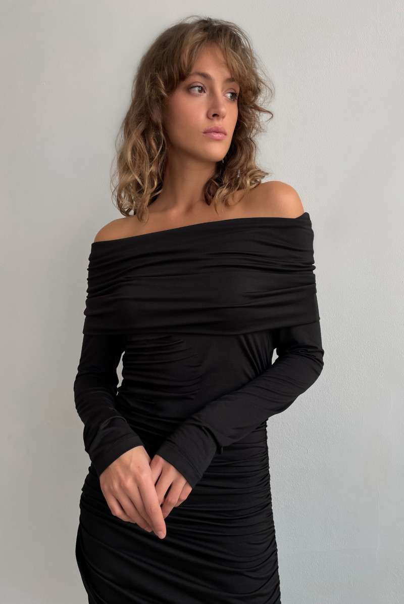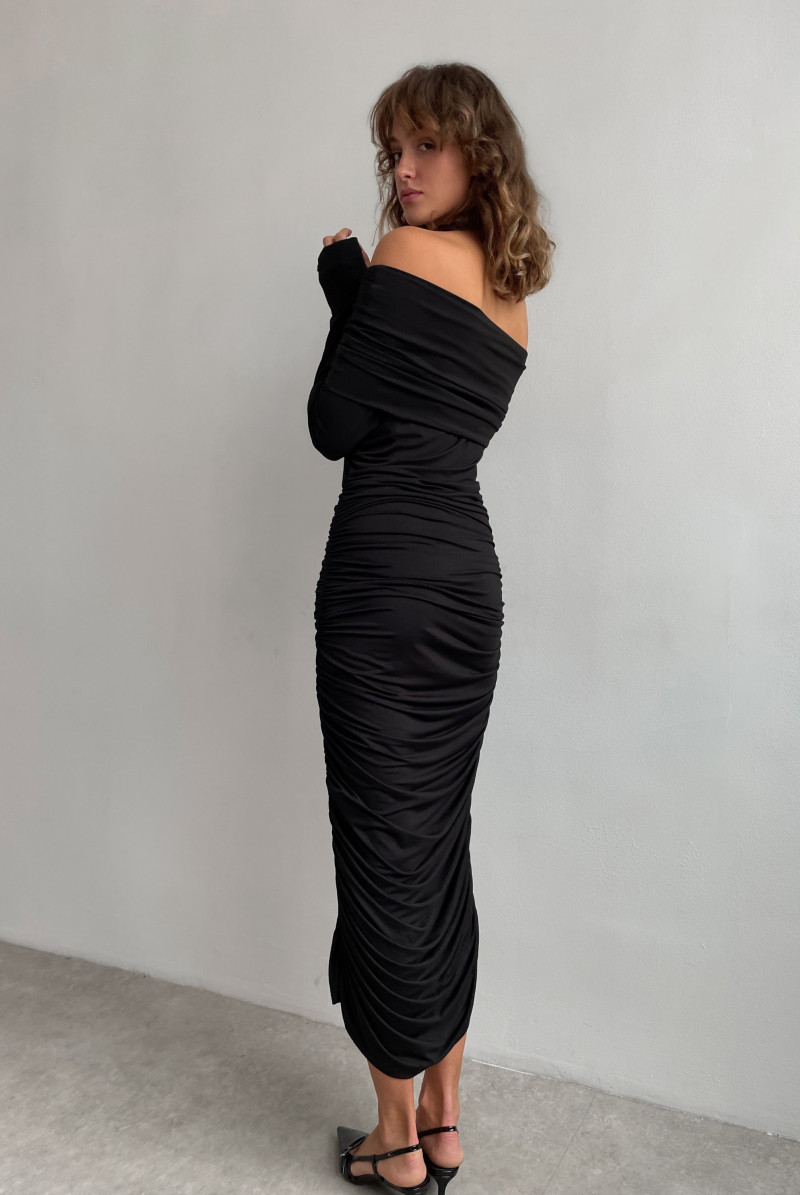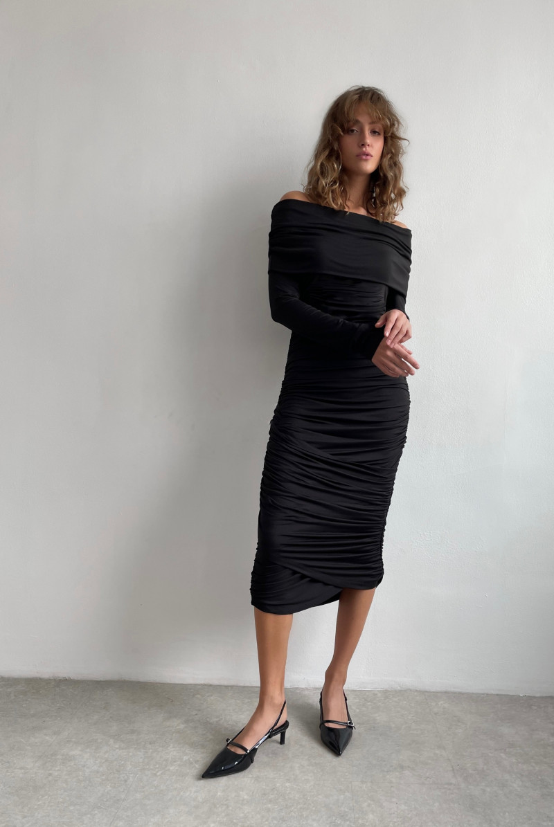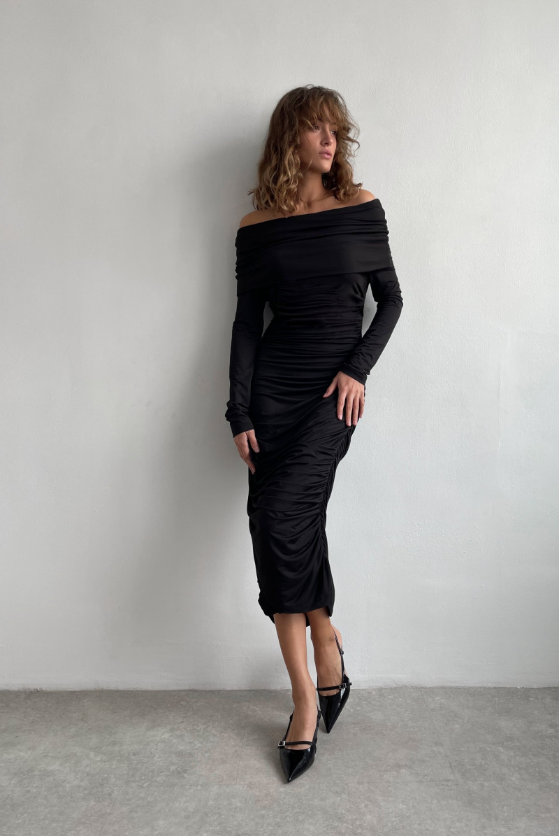 Платье плотно прилегающее, в длине миди из трикотажного полотна. Платье с длинными рукавами. Спереди и сзади горизонтальная драпировка. Вырез горловины с открытыми плечами, оформлен широким отложным воротником.