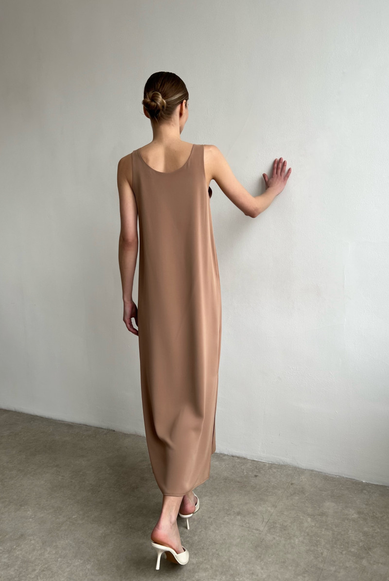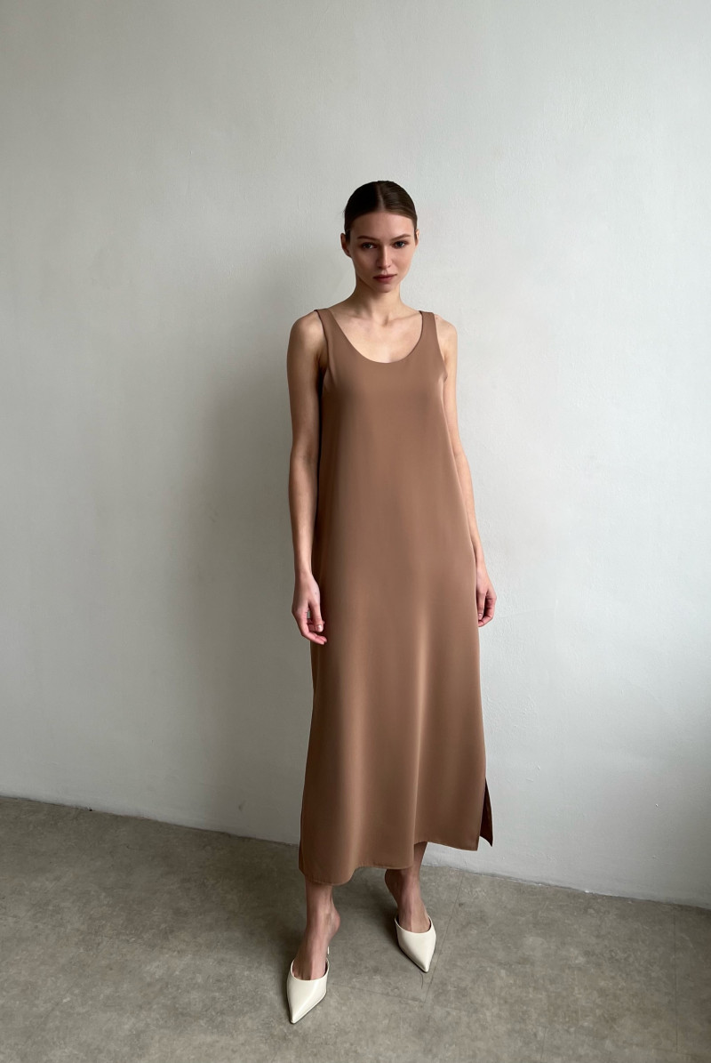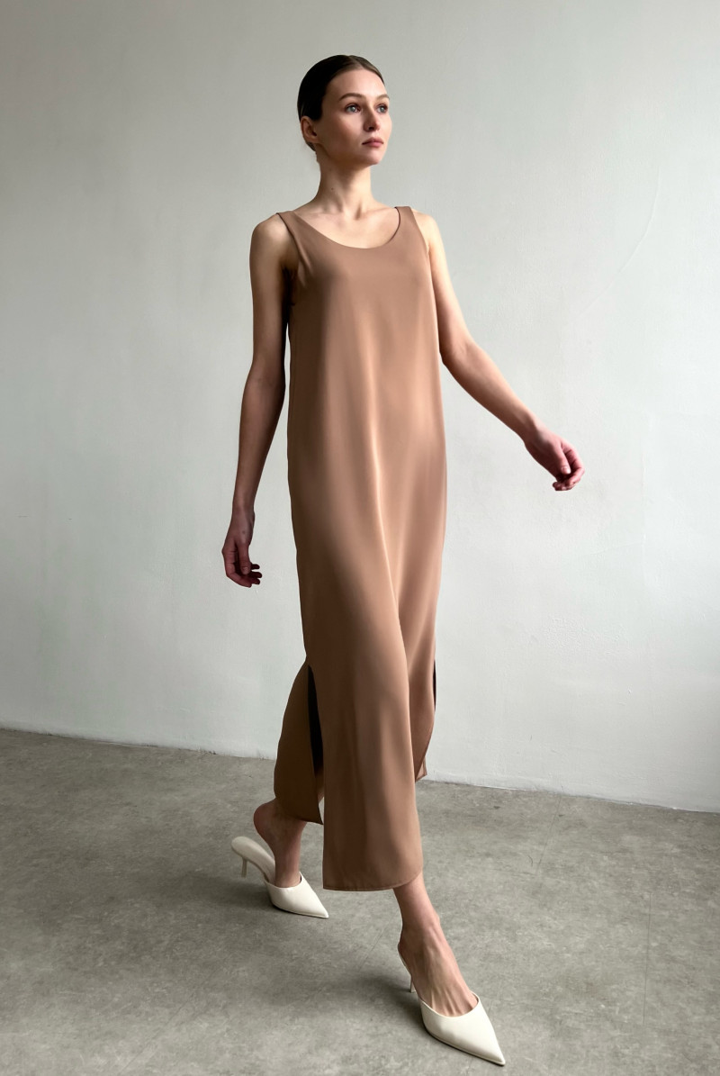 Платье-майка с небольшим расширением к низу с разрезами в боковых швах.