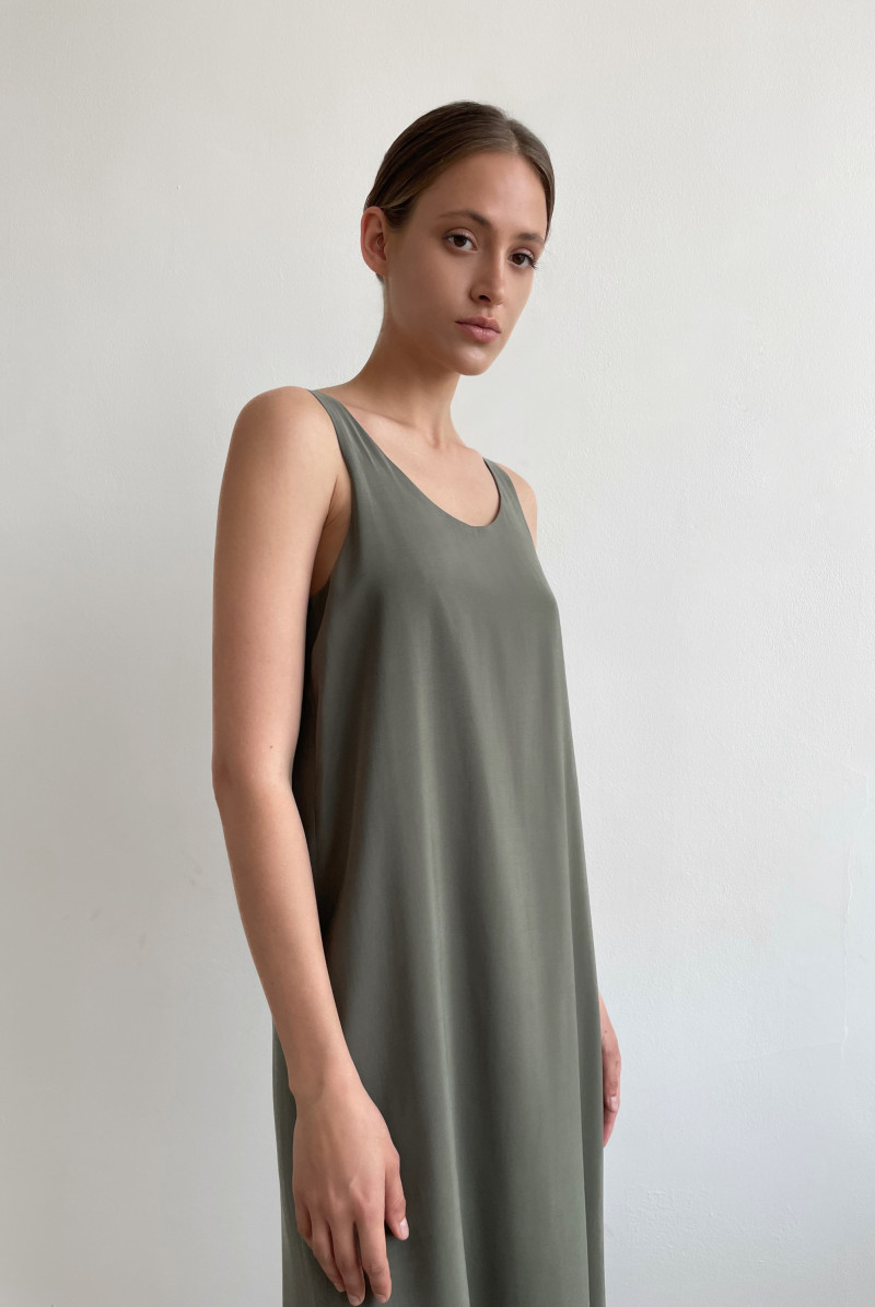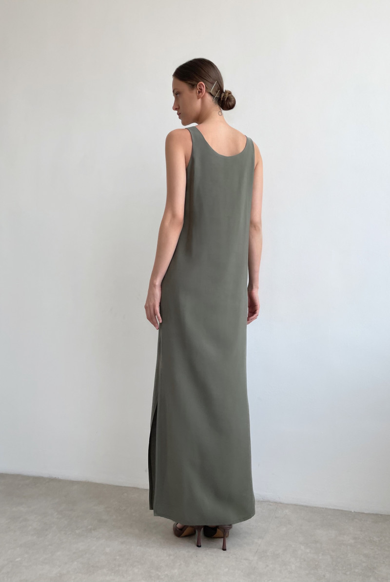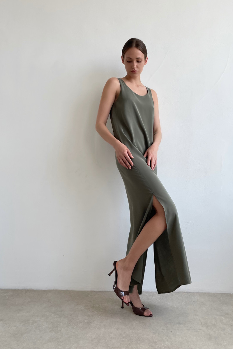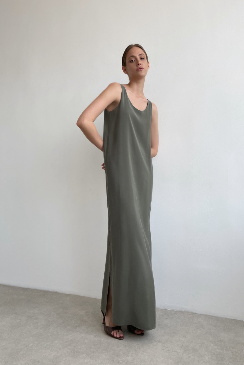 Платье-майка с небольшим расширением к низу с разрезами в боковых швах.