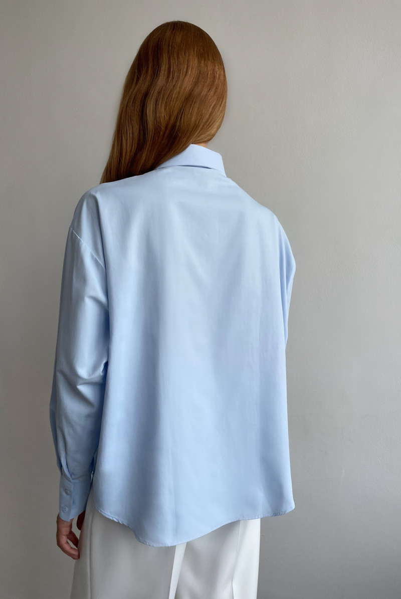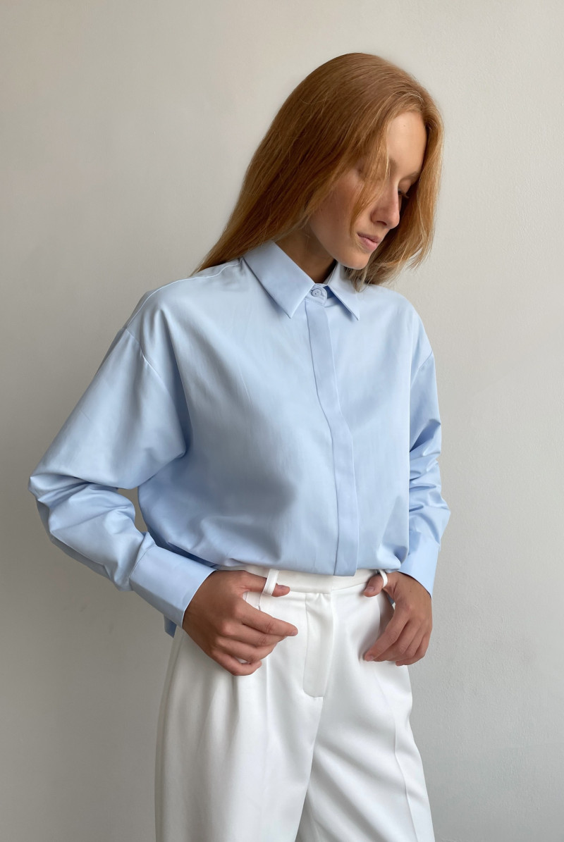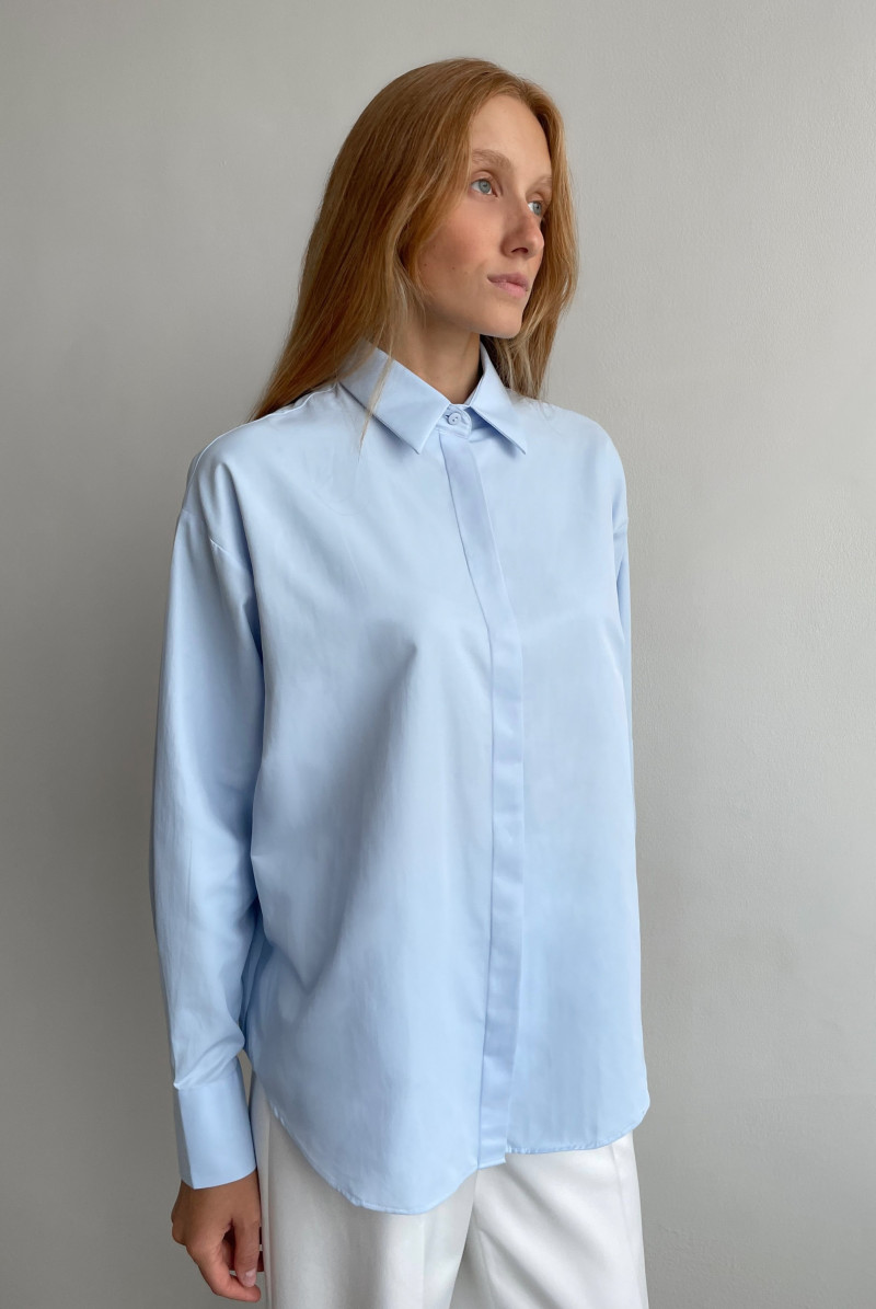 Рубашка - "оверсайз" из хлопка. Линия плеча спущена, рукав с манжетом, воротник рубашечный на стойке. Застежка "супатная" спереди на пуговицах. Линия низа фигурная.