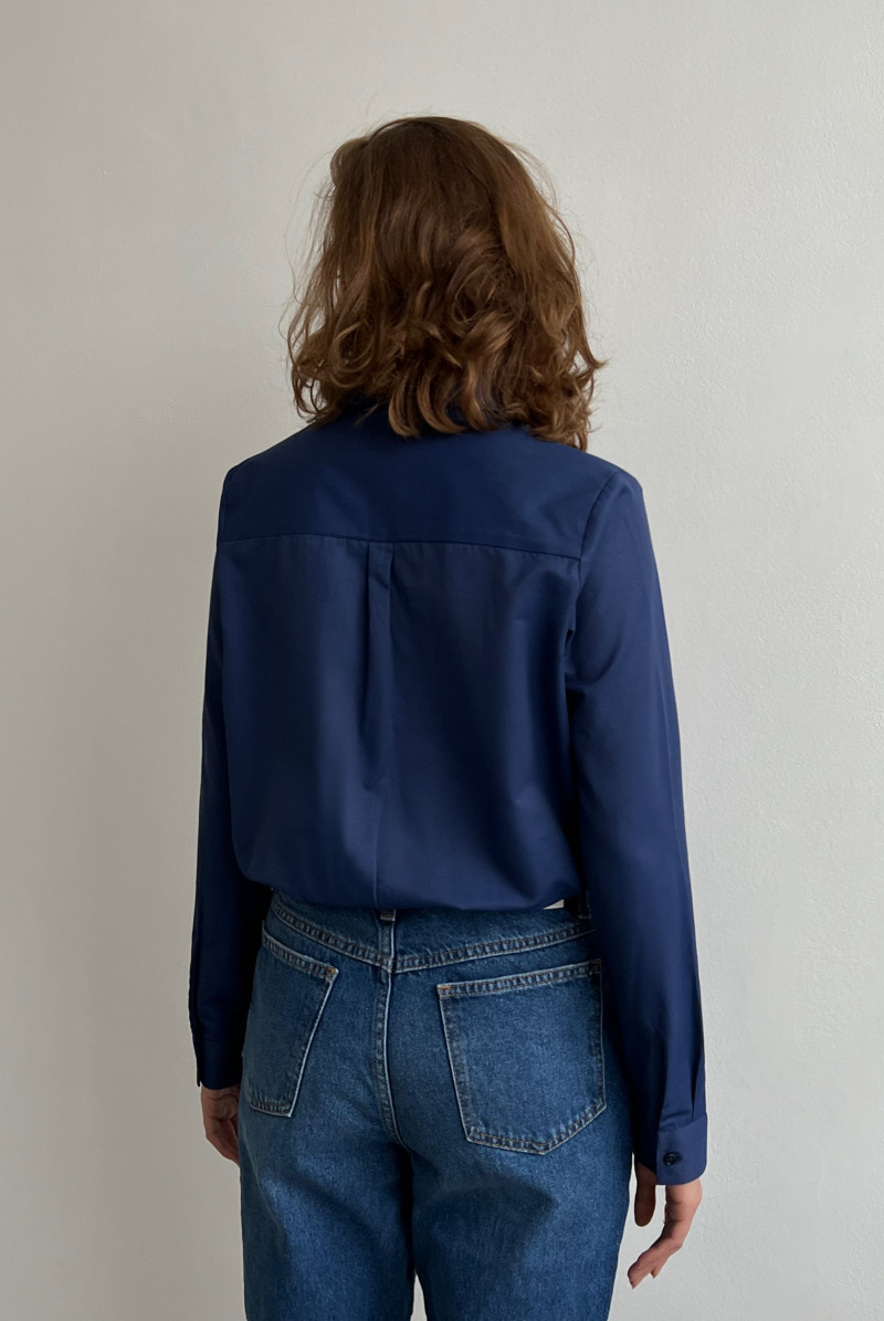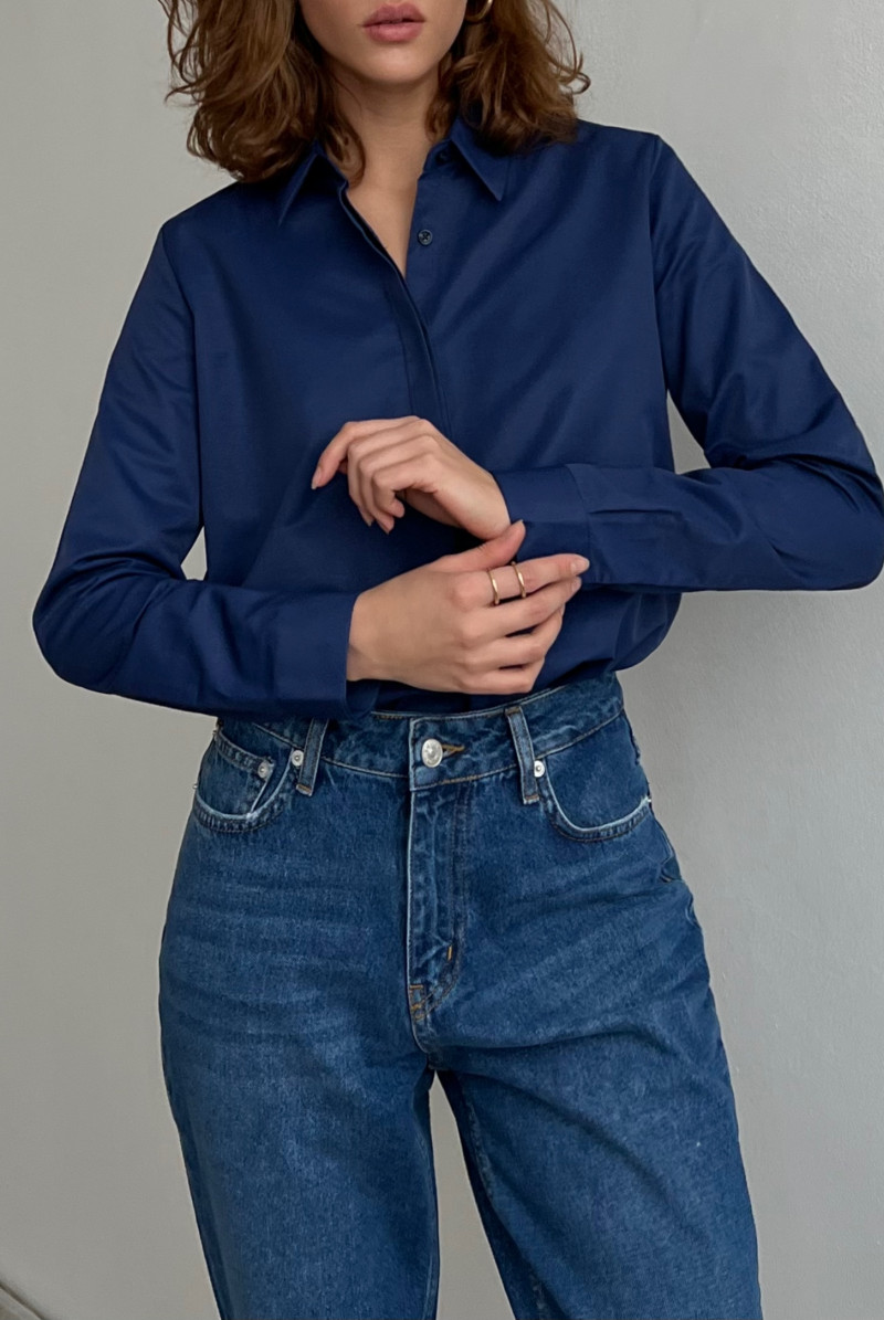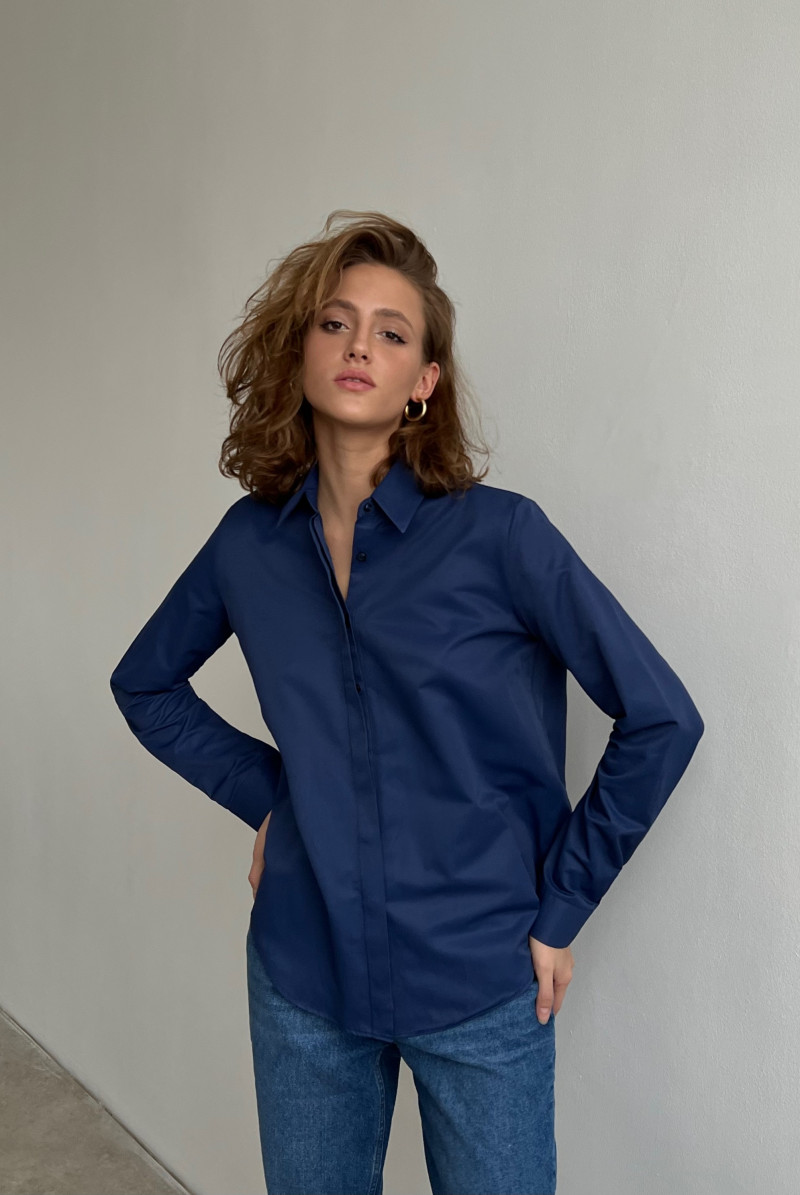 Блуза-рубашка из хлопковой ткани прямого силуэта, с рубашечным воротником, длинными рукавами на манжете с пуговицей, с супатной застежкой на пуговицы спереди, фигурный низ.