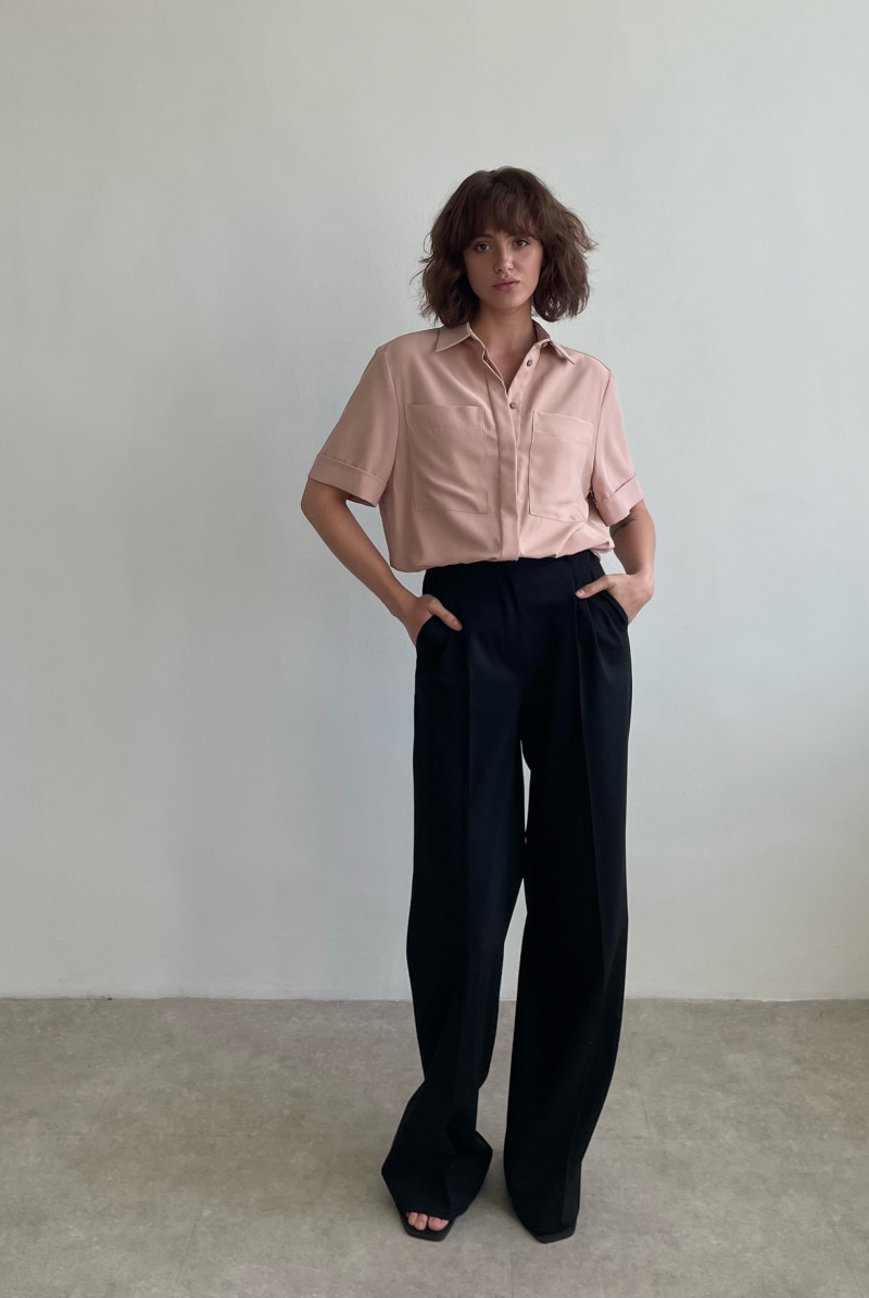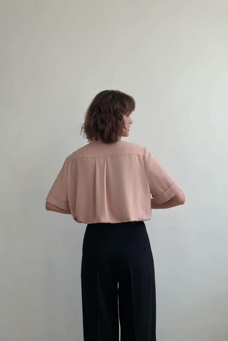 Рубашка прямого силуэта с потайной застёжкой на пуговицы. Рукав короткий, свободный, с отворотом. По переду два кармана на лацканах.