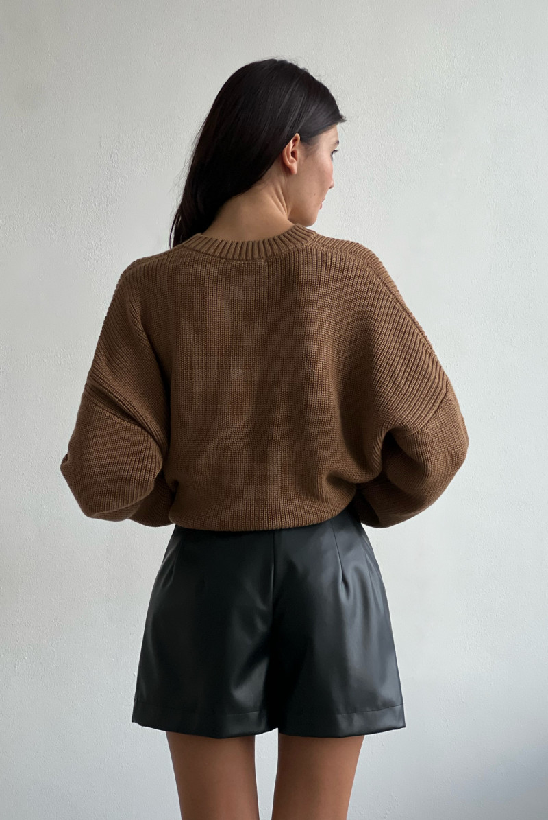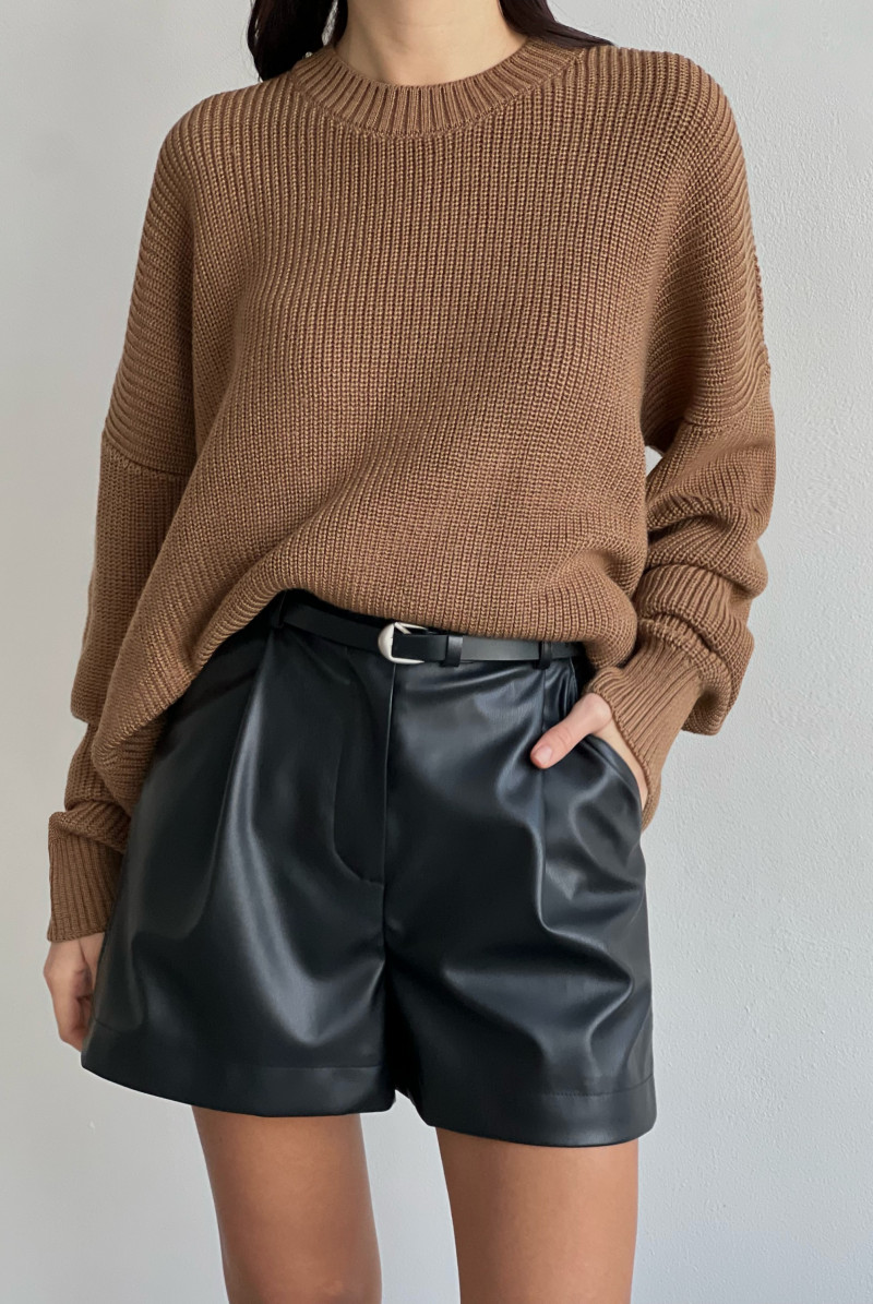 Шорты из эко-кожи с посадкой на талии. Карманы спереди с отрезным бочком. Застежка "гульфик" с молнией, на поясе шлёвки.