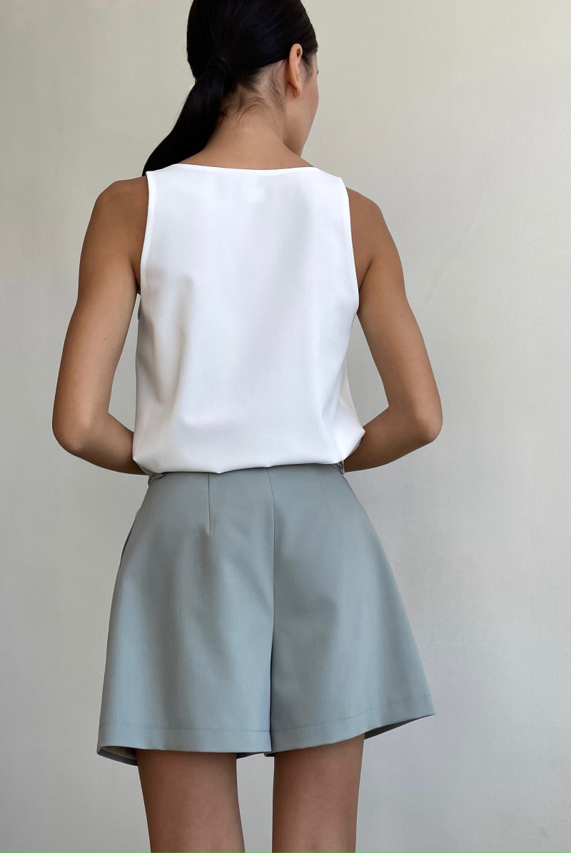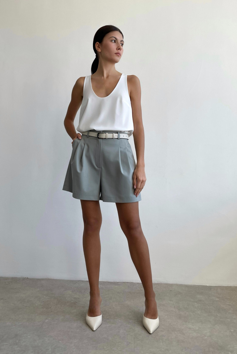Шорты прямого силуэта, умеренного объема. Спереди по линии талии заложены складки. Есть карманы на передних половинках. Застежка шорт-гульфик. Шорты на притачной подкладке.
