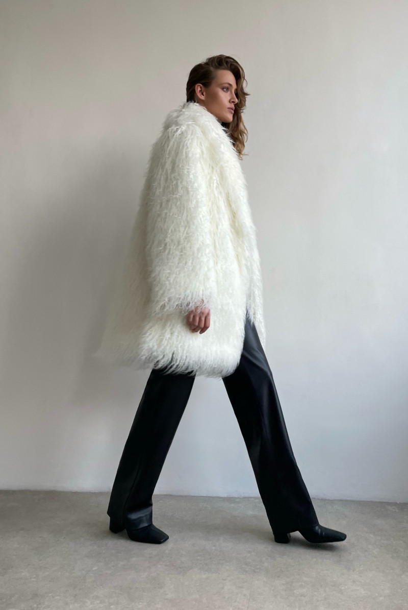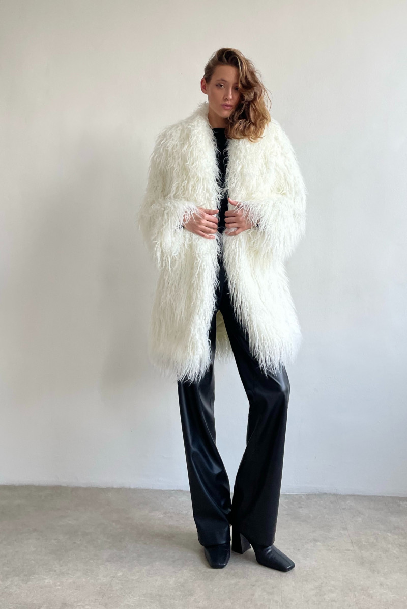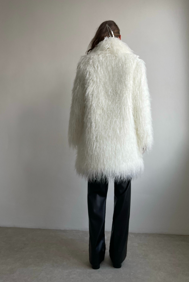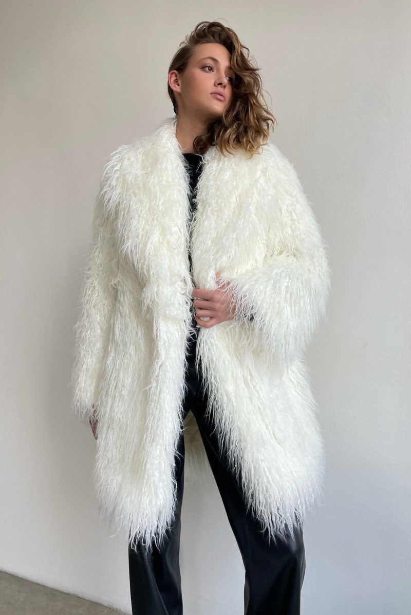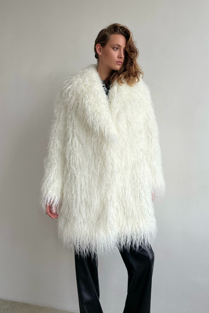 Полушубок из исскусвенного длинноворсового меха, прямого кроя длиной выше колена. Воротник "шаль". Застёжка по центру переда на шубные крючки.