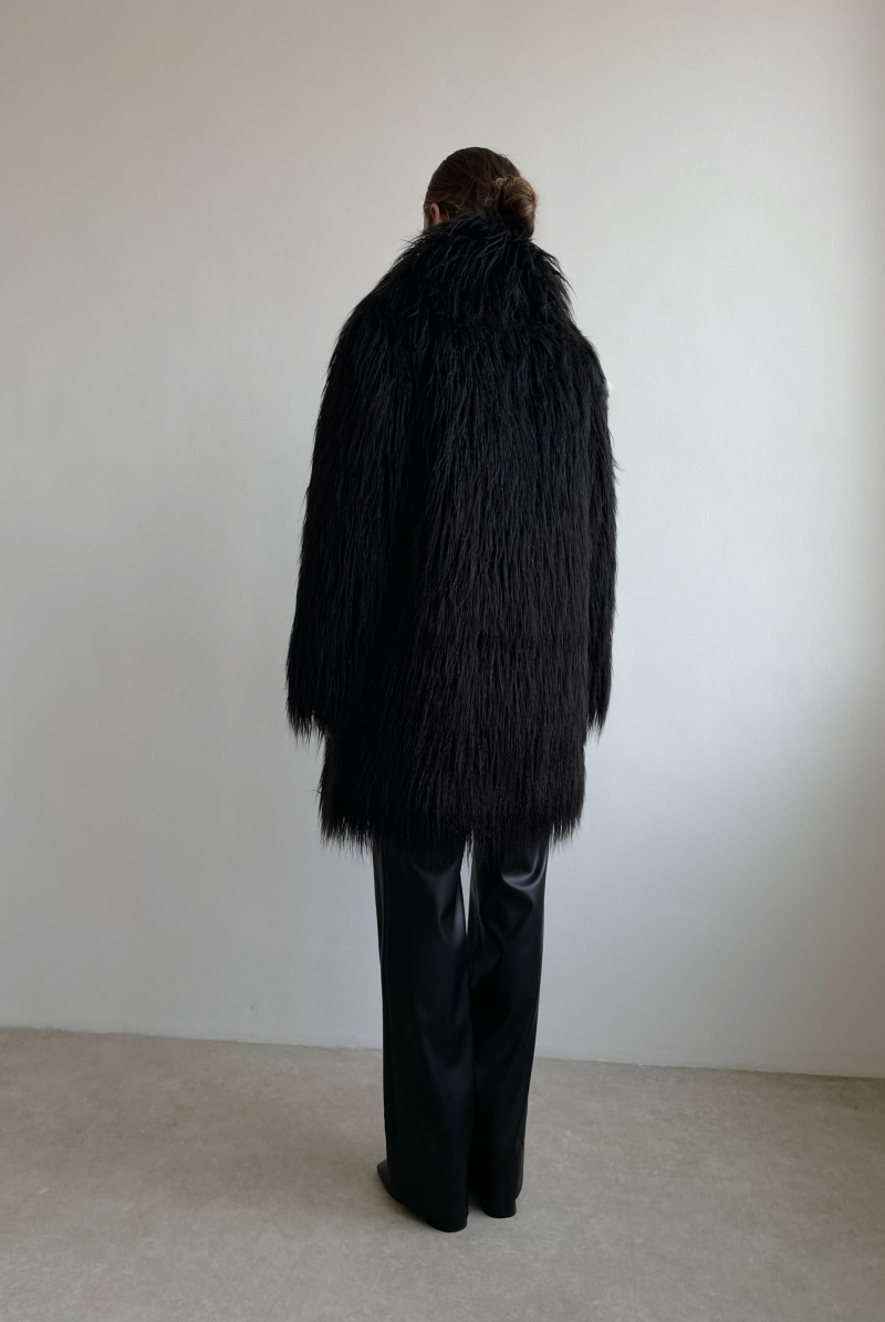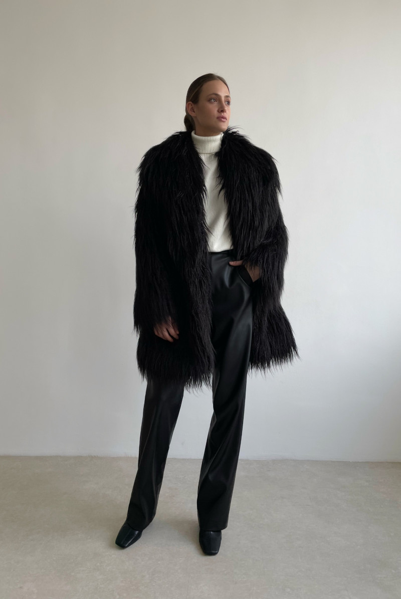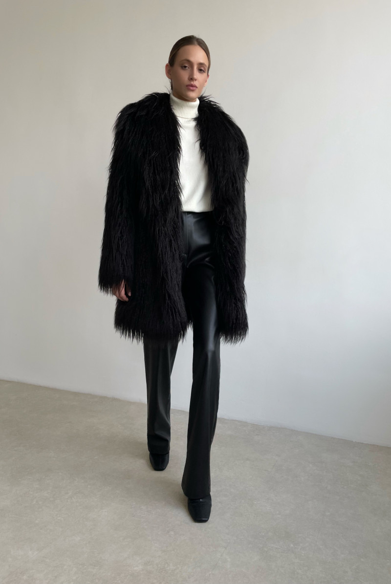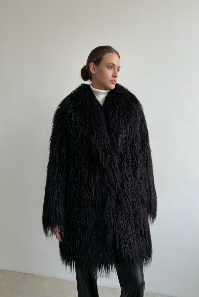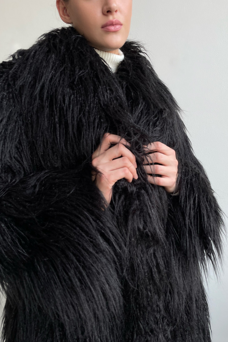 Полушубок из исскусвенного длинноворсового меха, прямого кроя длиной выше колена. Воротник "шаль". Застёжка по центру переда на шубные крючки.