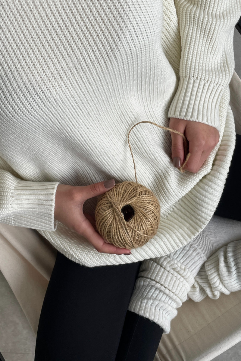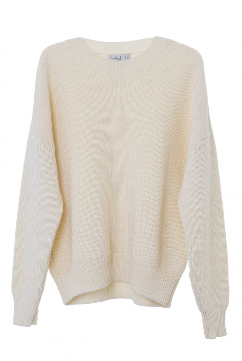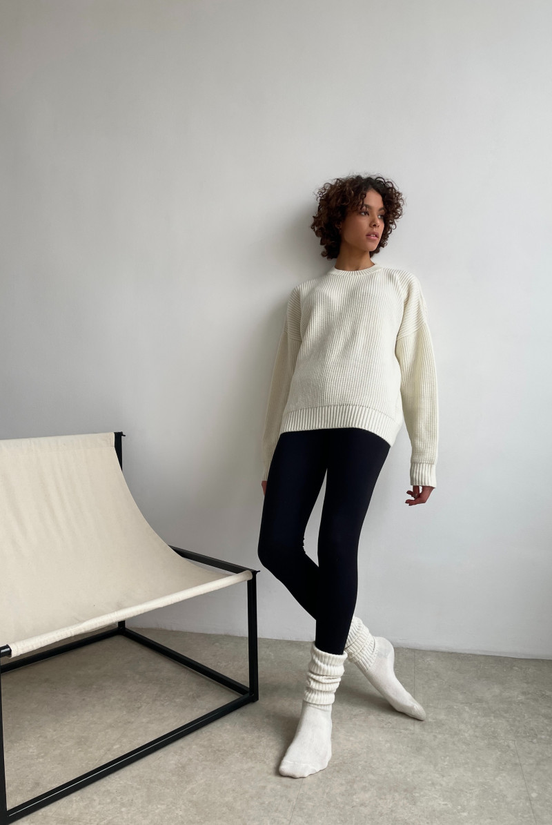 Свитер актуального свободного фасона oversize из шерсти с акрилом. Вырез горловины круглый, спущенное плечо.