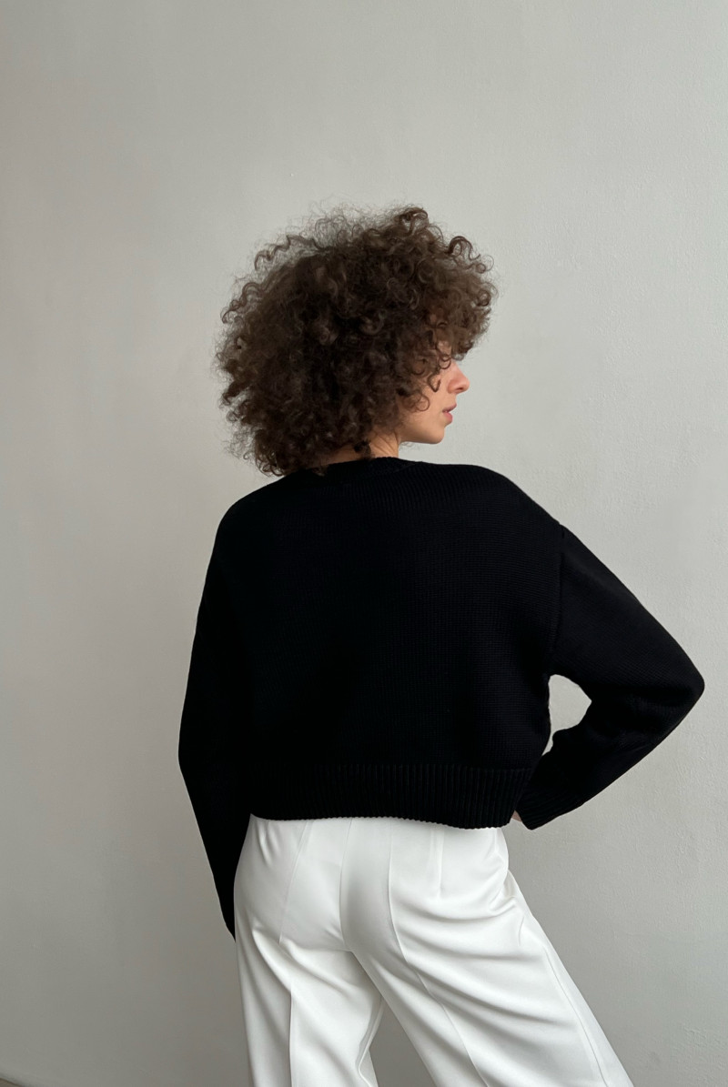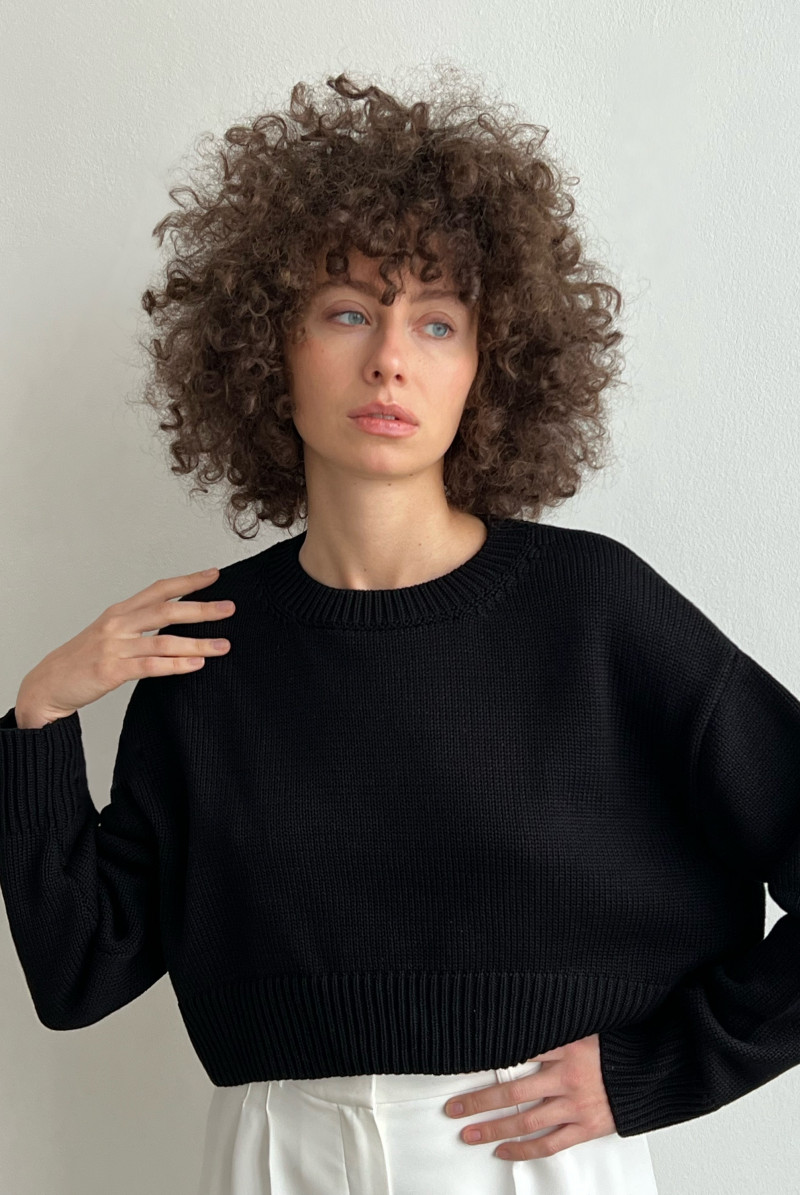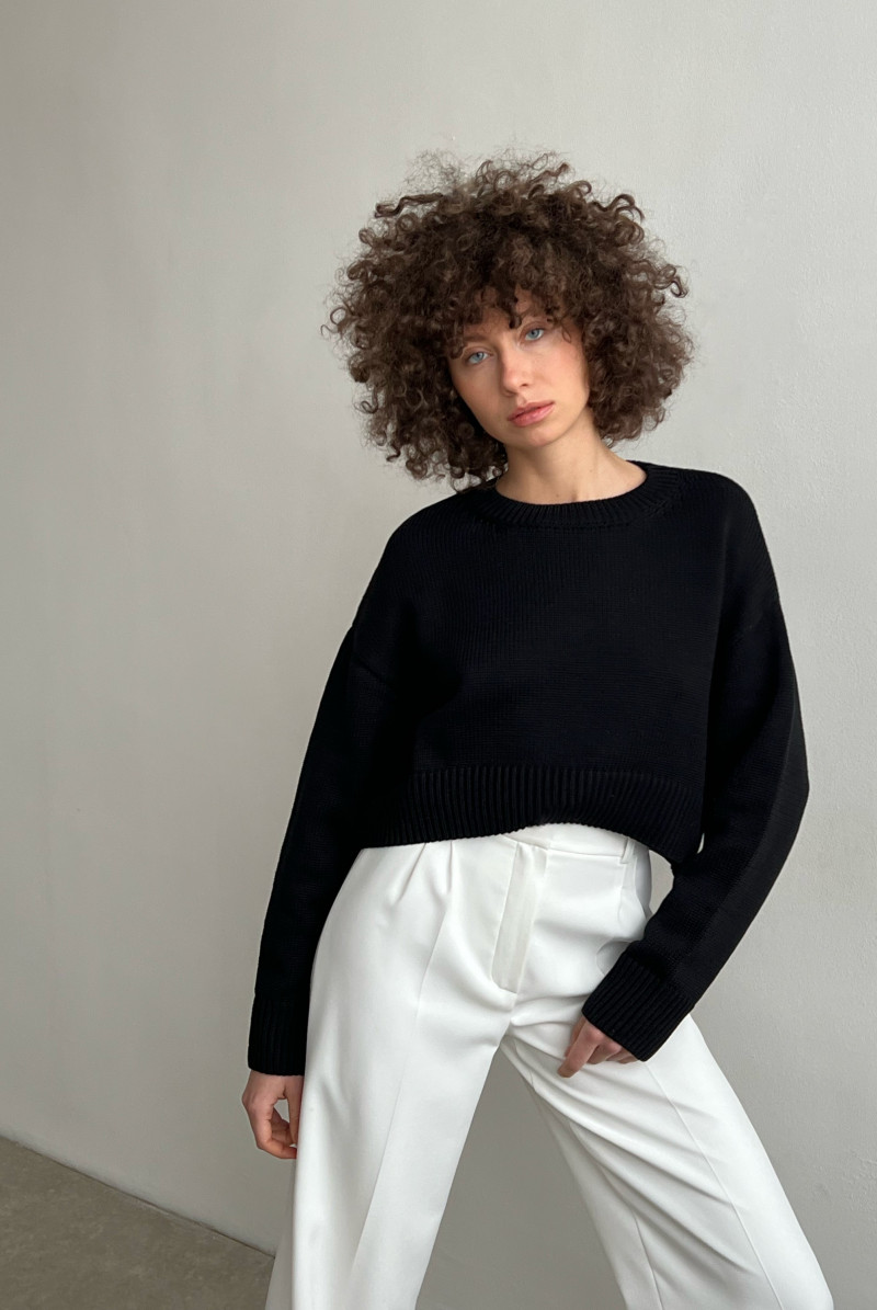 Свитер укороченный со спущенным плечом среднего оверсайза.