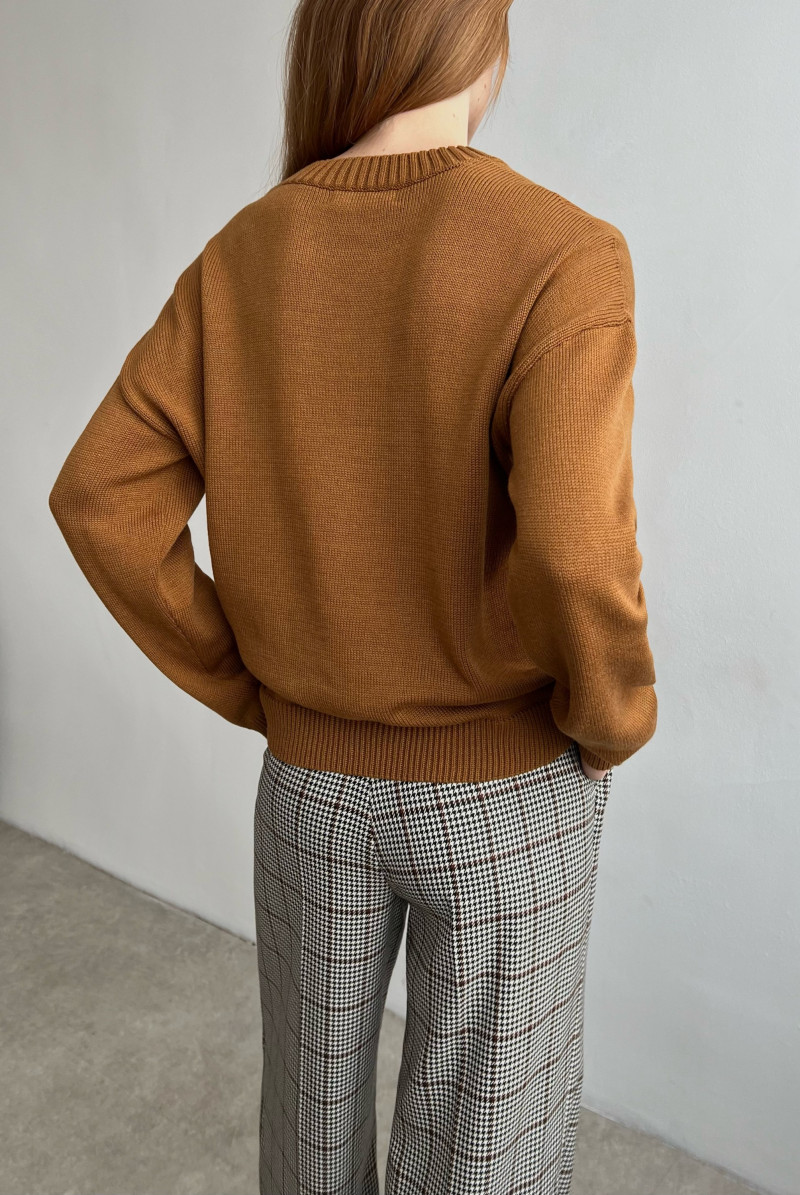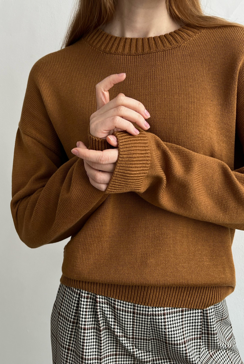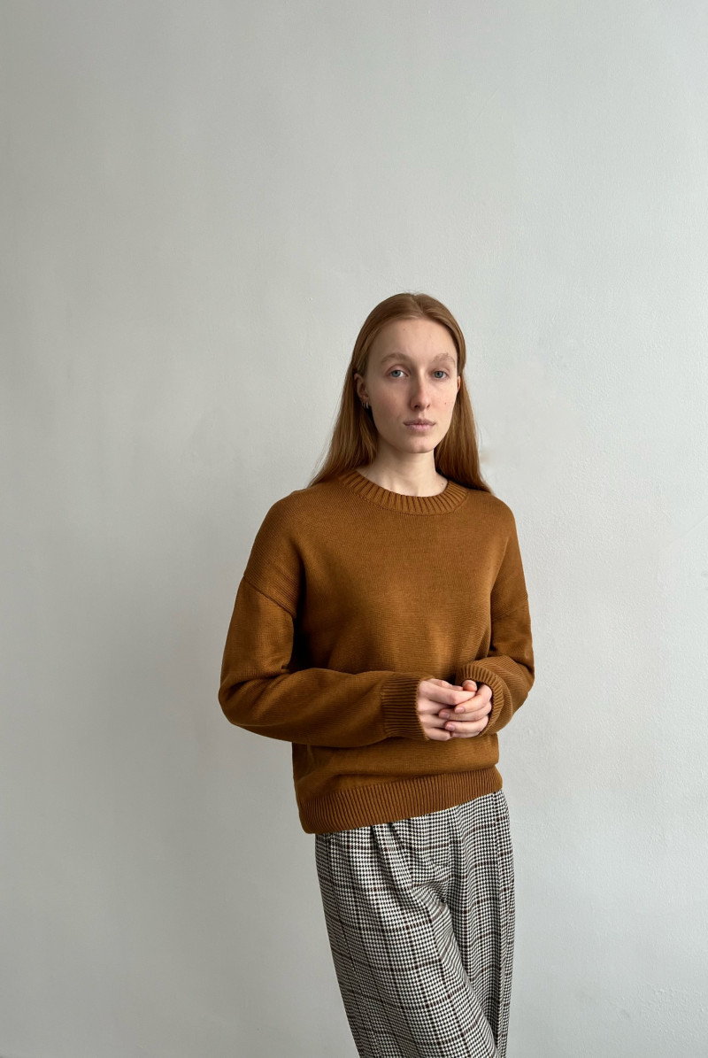 Свитер прямого кроя длиной чуть ниже талии. По низу рукава и изделия - вязка-резинка, вырез горловины круглый, так же отделан вязкой-резинкой.