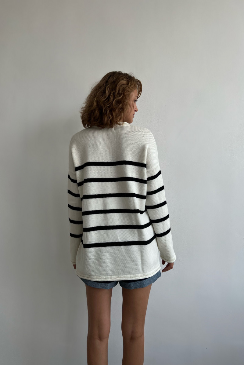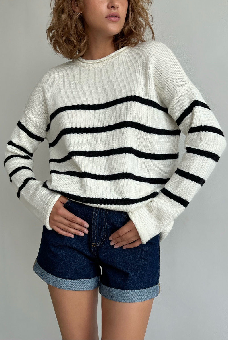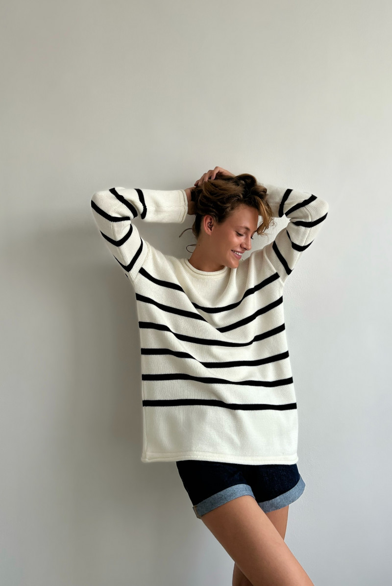 Свитер актуального свободного фасона oversize из шерсти с акрилом. Вырез горловины круглый, спущенное плечо.