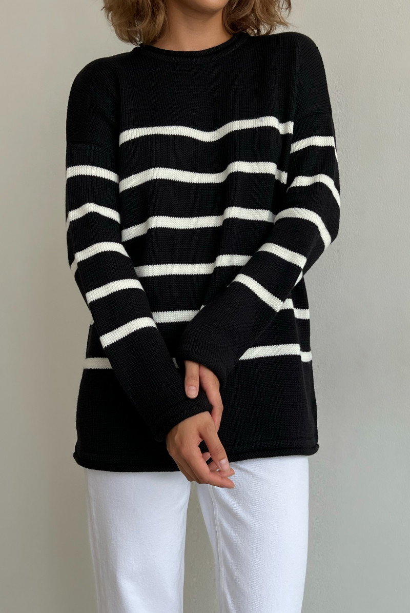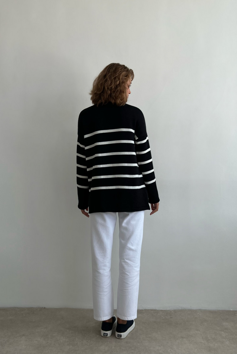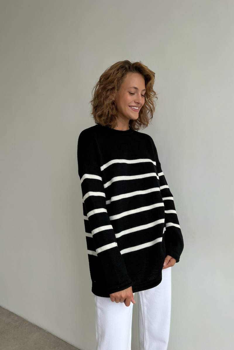 Свитер актуального свободного фасона oversize из шерсти с акрилом. Вырез горловины круглый, спущенное плечо.