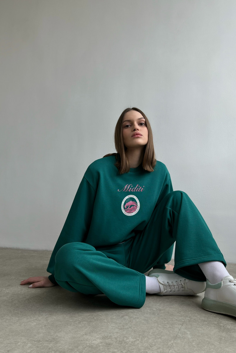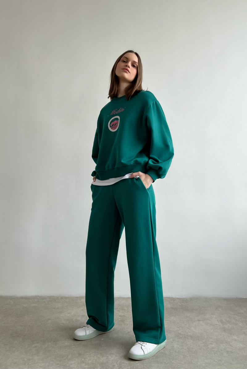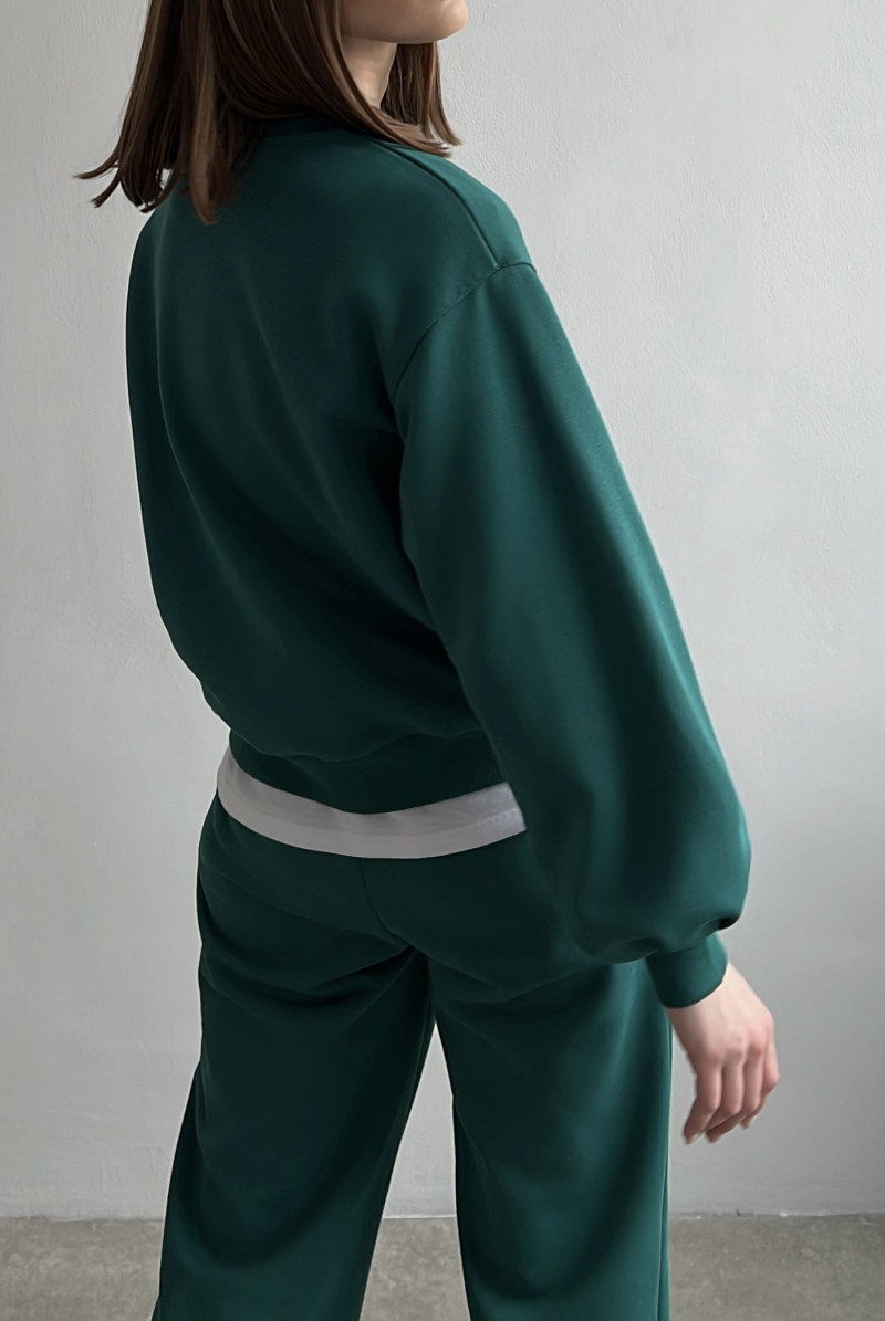Свитшот из футера свободного кроя со спущенной линией плеча. По низу изделия и по низу рукавов - манжет.