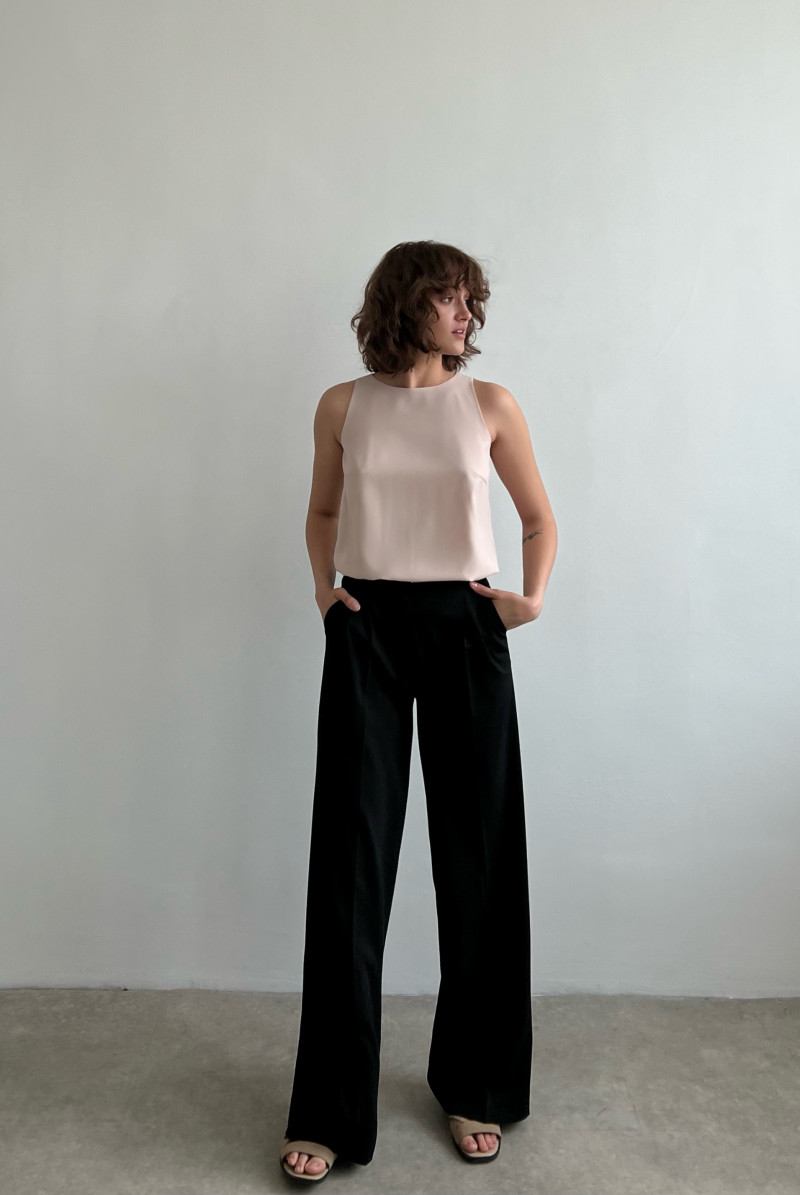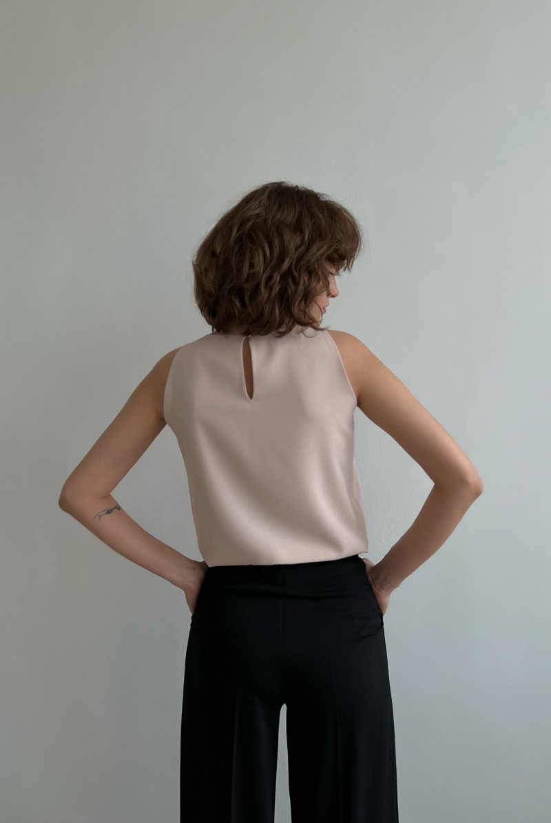 Топ без рукавов полуприлегающего силуэта, с небольшой ассиметрией по низу. Топ из тонкой ткани в два слоя. Вырез горловины "круглый", застежка "капелька" сзади на пуговку.