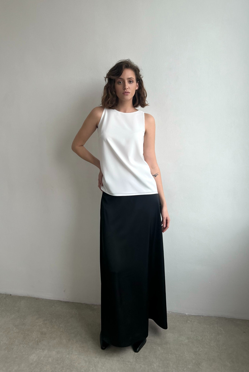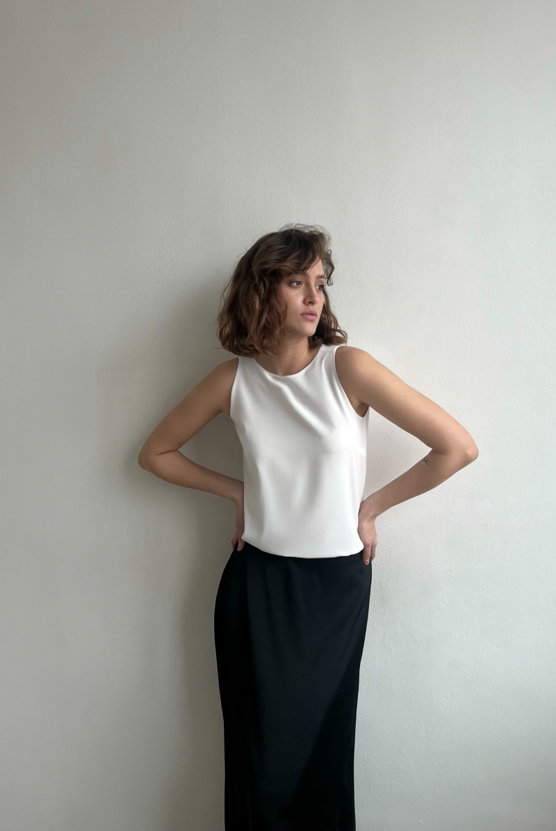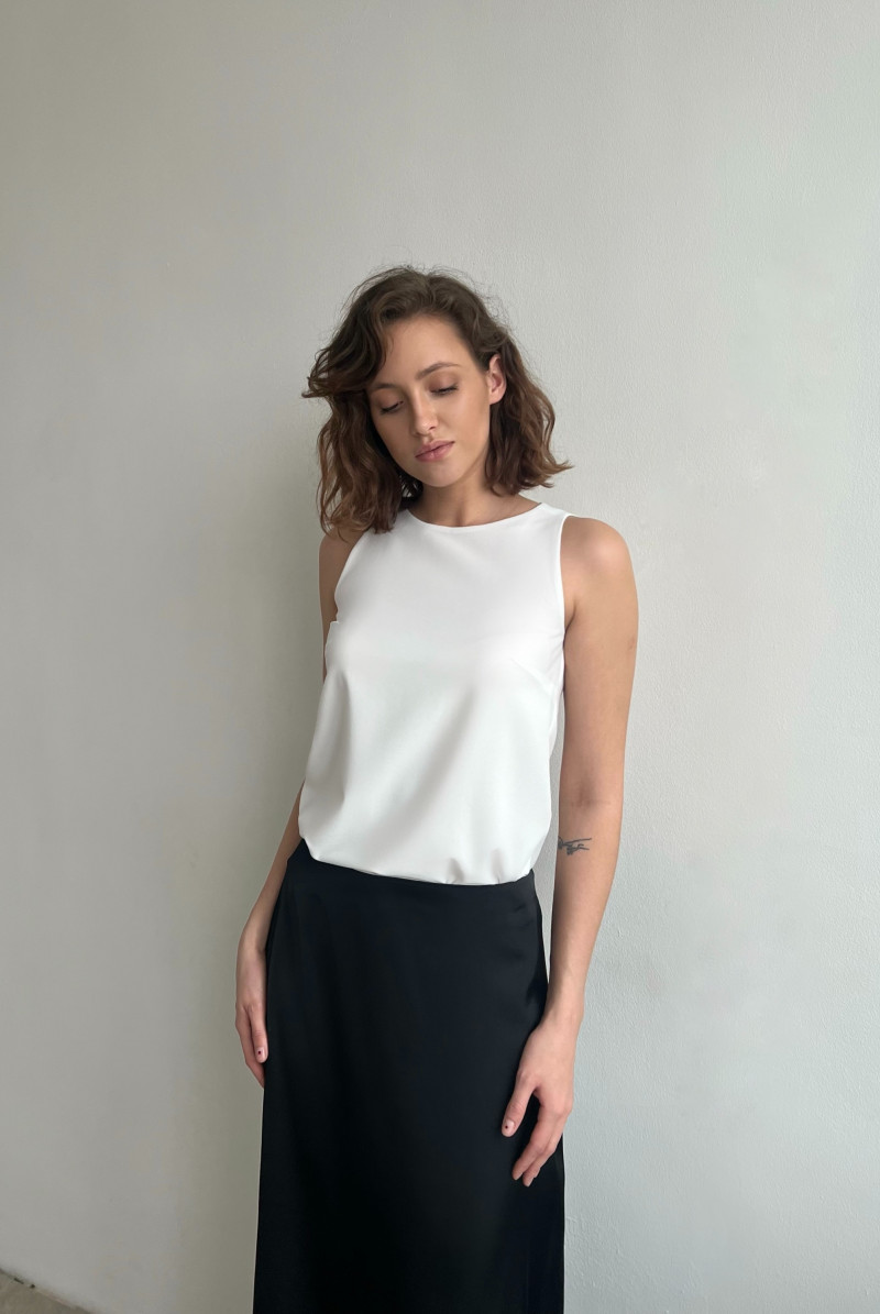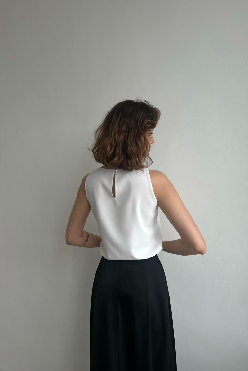 Топ без рукавов полуприлегающего силуэта, с небольшой ассиметрией по низу. Топ из тонкой ткани в два слоя. Вырез горловины "круглый", застежка "капелька" сзади на пуговку.