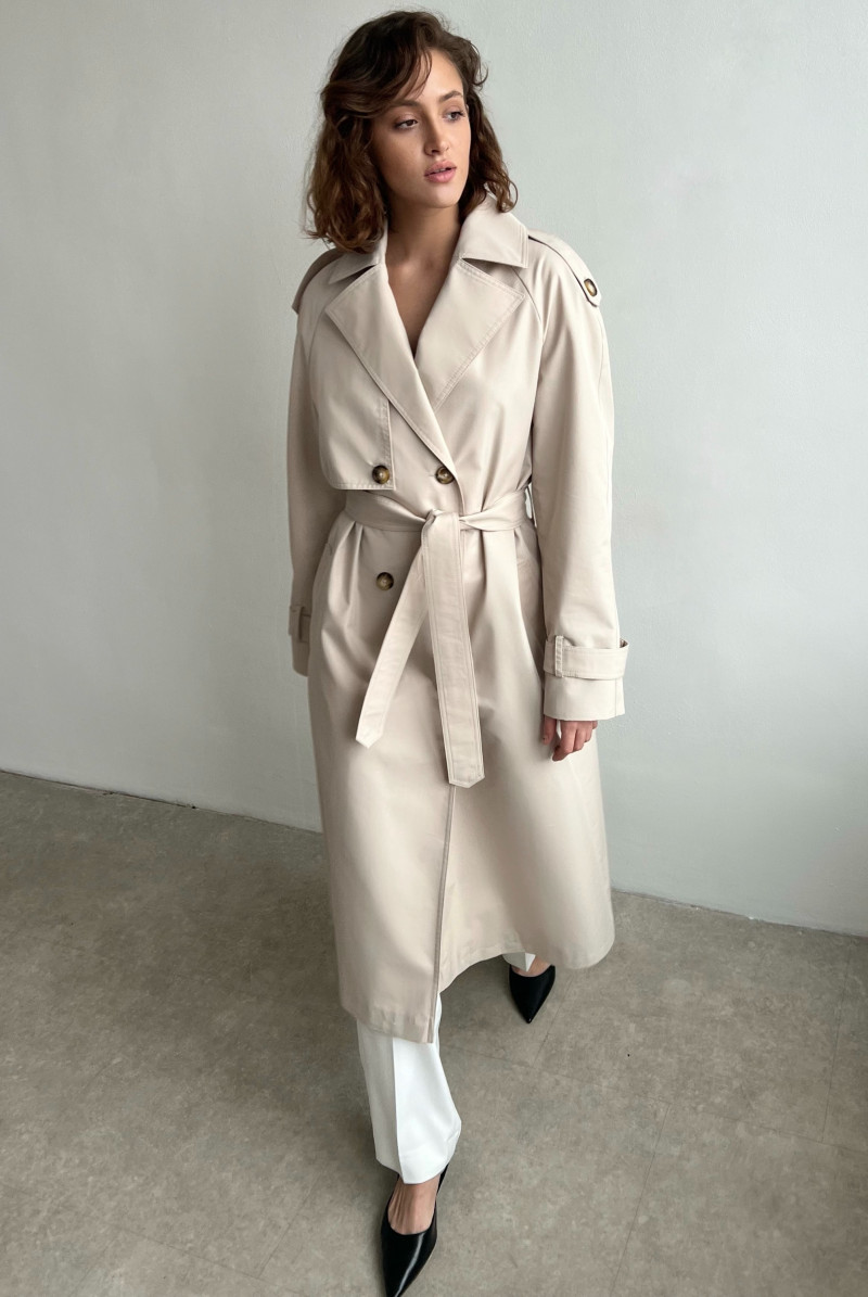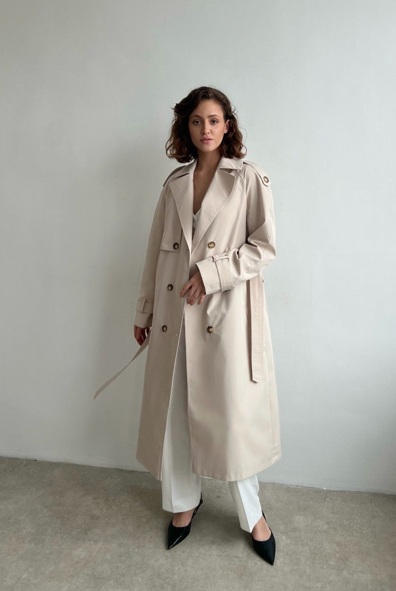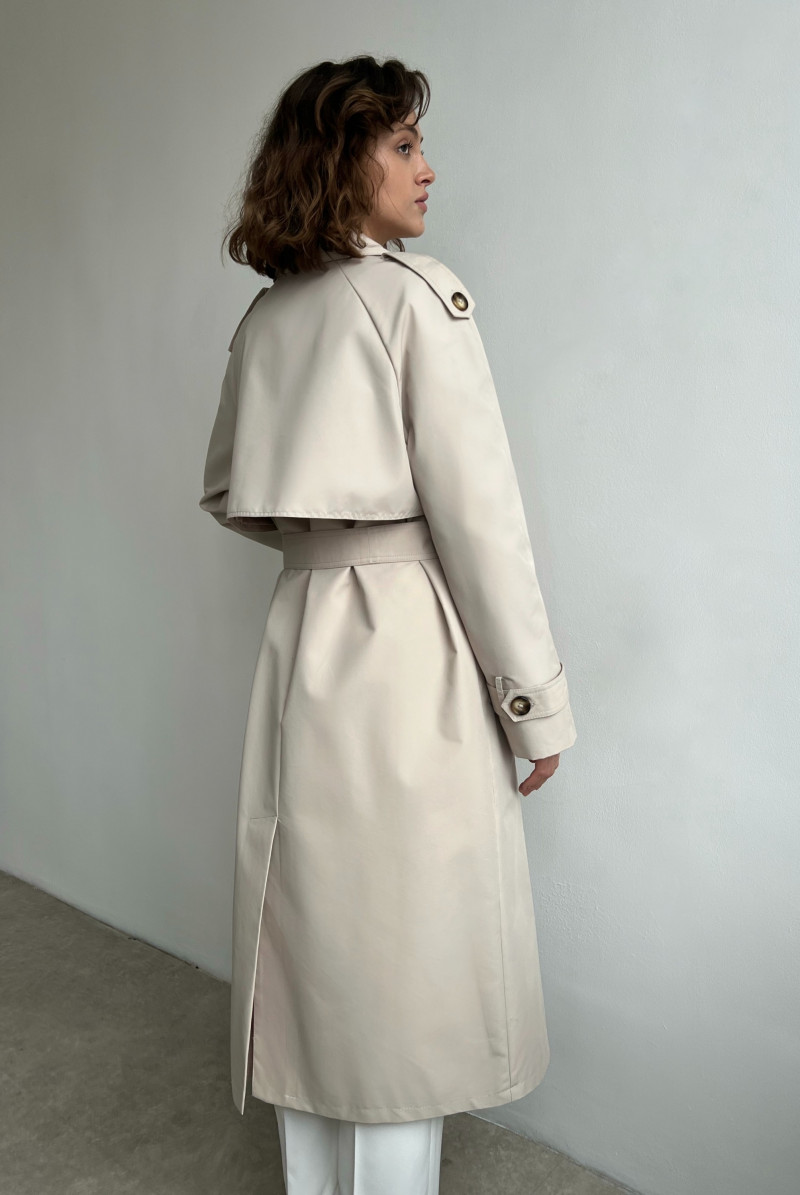 Тренч прямого кроя с поясом. Рукав - реглан с декоративной патой по низу рукава с фиксацией на пуговицу. На спинке отлетная кокетка и шлица. По переду слева декоративная кокетка с фиксацией на петлю и пуговицу. На плечевых швах погоны с пуговицей. Застёжка по переду на два ряда пуговиц. Воротник на стойке с лацканом.