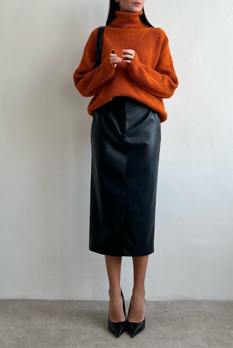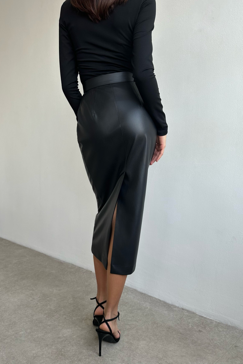 Юбка "караншаш" миди из эко-кожи. Спереди карманы и застежка "гульфик". В шве спинки шлица.