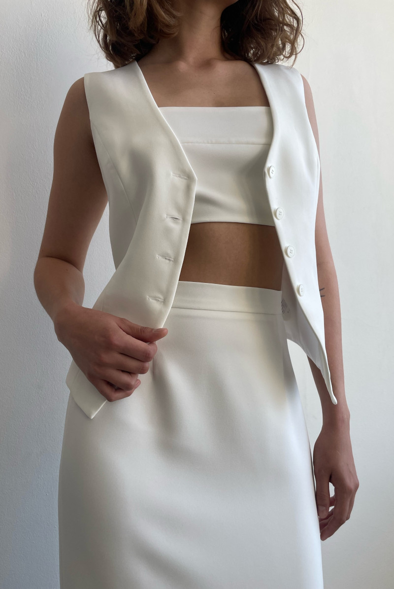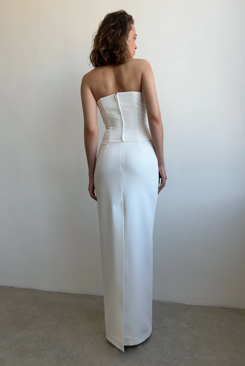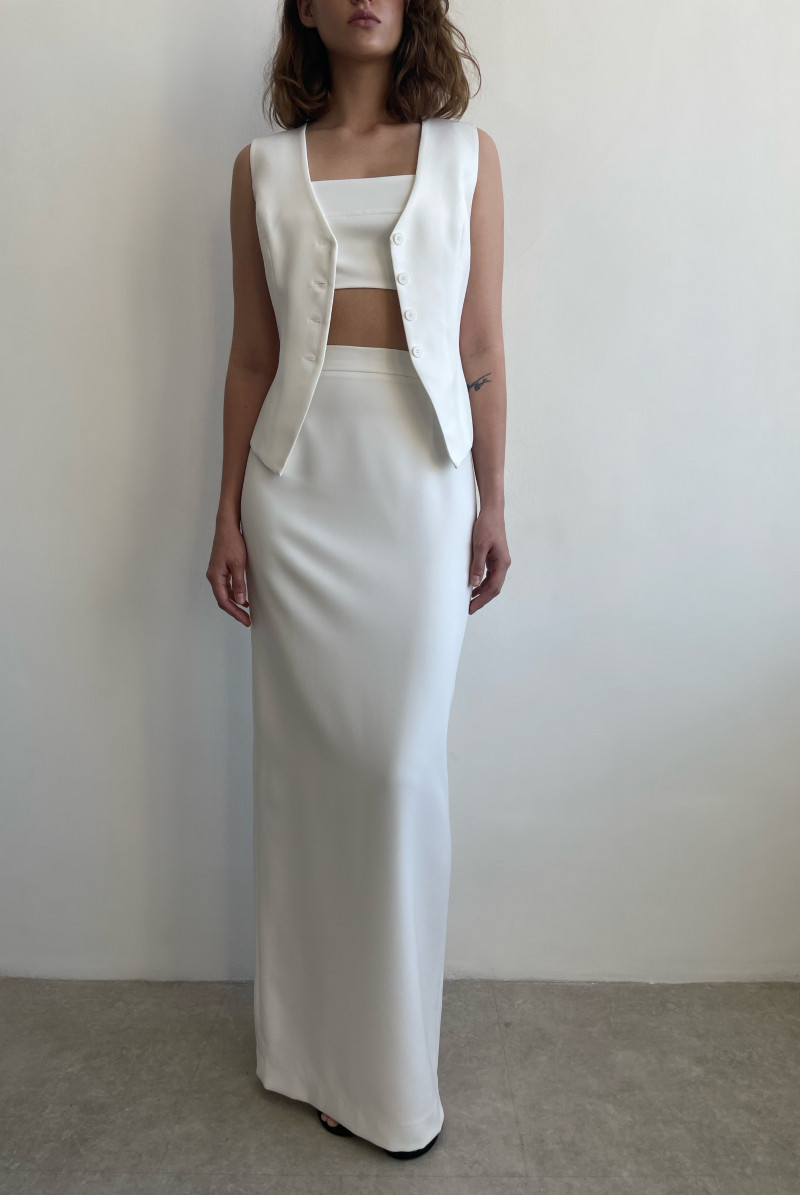 Юбка прямого силуэта, с небольшим заужением к низу, длиной "макси". Юбка на притачной подкладке. Посадка на талии. В среднем шве заднего полотнища расположена потайная застёжка молния и высокая шлица.
