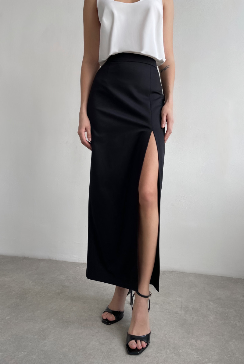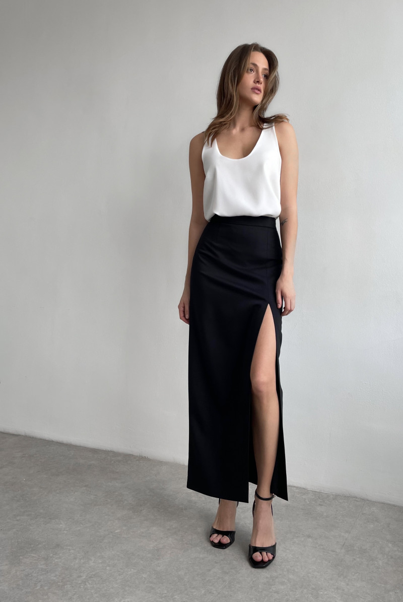 Длинная юбка, зауженная к низу. Высокий разрез слева на переднем полотнище. Молния слева. На подкладке.