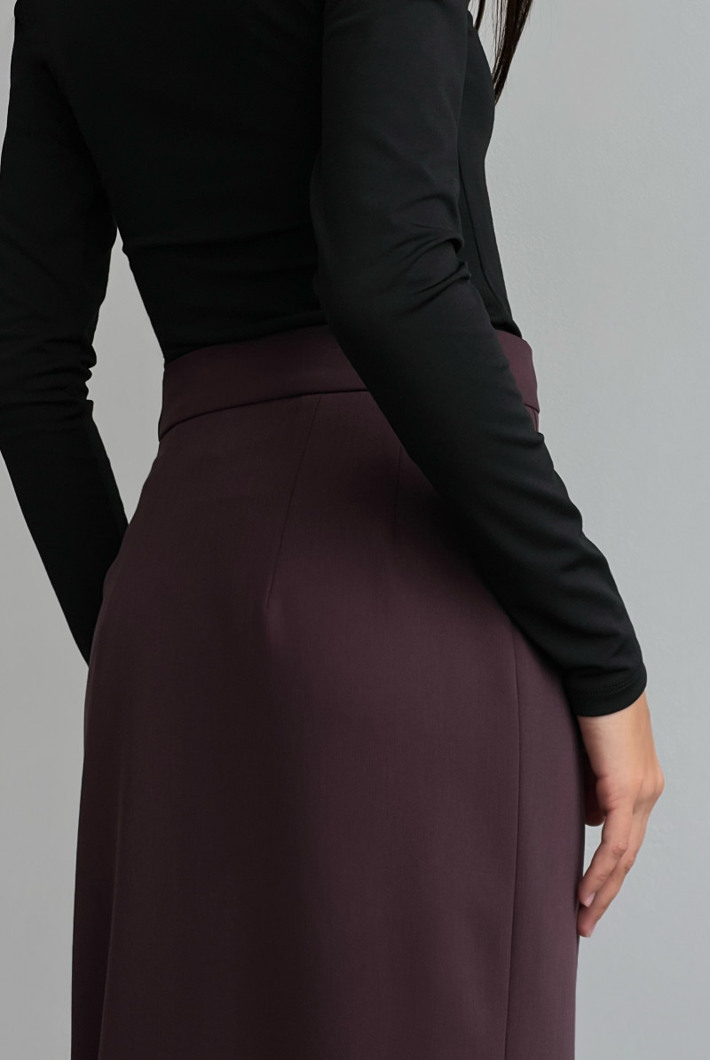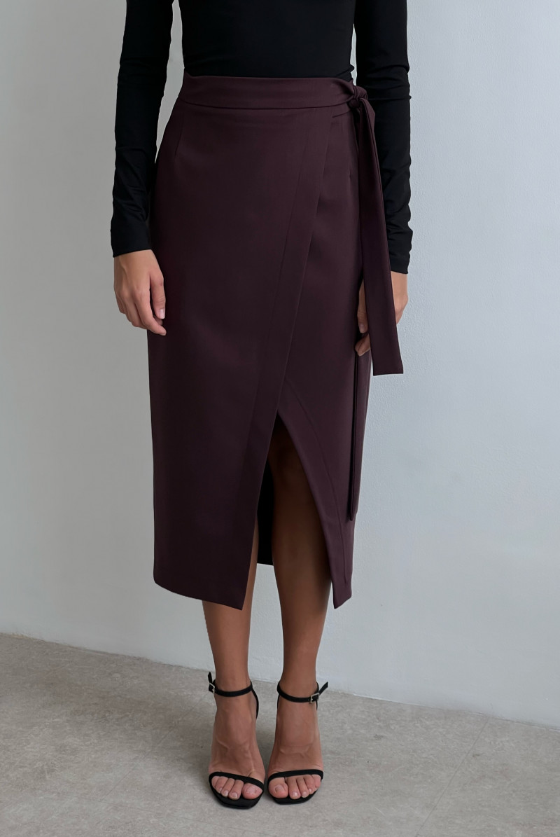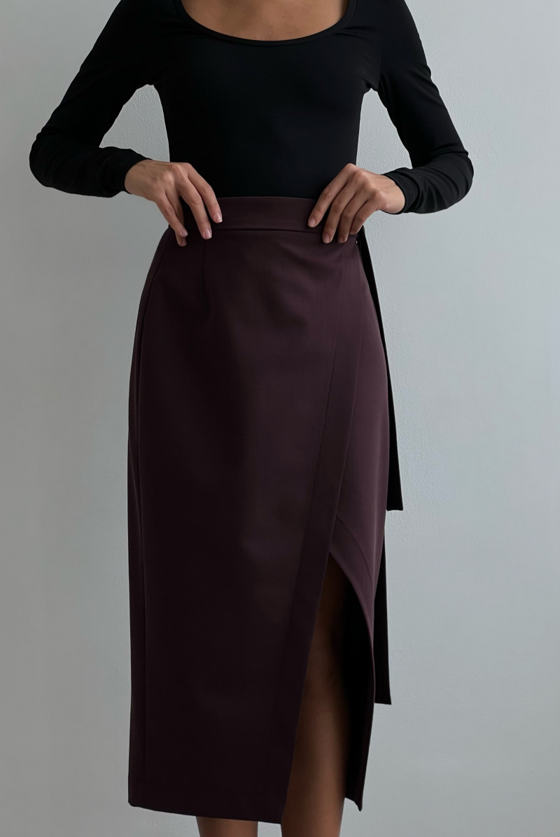 Юбка из костюмной ткани на запах, пояс внутри застёгивается на пуговицы, что позволяет регулировать размер талии. Спереди пояс завязывается.