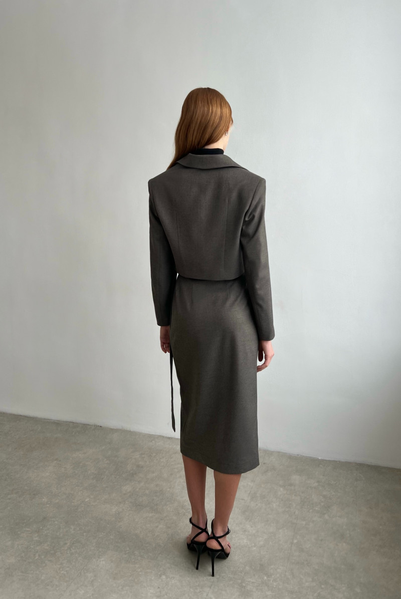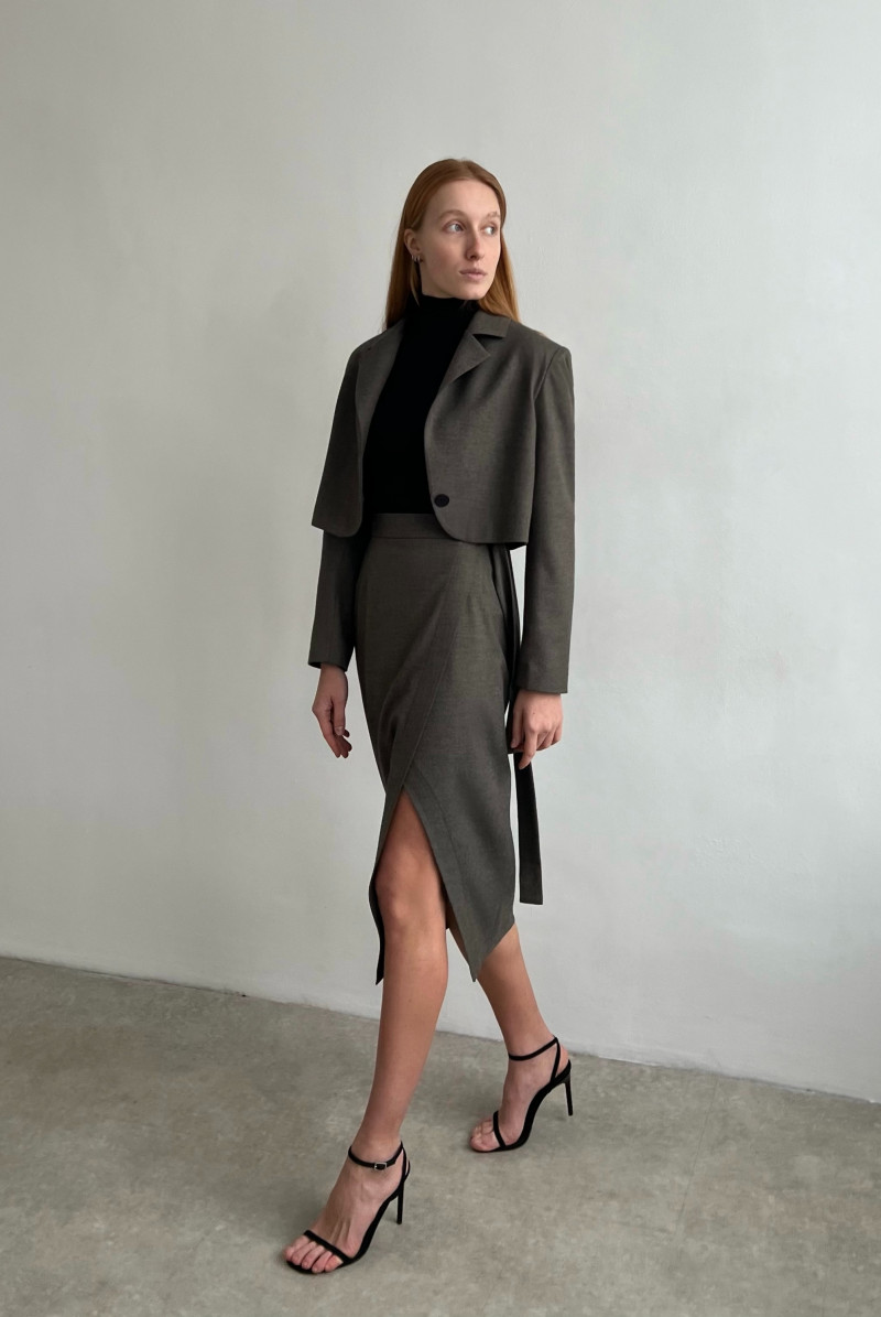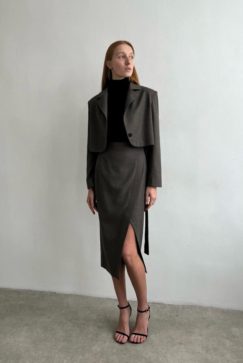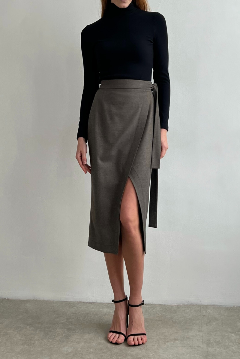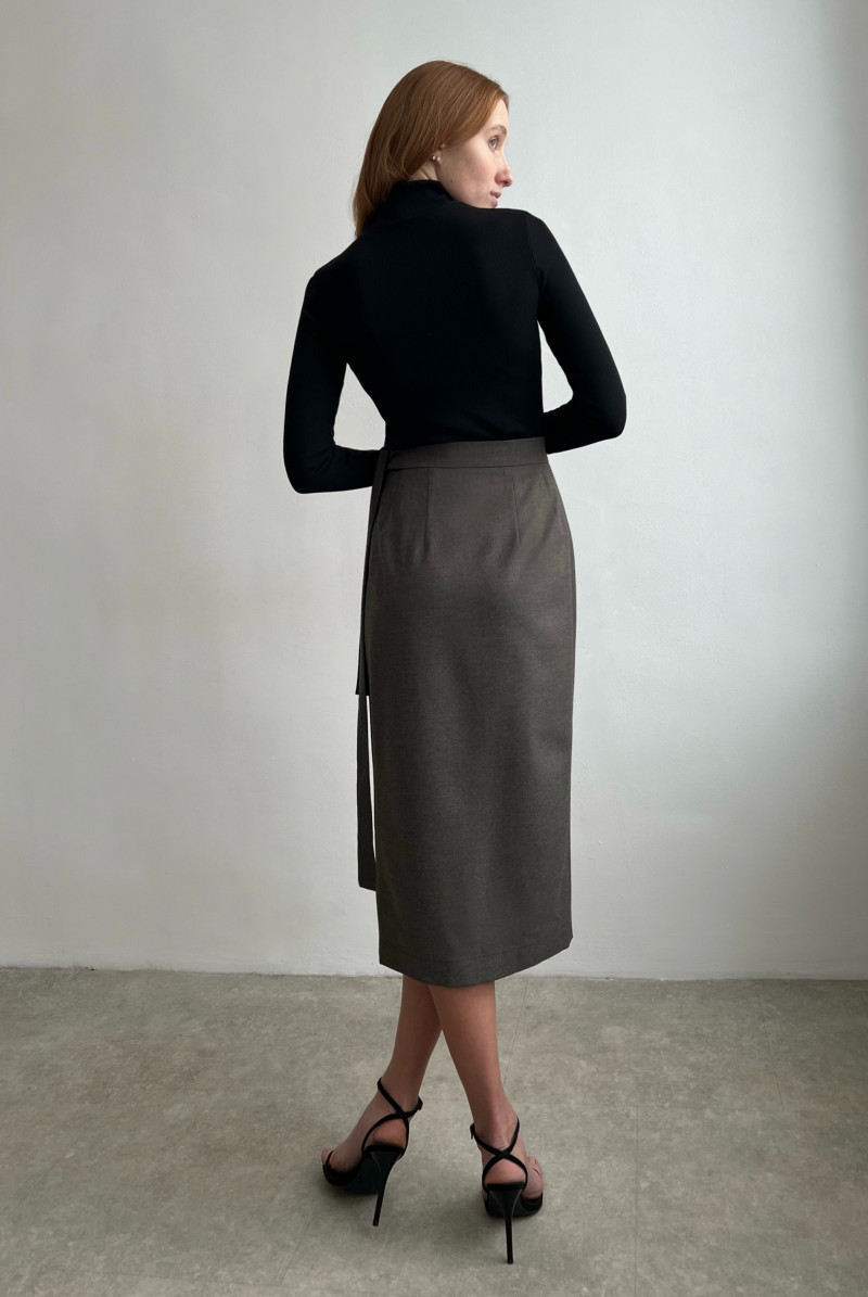 Юбка из костюмной ткани на запах, пояс внутри застёгивается на пуговицы, что позволяет регулировать размер талии. Спереди пояс завязывается.