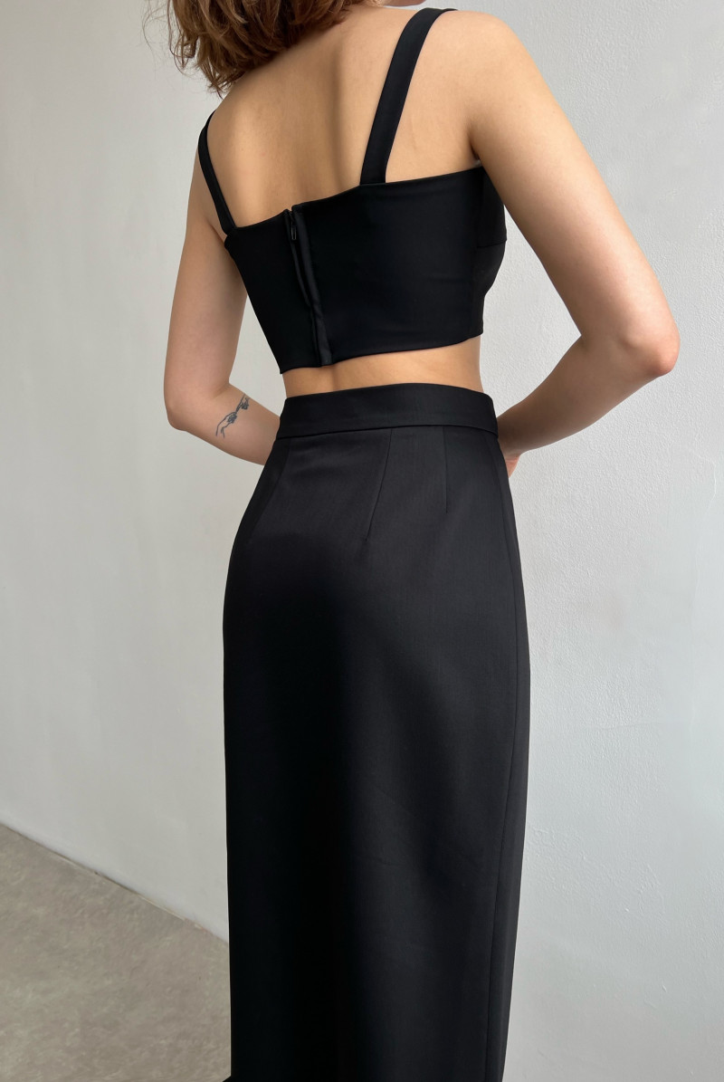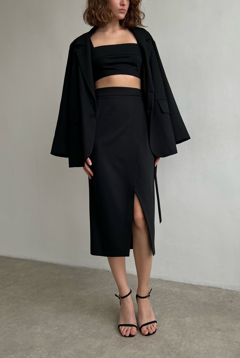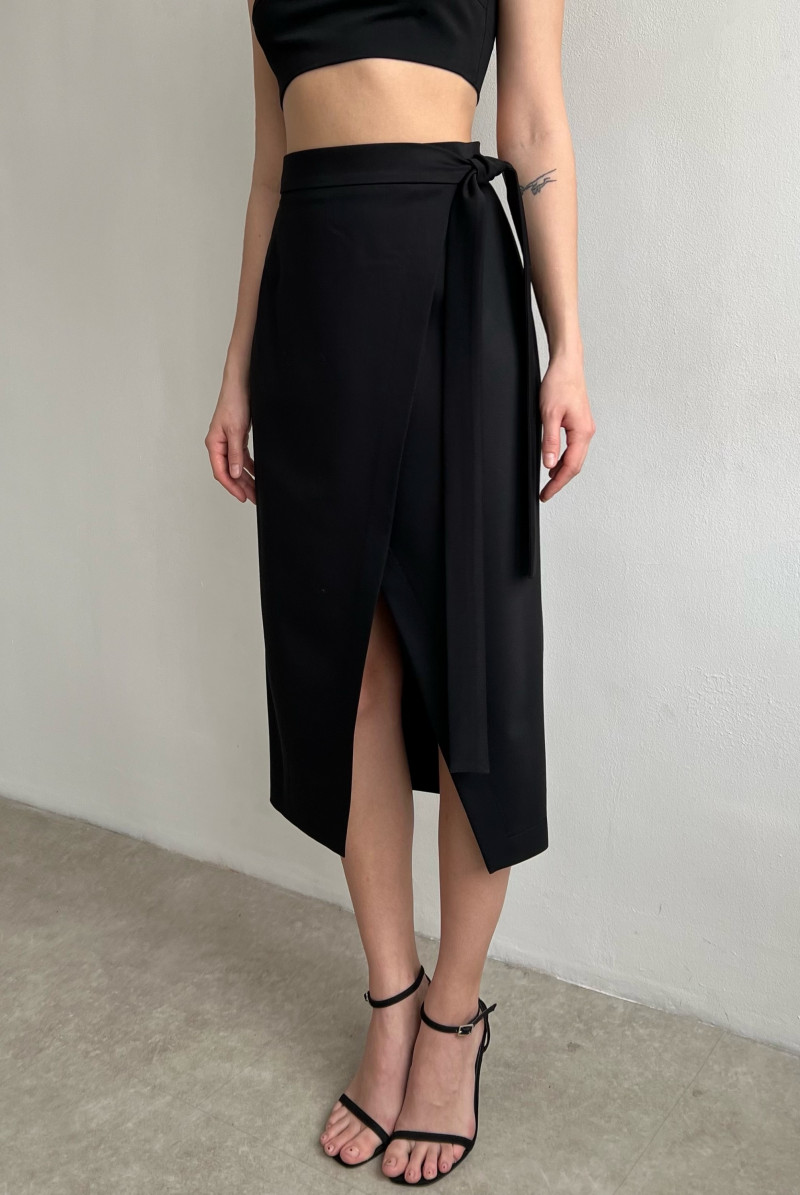 Юбка в длине миди, на "запах" фиксирующийся на пуговицы и петли на поясе. Юбка "карандаш", зауженная к низу.