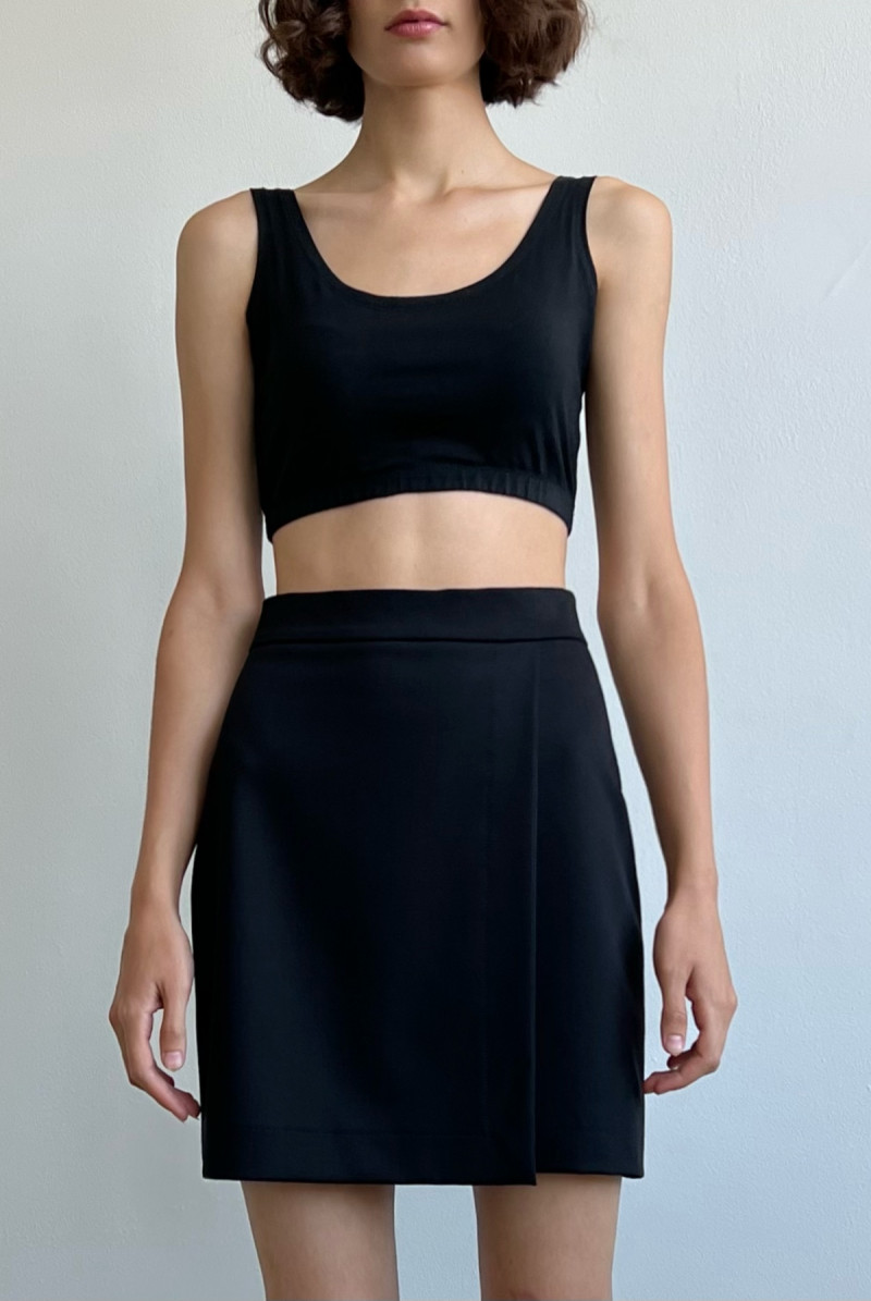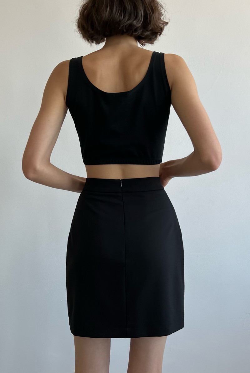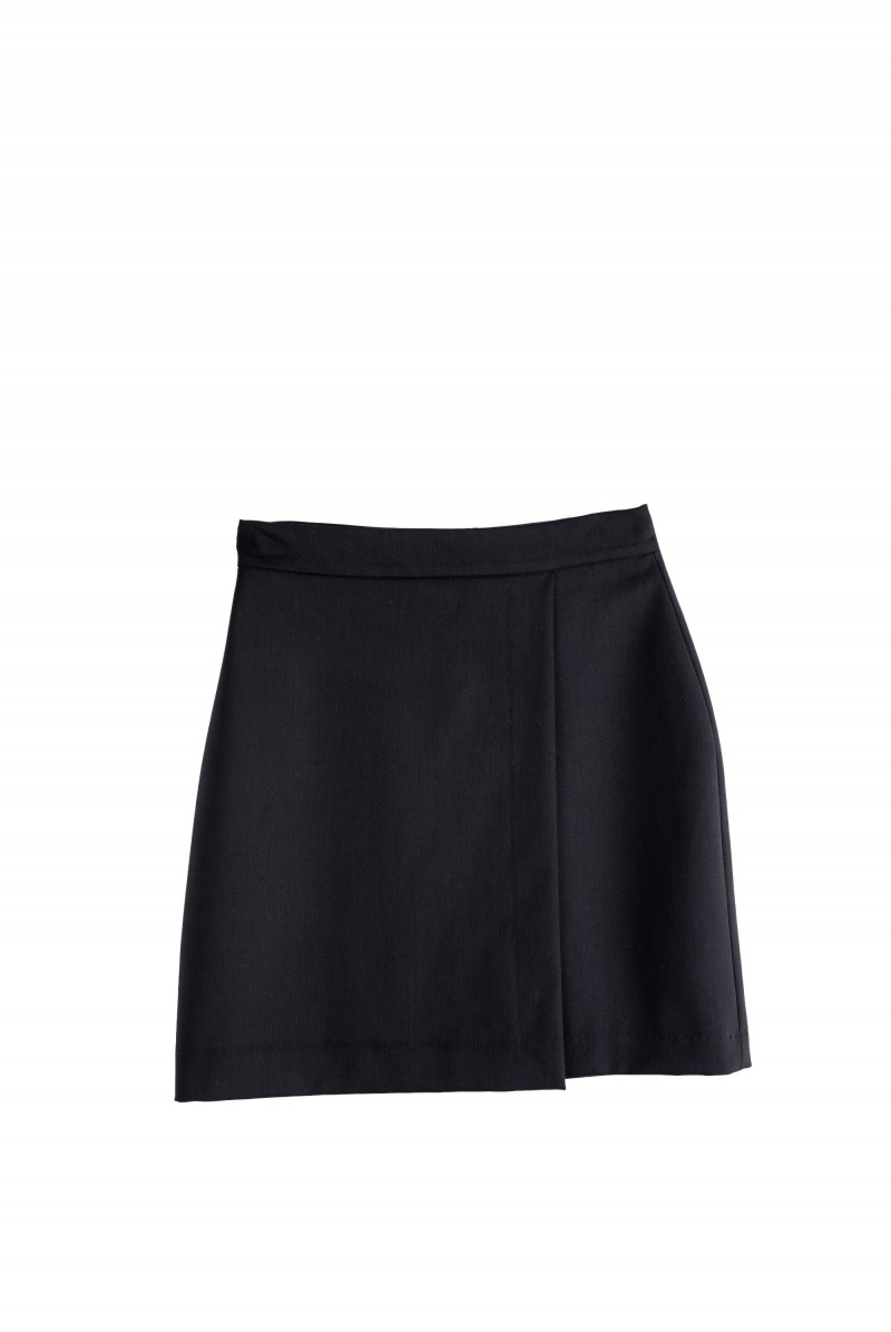 Юбка прямого силуэта на подкладе, спереди имитация запаха. Пояс шириной 4 см, застежка на потайную молнию сзади.