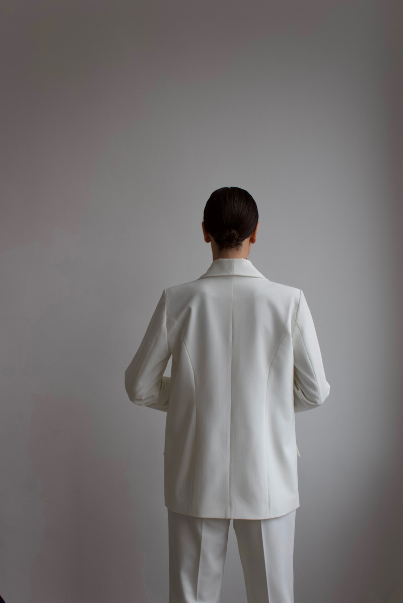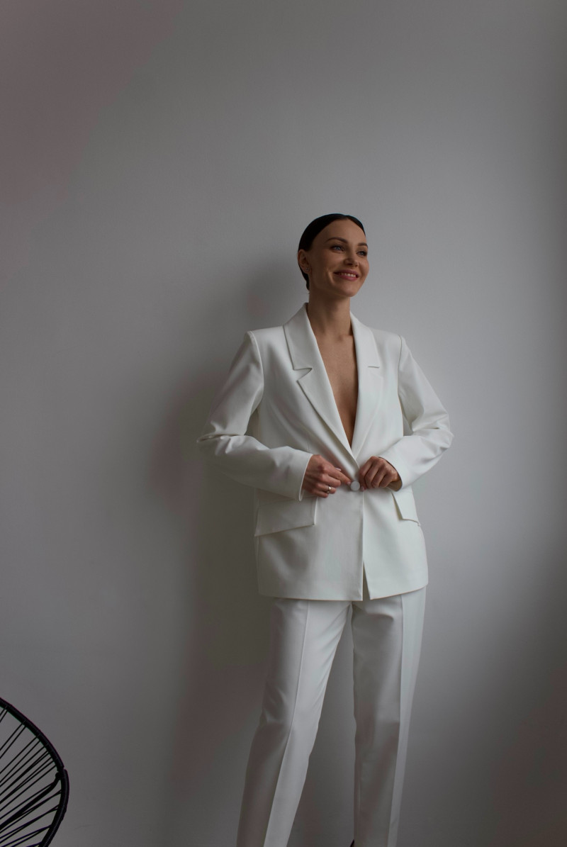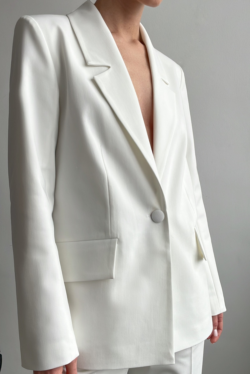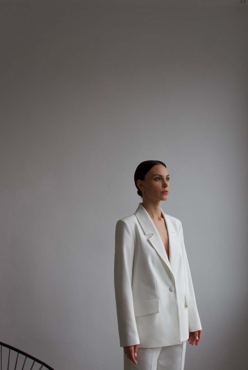 Жакет из костюмной ткани прямого силуэта с английским воротником, центральной застежкой на 1 пуговицу. Карманы с клапаном. Рукав длинный двухшовный.
