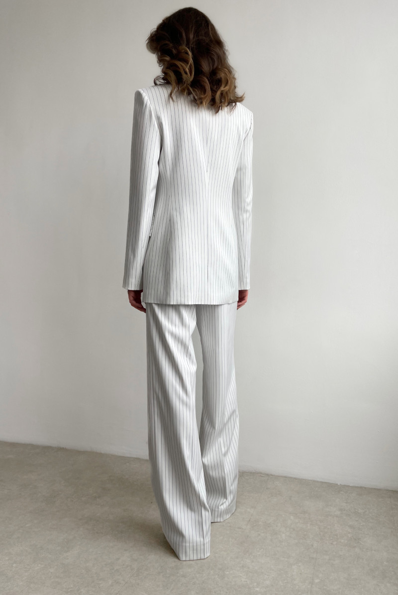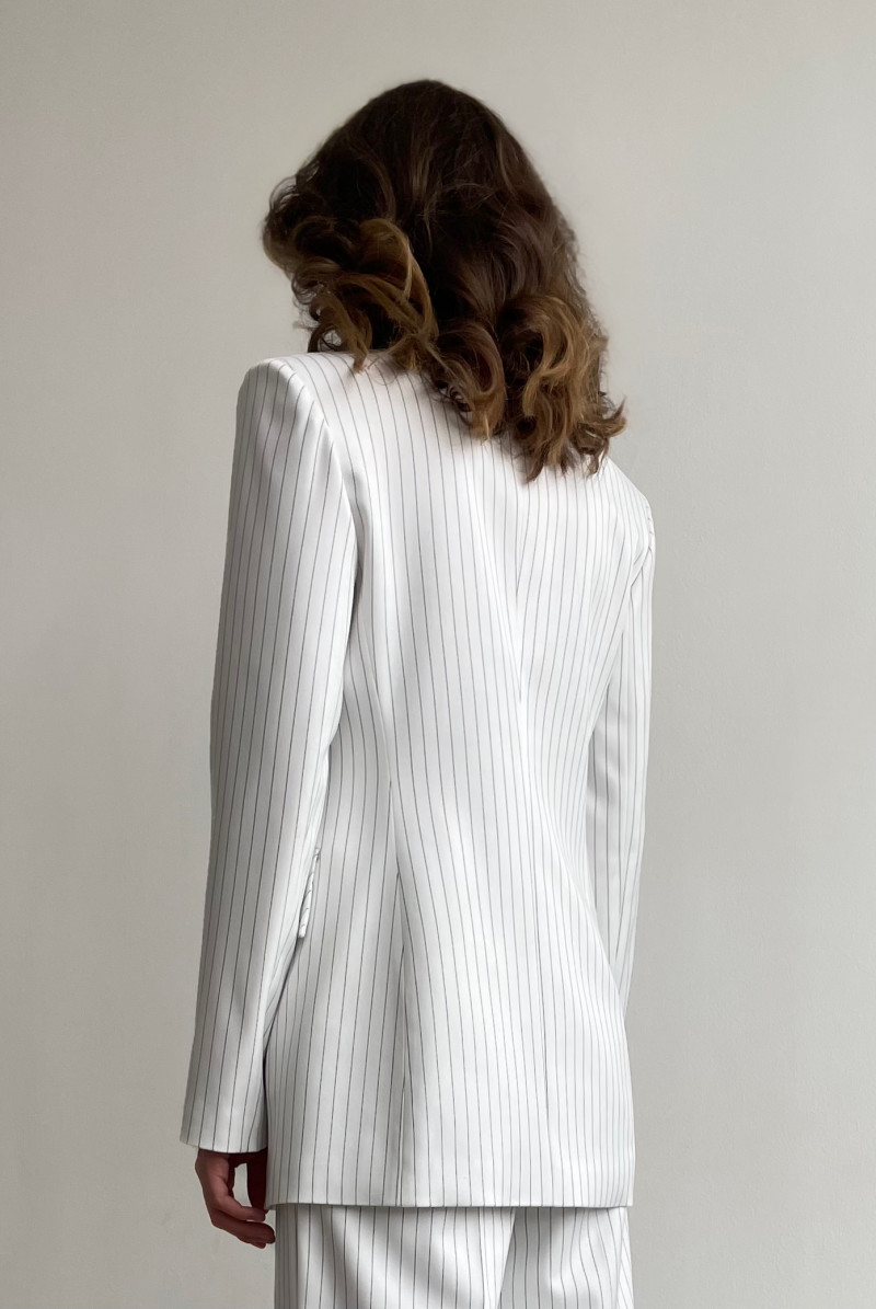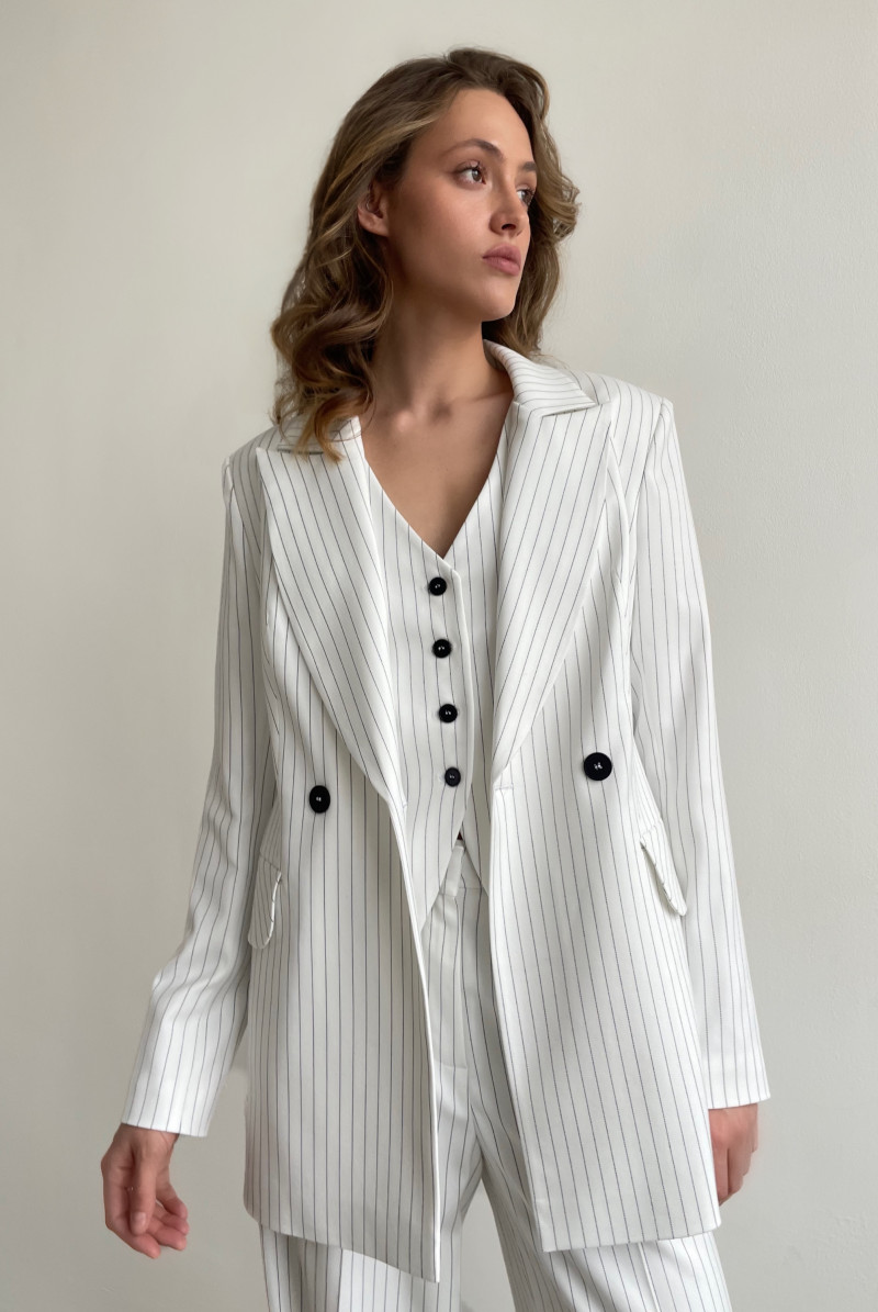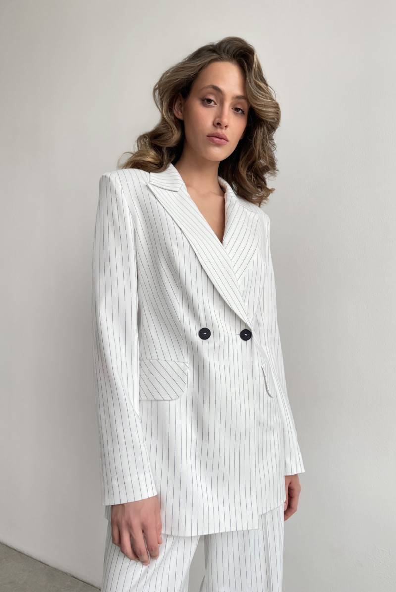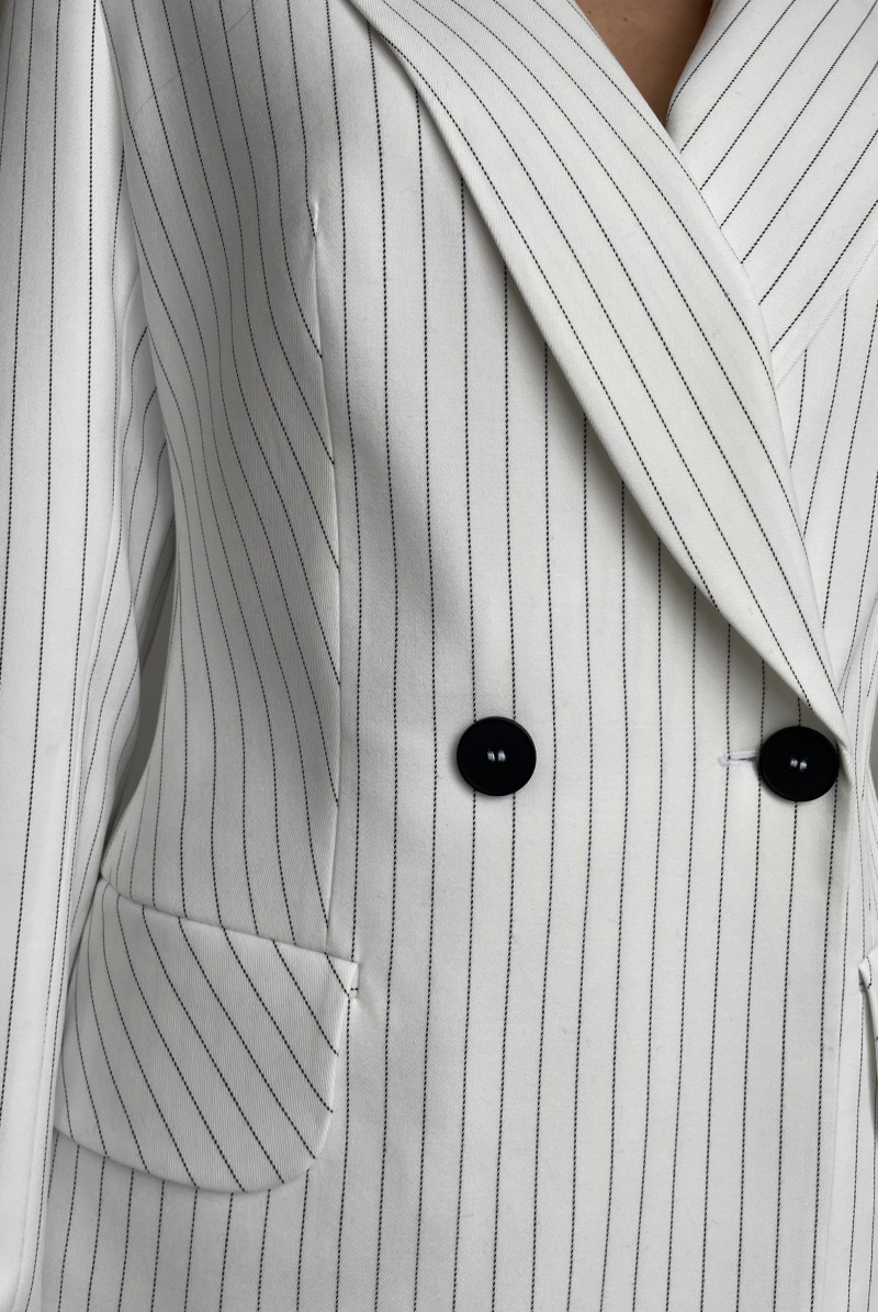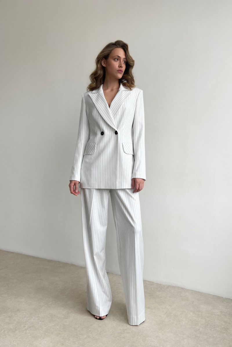 Двубортный жакет полуприлегающего силуэта с английским воротником. Рукав длинный. Карманы прорезные с клапанами.